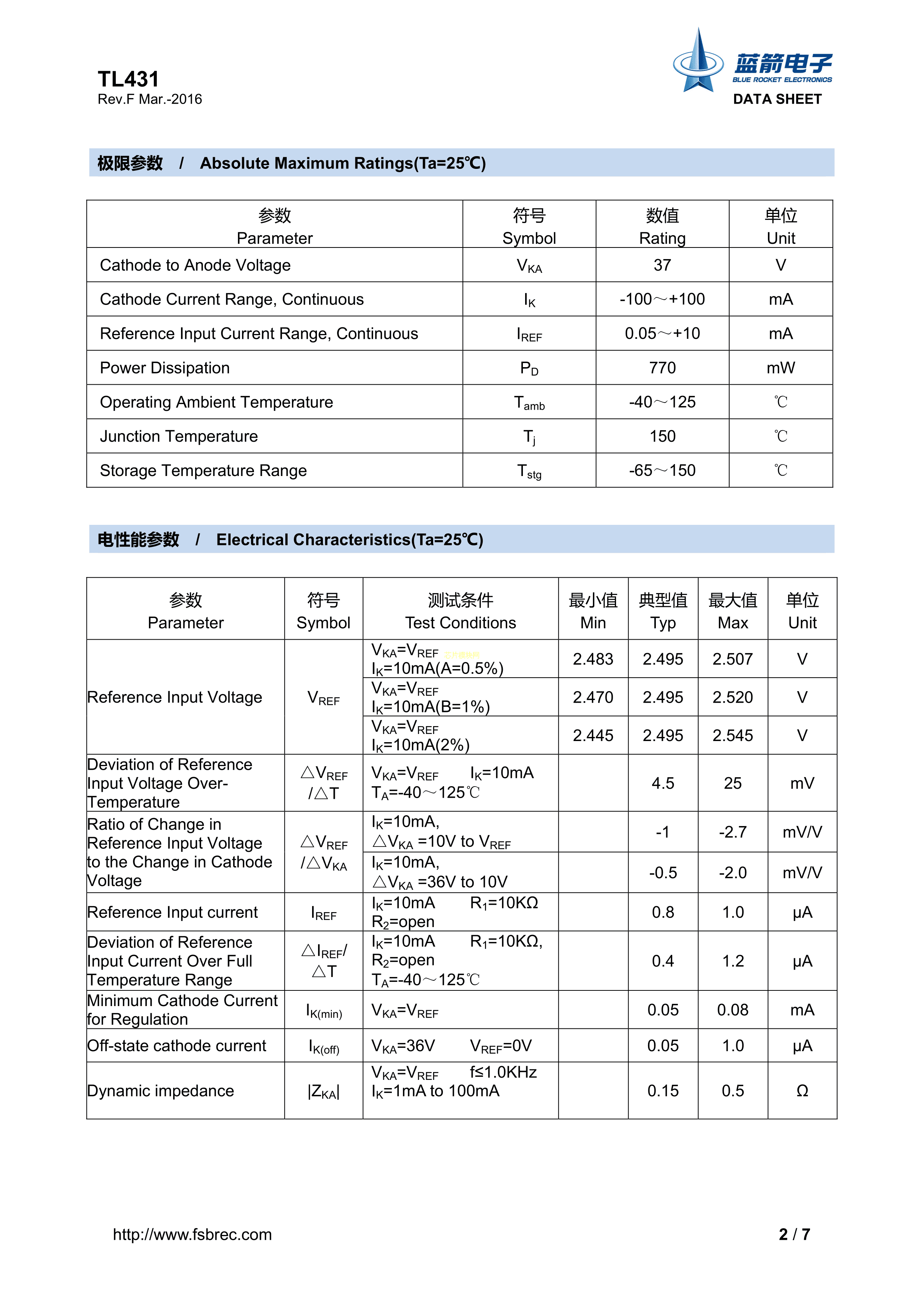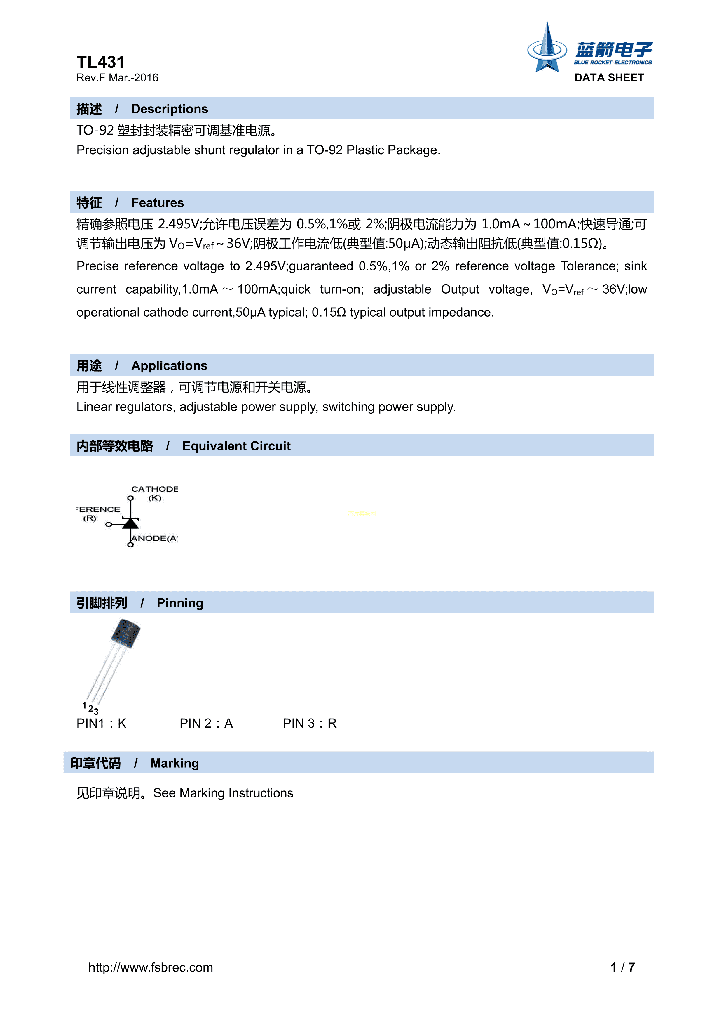 TL431-A数据手册TO-92封装BLUE ROCKET(蓝箭)PDF规格书,中英文下载