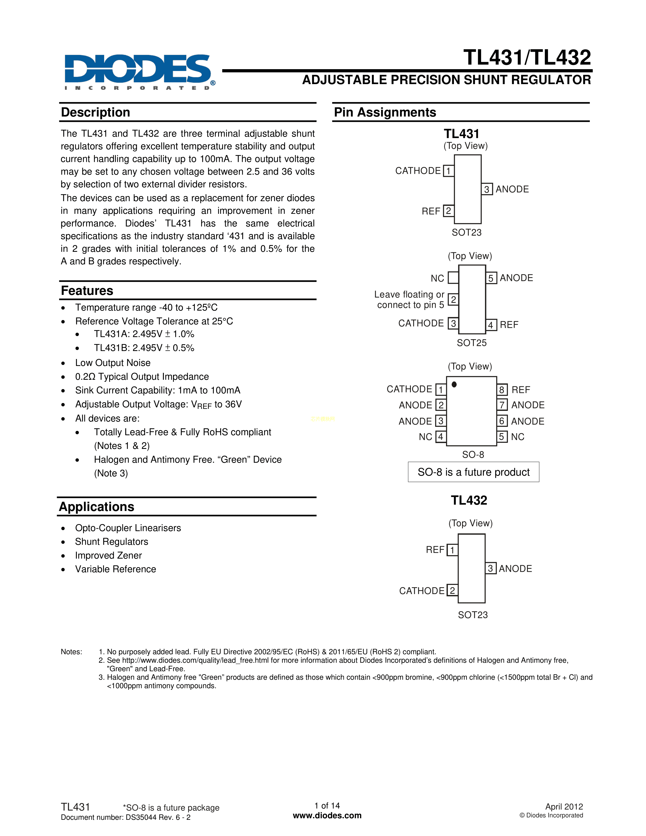 TL431BSA-7数据手册SOT-23(SOT-23-3)封装DIODES(美台)PDF规格书,中