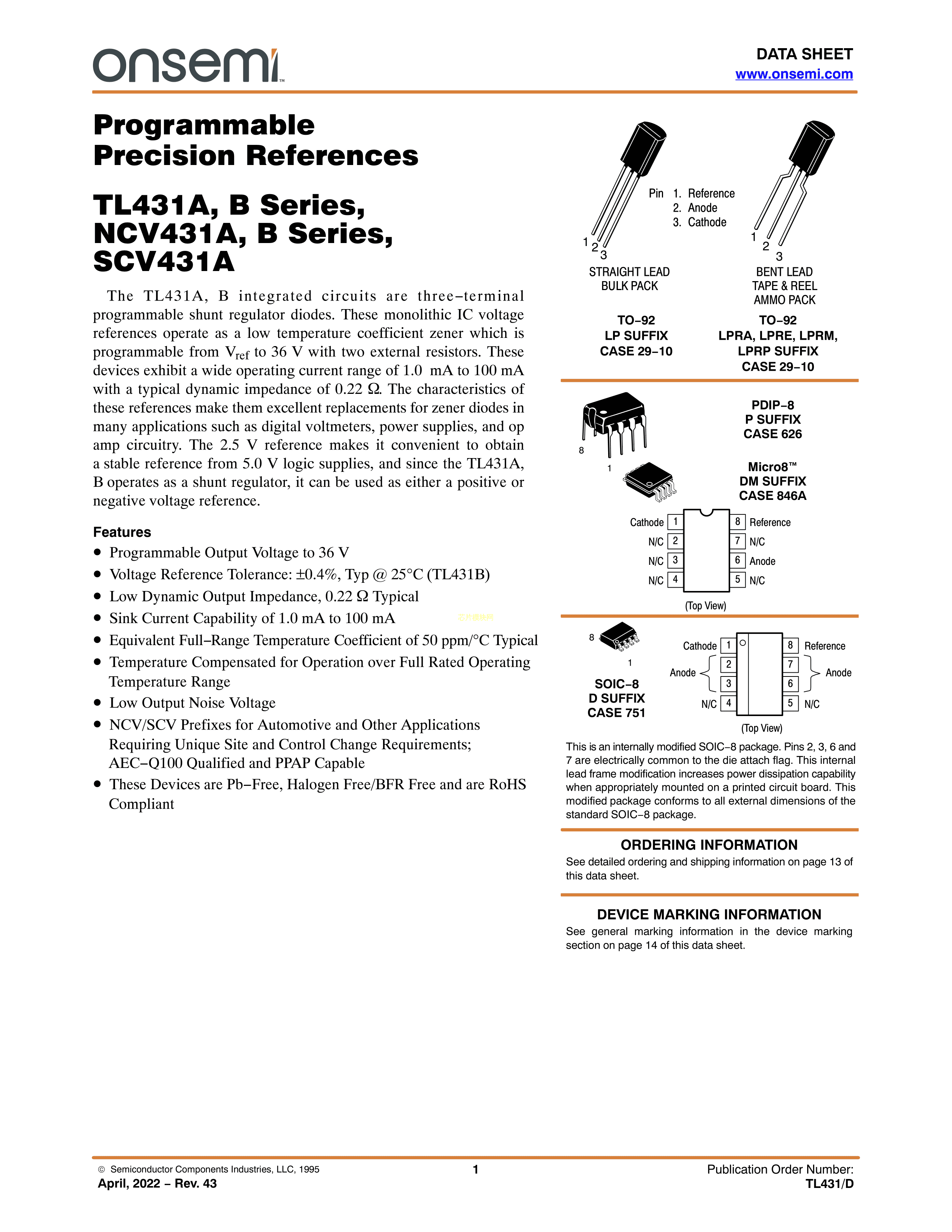 TL431IDR2G数据手册SOIC-8封装onsemi(安森美)PDF规格书,中英文下载