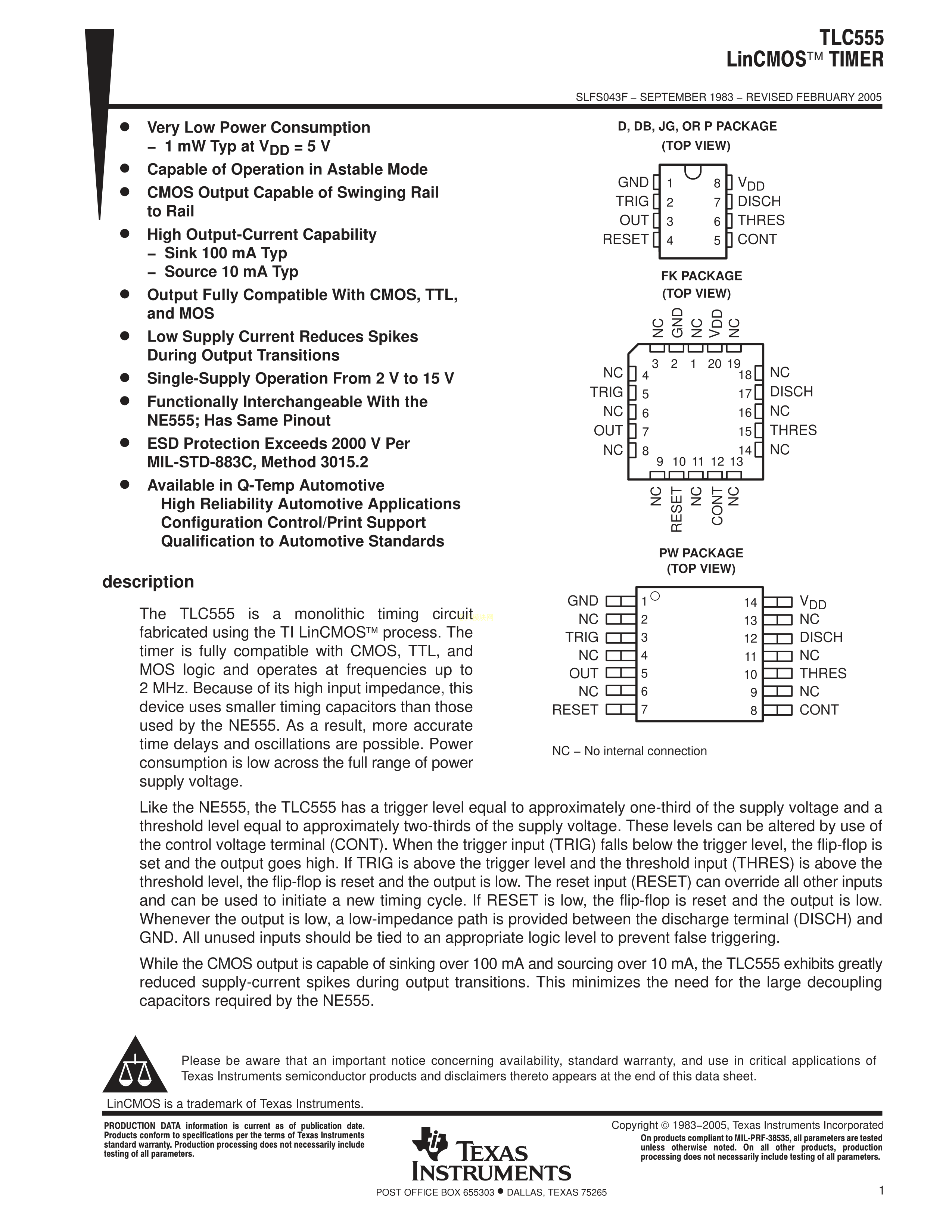TLC555IDR数据手册SOIC-8_150mil封装TI(德州仪器)PDF规格书,中英文下载