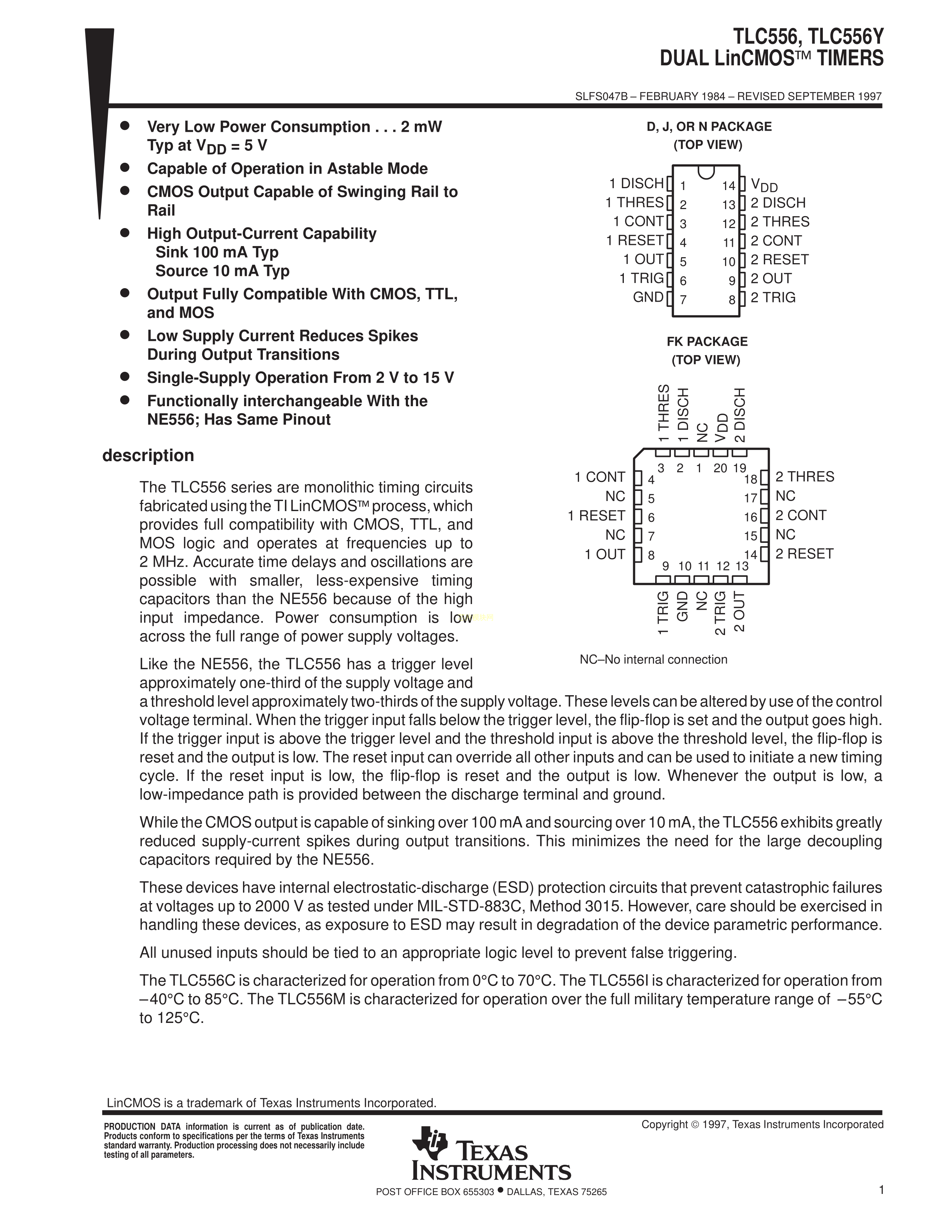 TLC556IN数据手册DIP-14封装TI(德州仪器)PDF规格书,中英文下载