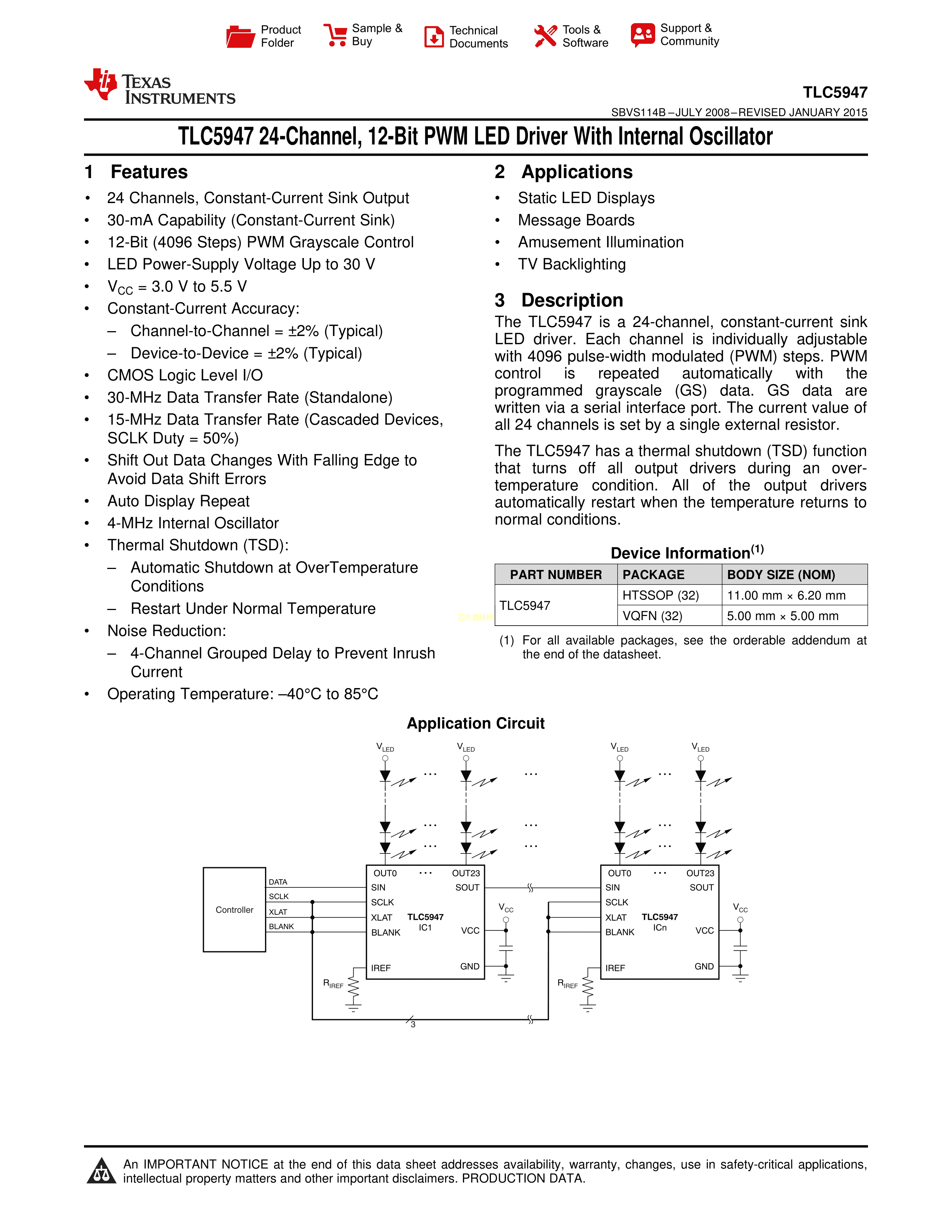 TLC5947RHBT数据手册VQFN-32封装TI(德州仪器)PDF规格书,中英文下载