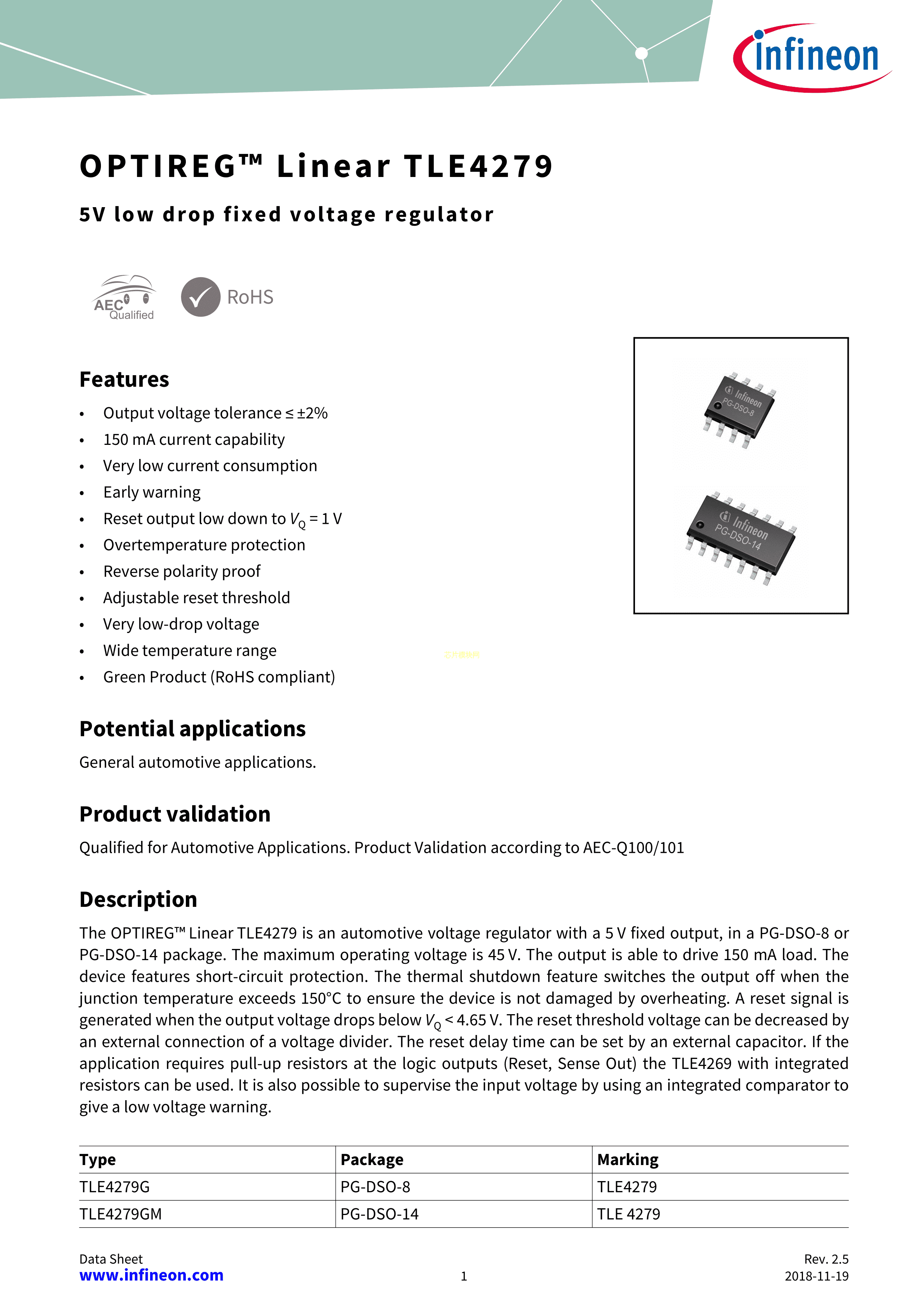 TLE4279G数据手册PG-DSO-8封装Infineon(英飞凌)PDF规格书,中英文下载