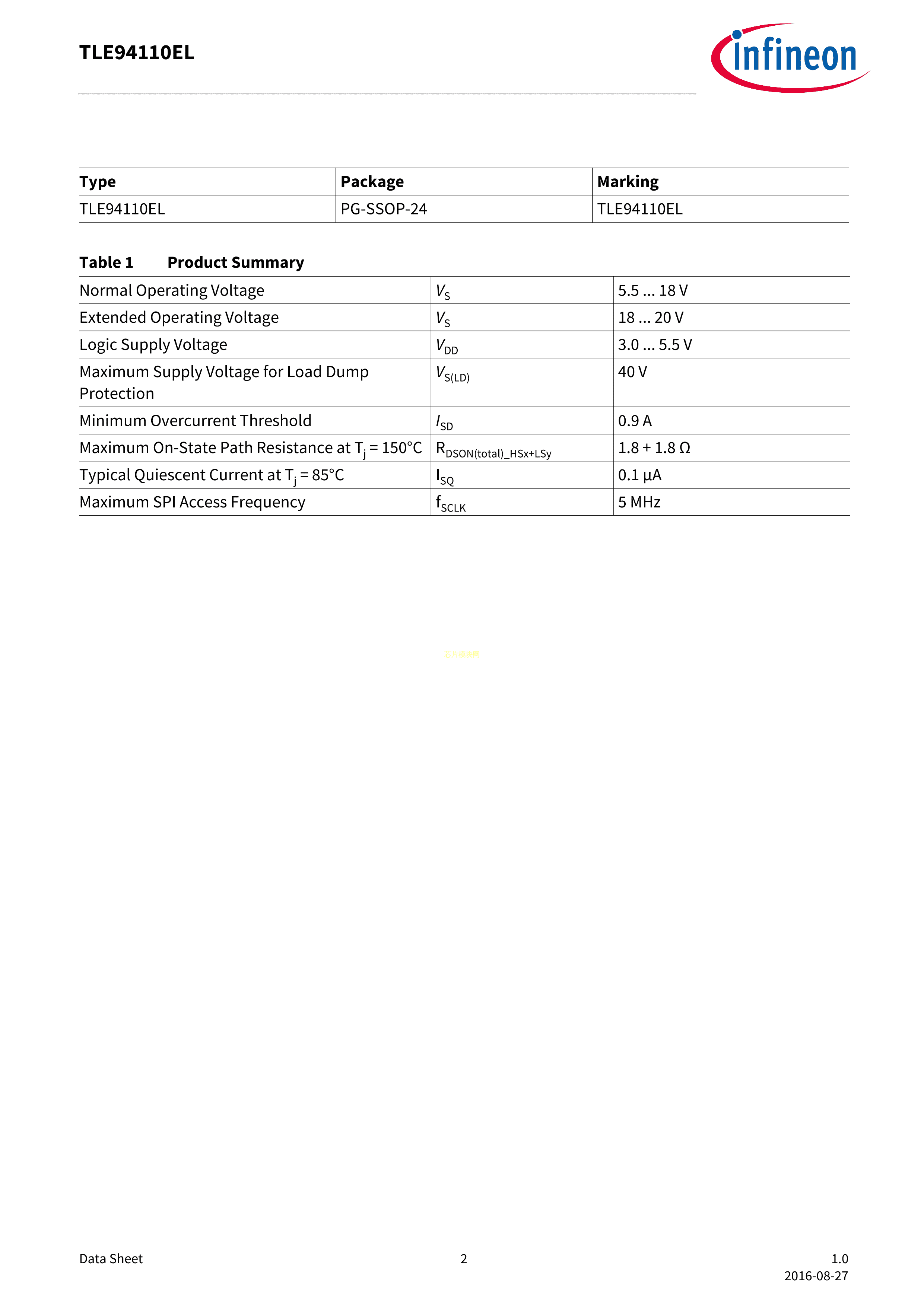 TLE94110ELXUMA1数据手册PG-SSOP-24-4封装Infineon(英飞凌)PDF规