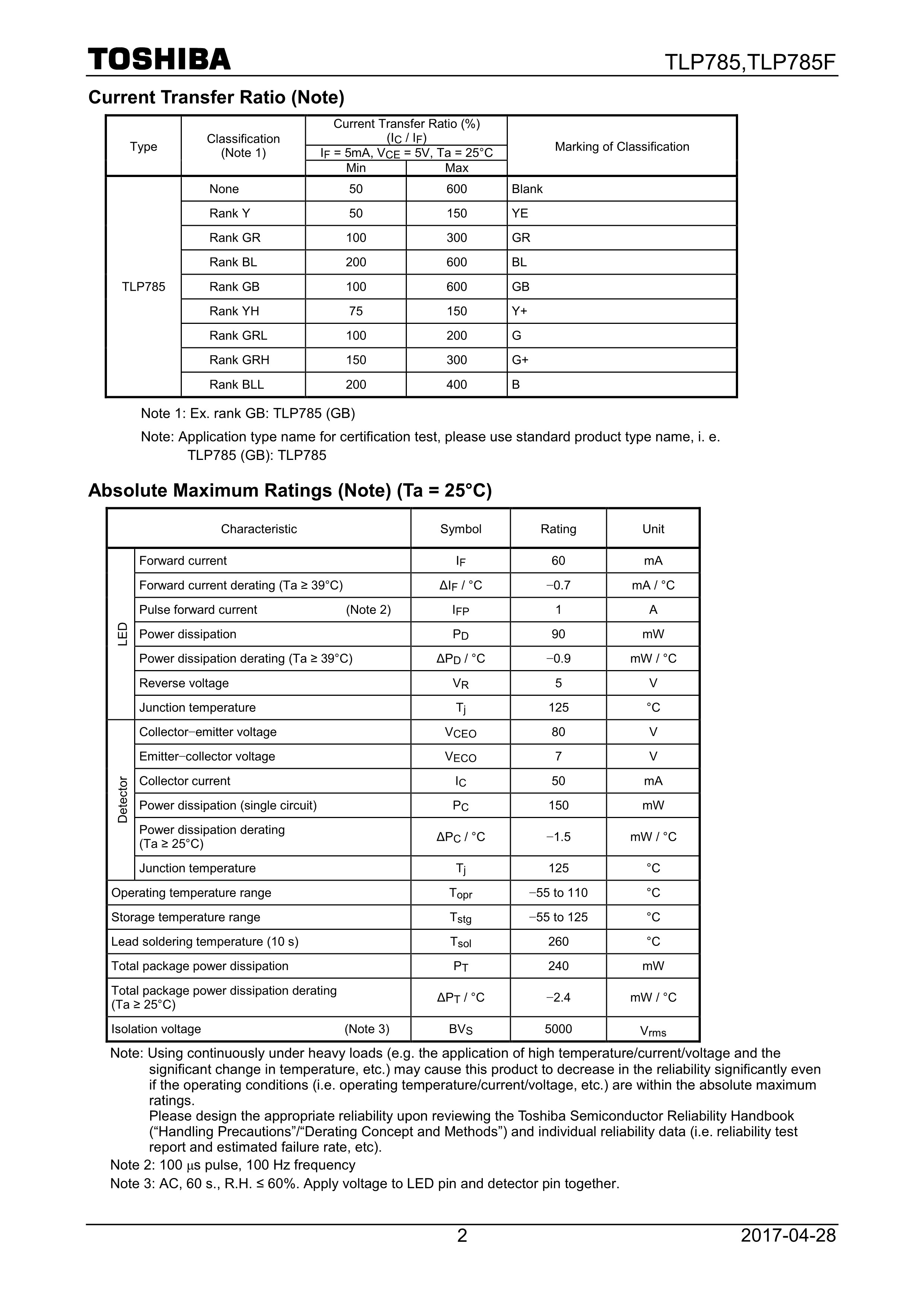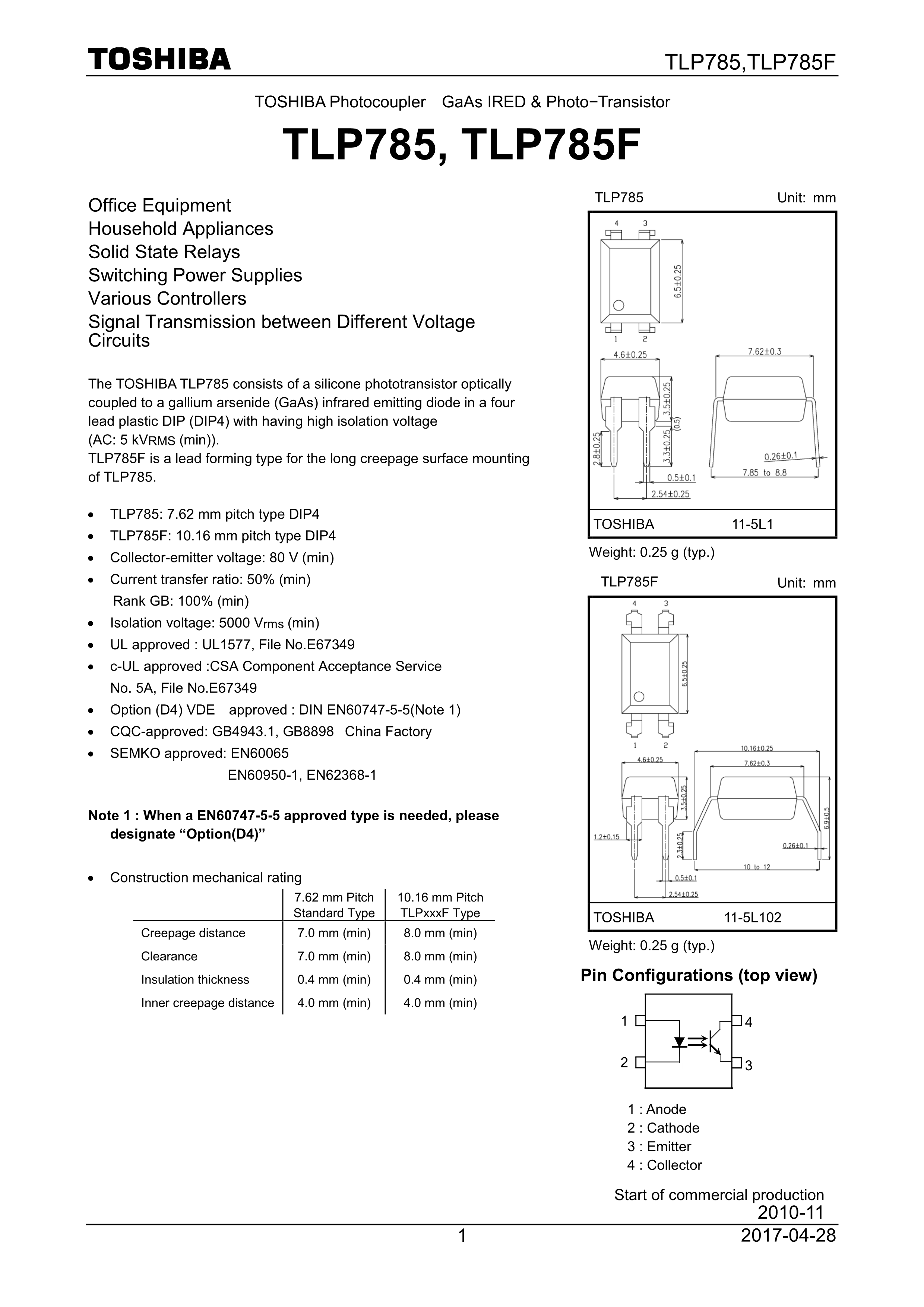 TLP785(GR-TP6F)数据手册SMD-4封装TOSHIBA(东芝)PDF规格书,中英文下载