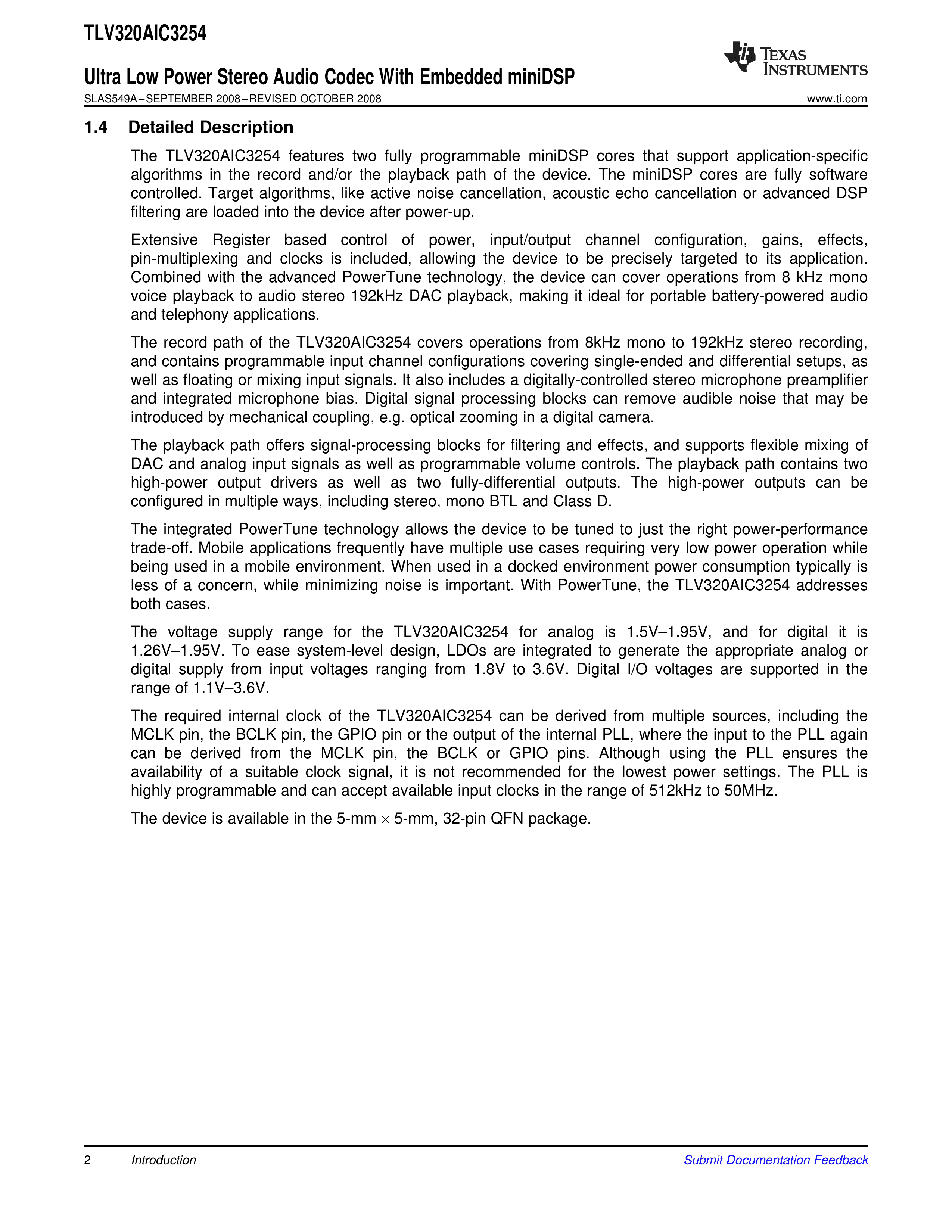 TLV320AIC3254IRHBR数据手册QFN32_5X5X05P封装TI(德州仪器)PDF规格