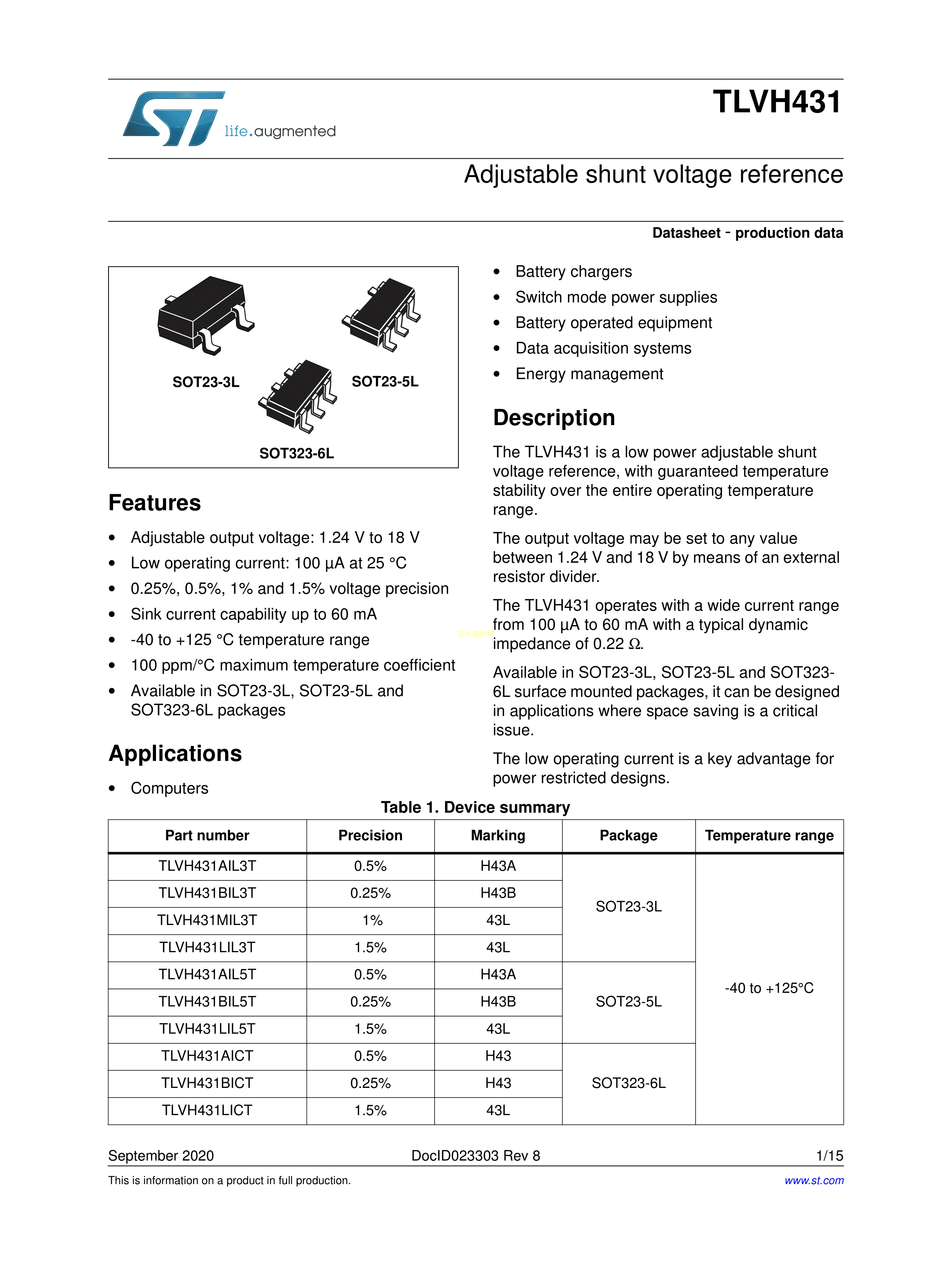 TLVH431LIL3T数据手册SOT-23-3封装ST(意法半导体)PDF规格书,中英文下载