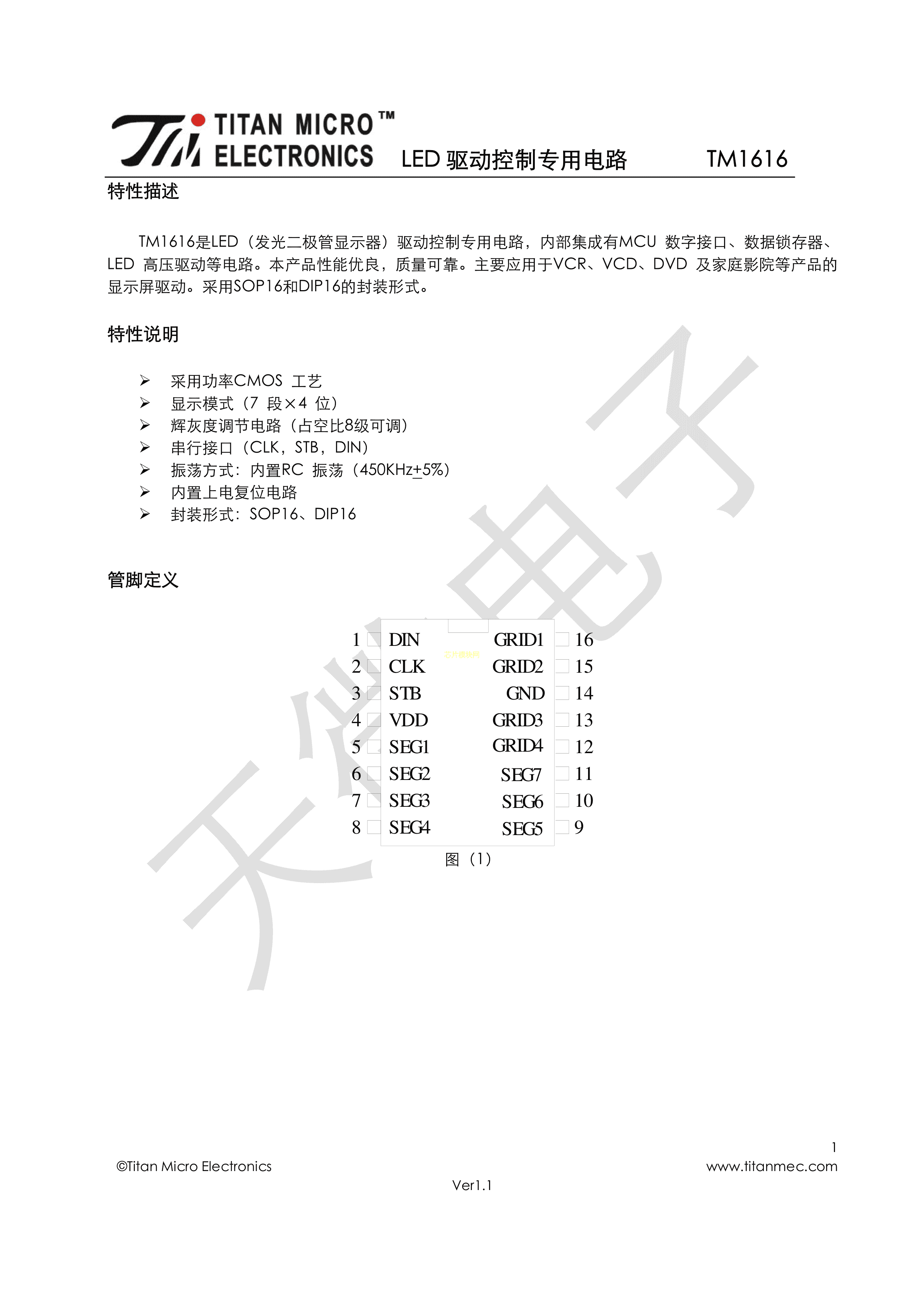TM1616数据手册SOP-16_150mil封装TM(天微)PDF规格书,中英文下载