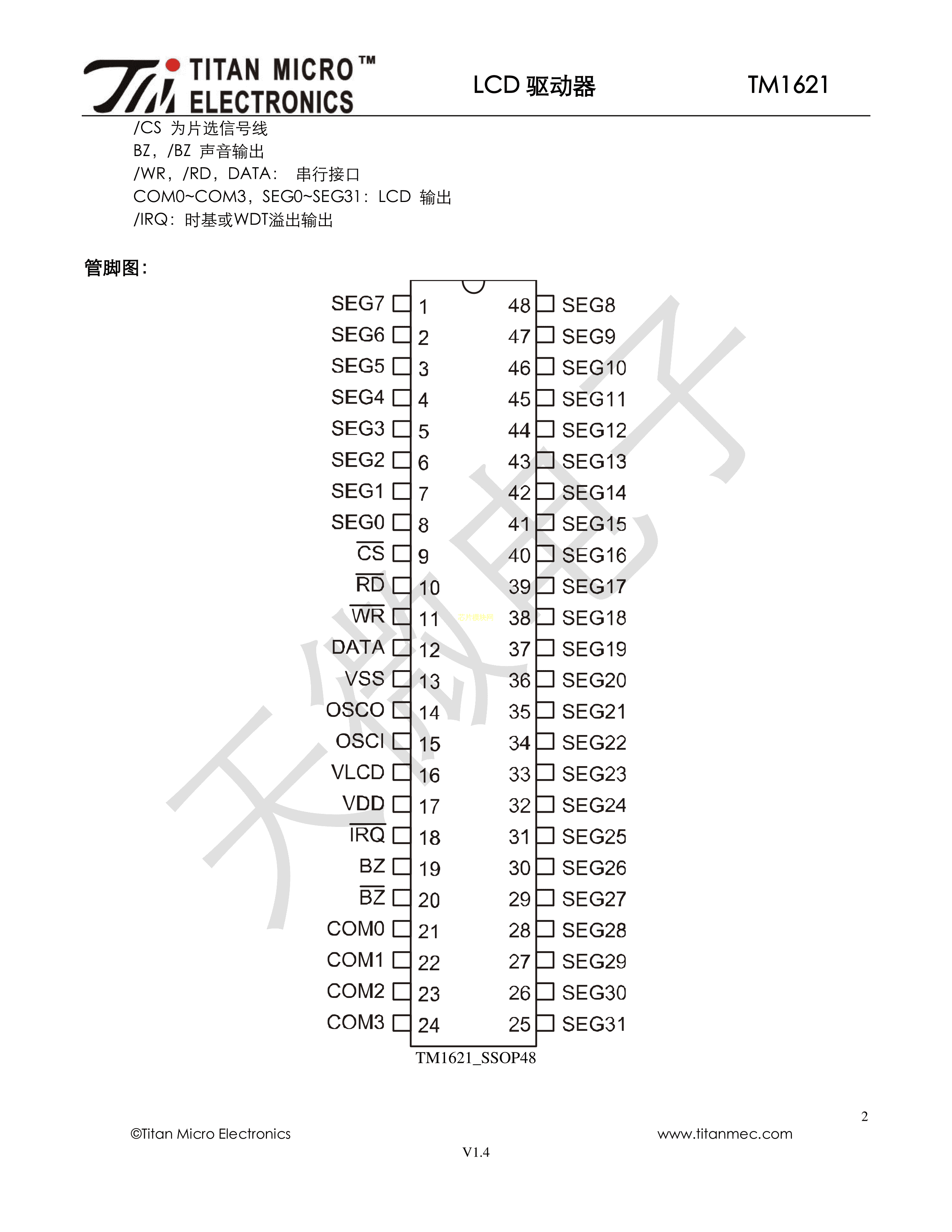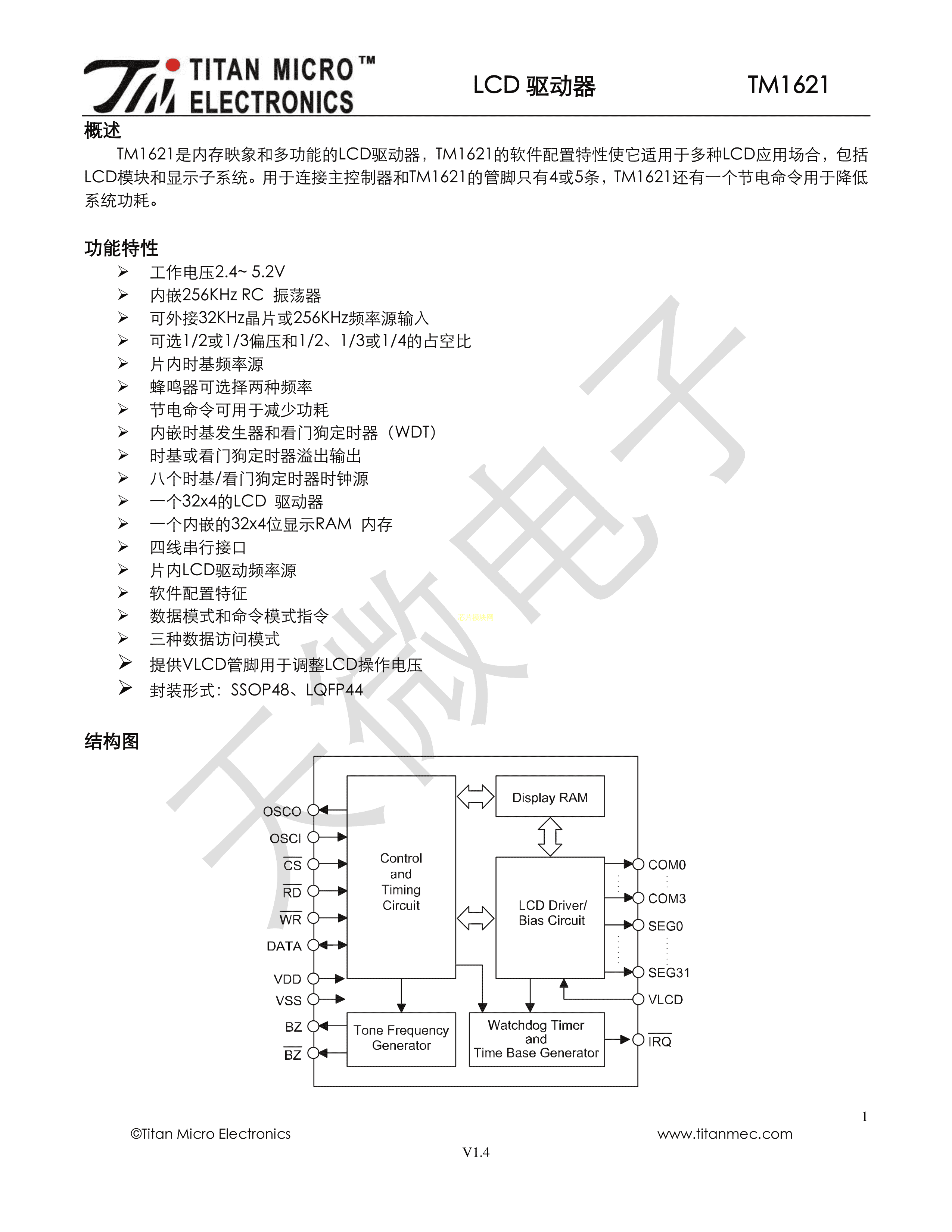 TM1621数据手册LQFP-44封装TM(天微)PDF规格书,中英文下载