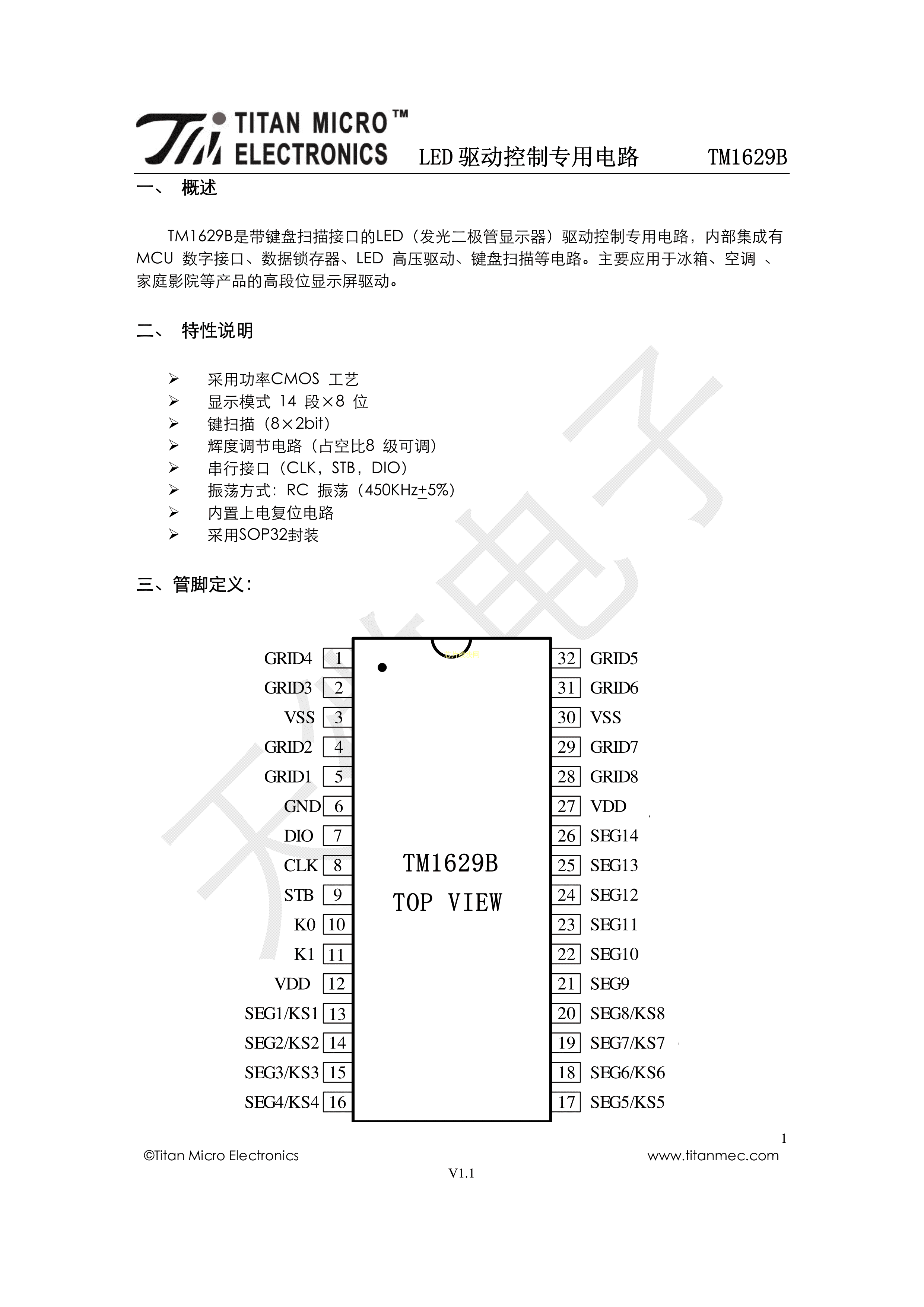 TM1629B数据手册SOP-32_300mil封装TM(天微)PDF规格书,中英文下载