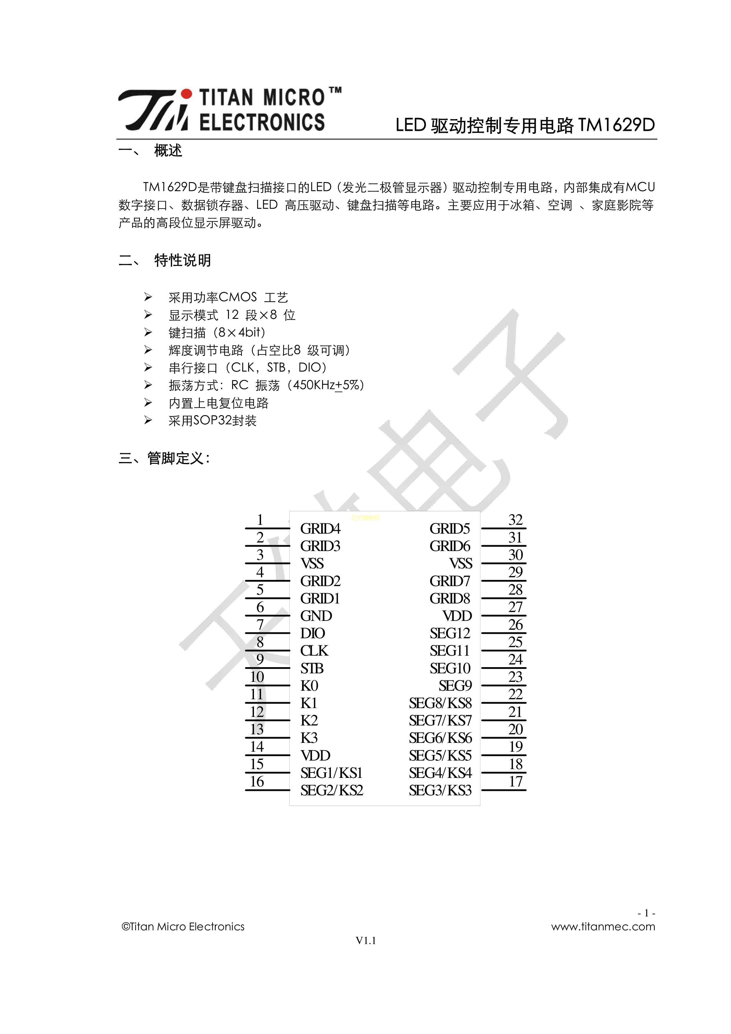 TM1629D数据手册SOP-32_300mil封装TM(天微)PDF规格书,中英文下载