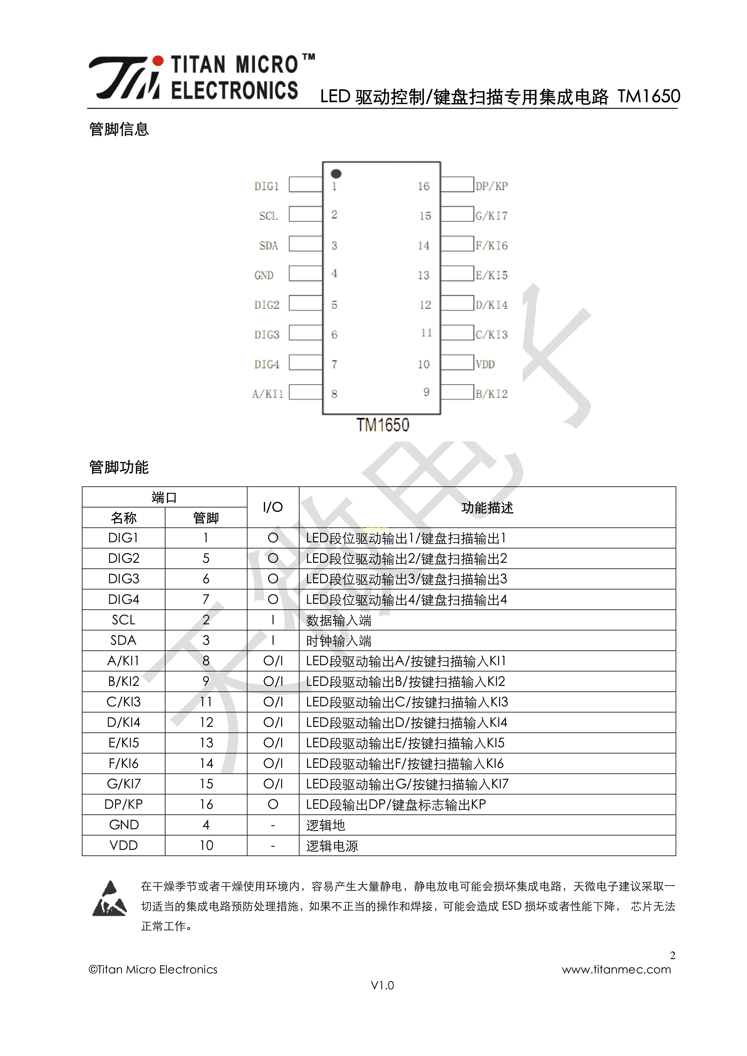 TM1650数据手册SOP-16_150mil封装TM(天微)PDF规格书,中英文下载