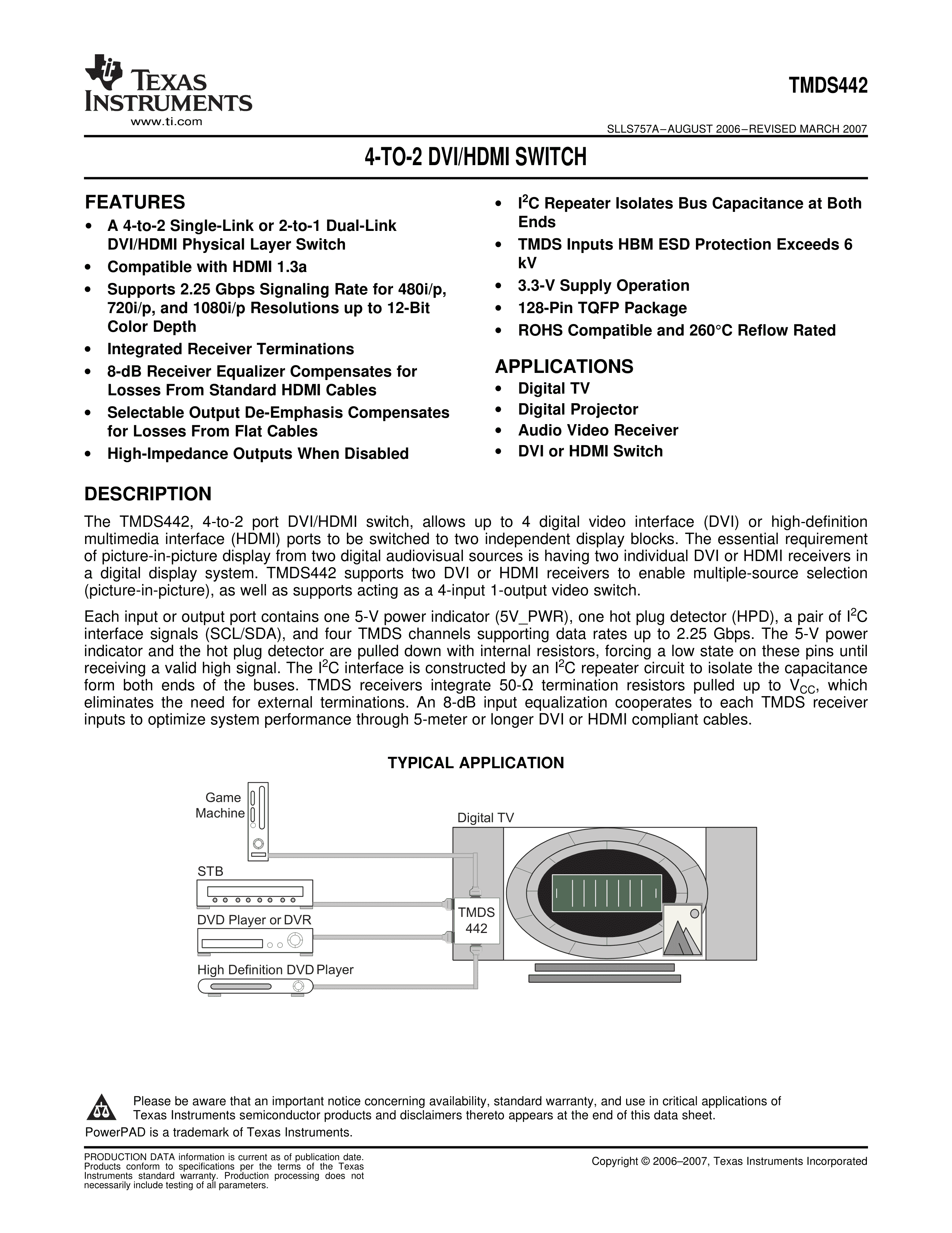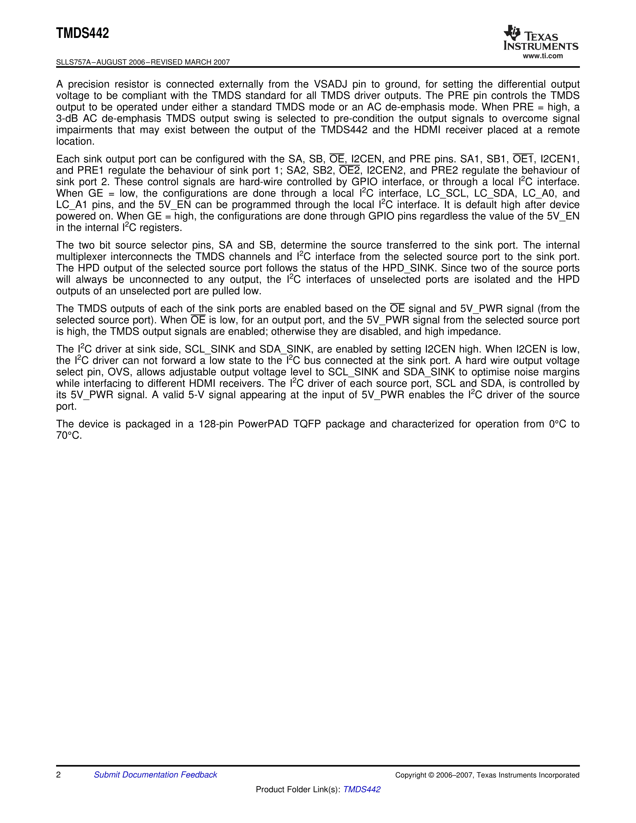 TMDS442PNPR数据手册HTQFP-128封装TI(德州仪器)PDF规格书,中英文下载
