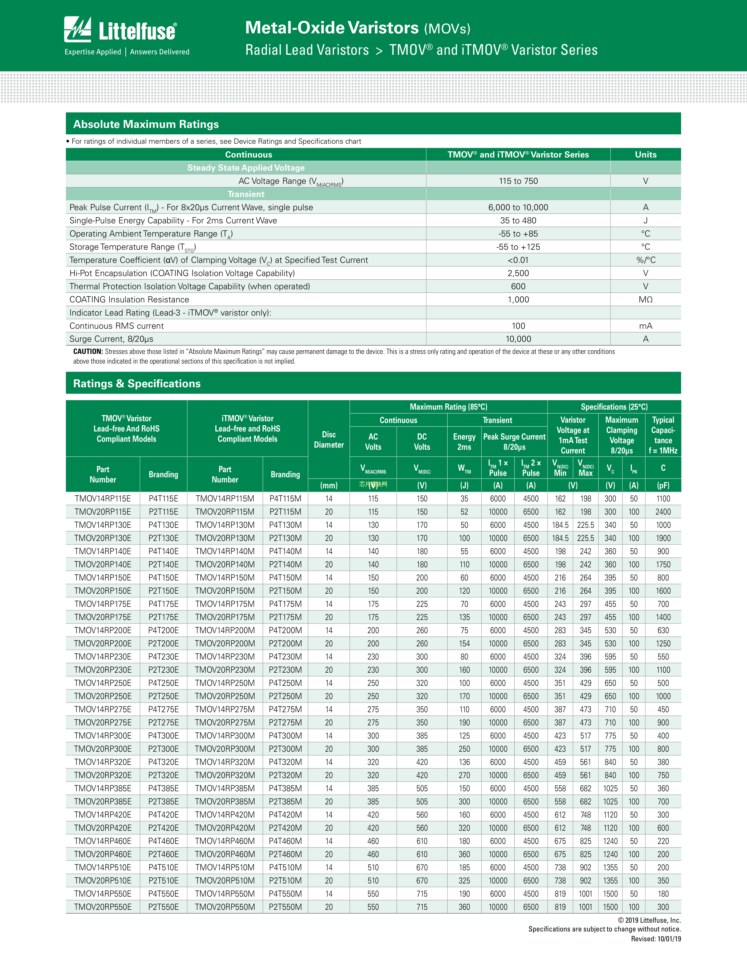 TMOV14RP550EL3T7数据手册径向引线封装Littelfuse(美国力特)PDF规格书,中英文下载