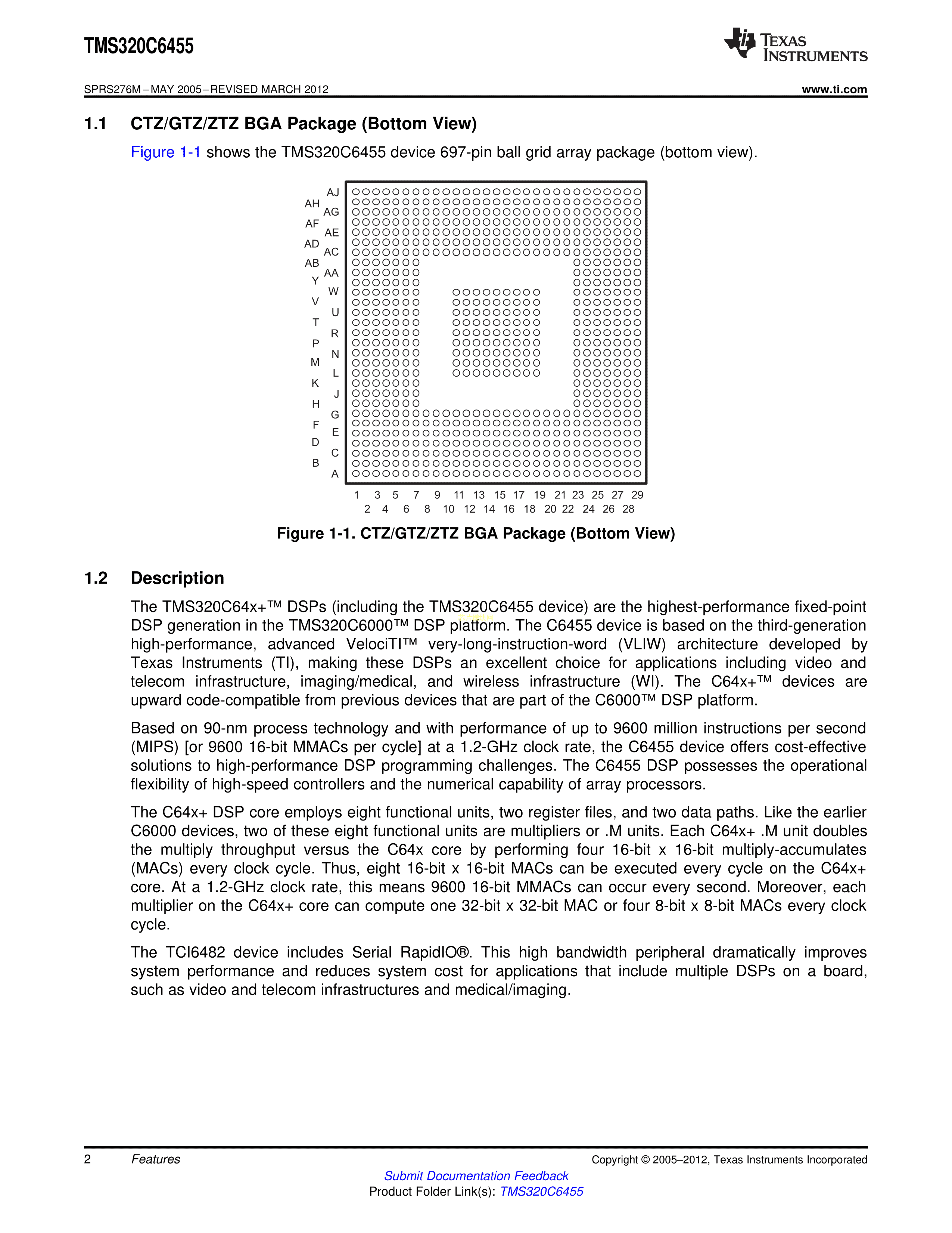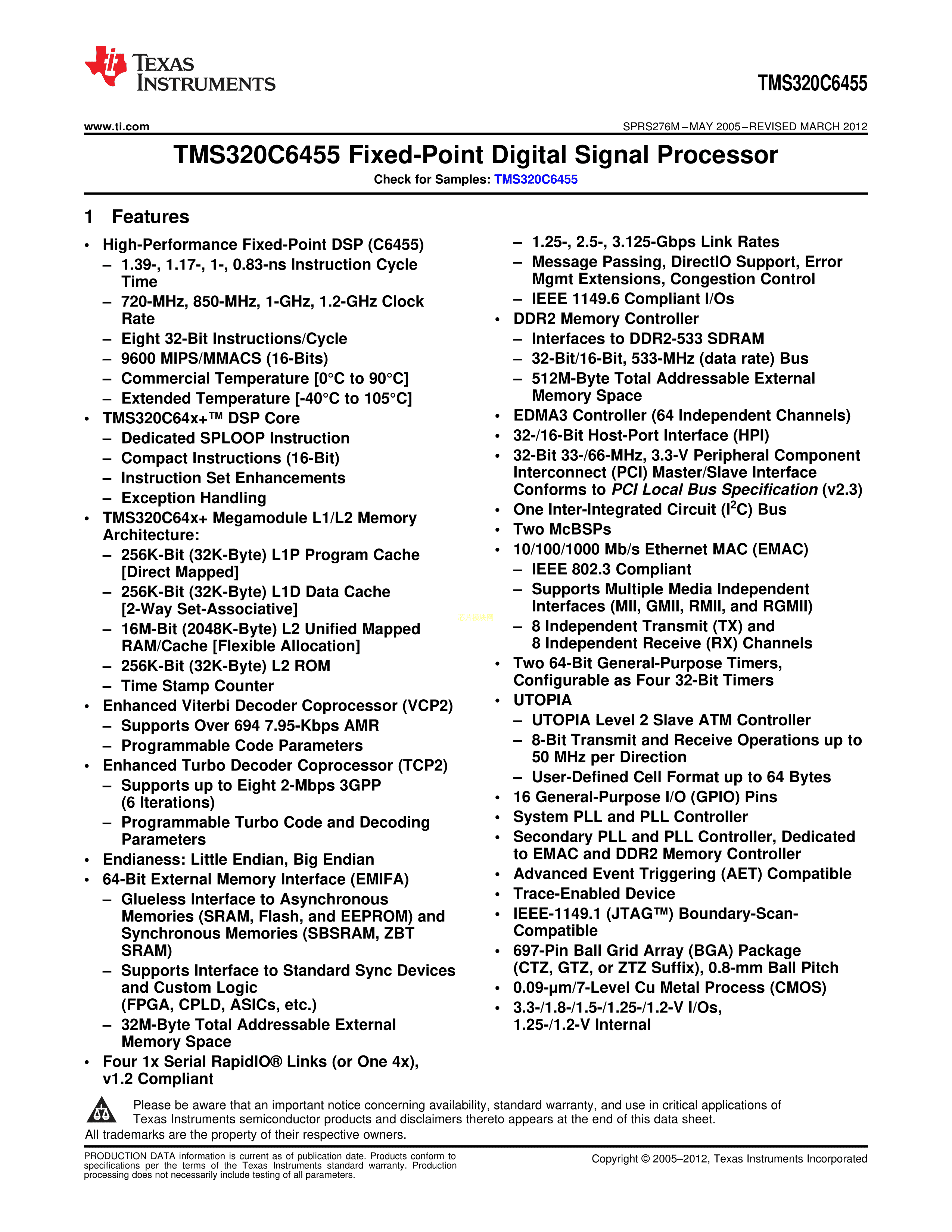 TMS320C6455BCTZ数据手册FCBGA-697(24x24)封装TI(德州仪器)PDF规格