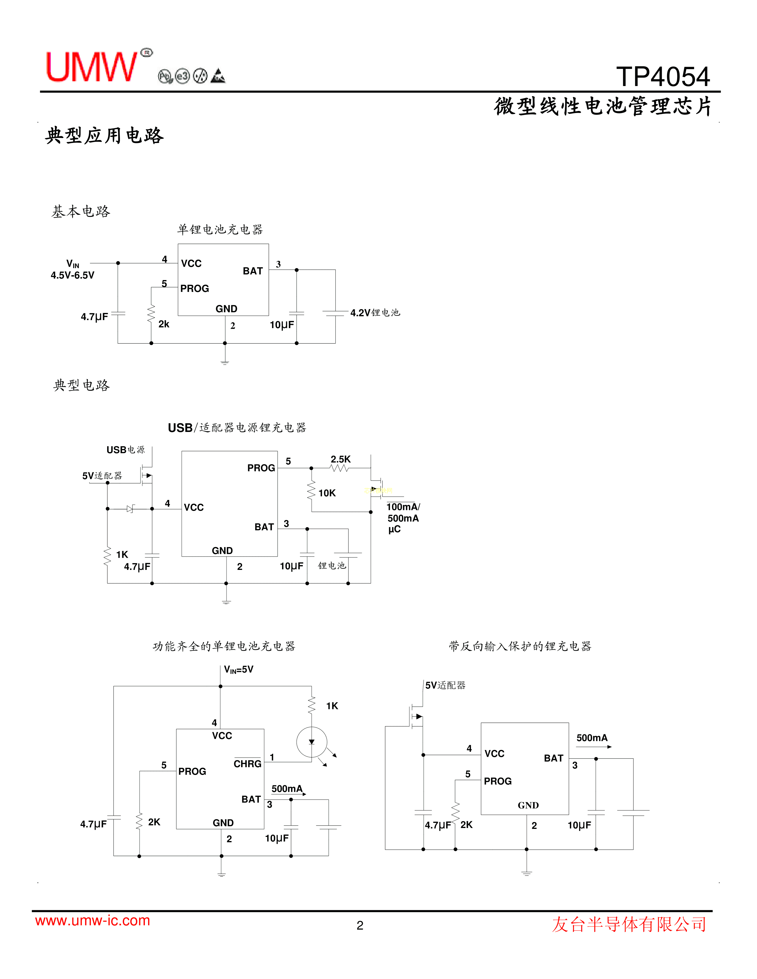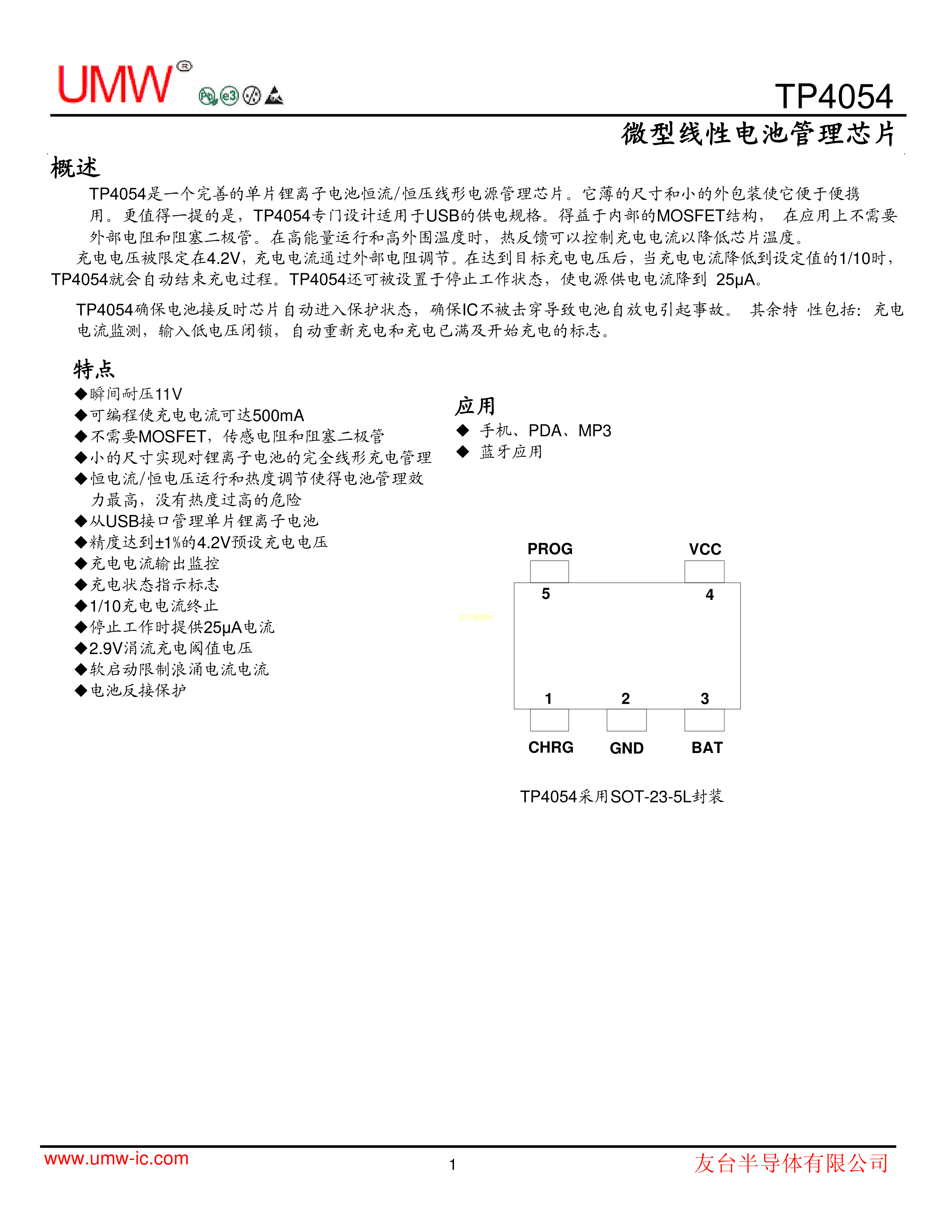 TP4054数据手册SOT-23-5L封装UMW(友台半导体)PDF规格书,中英文下载