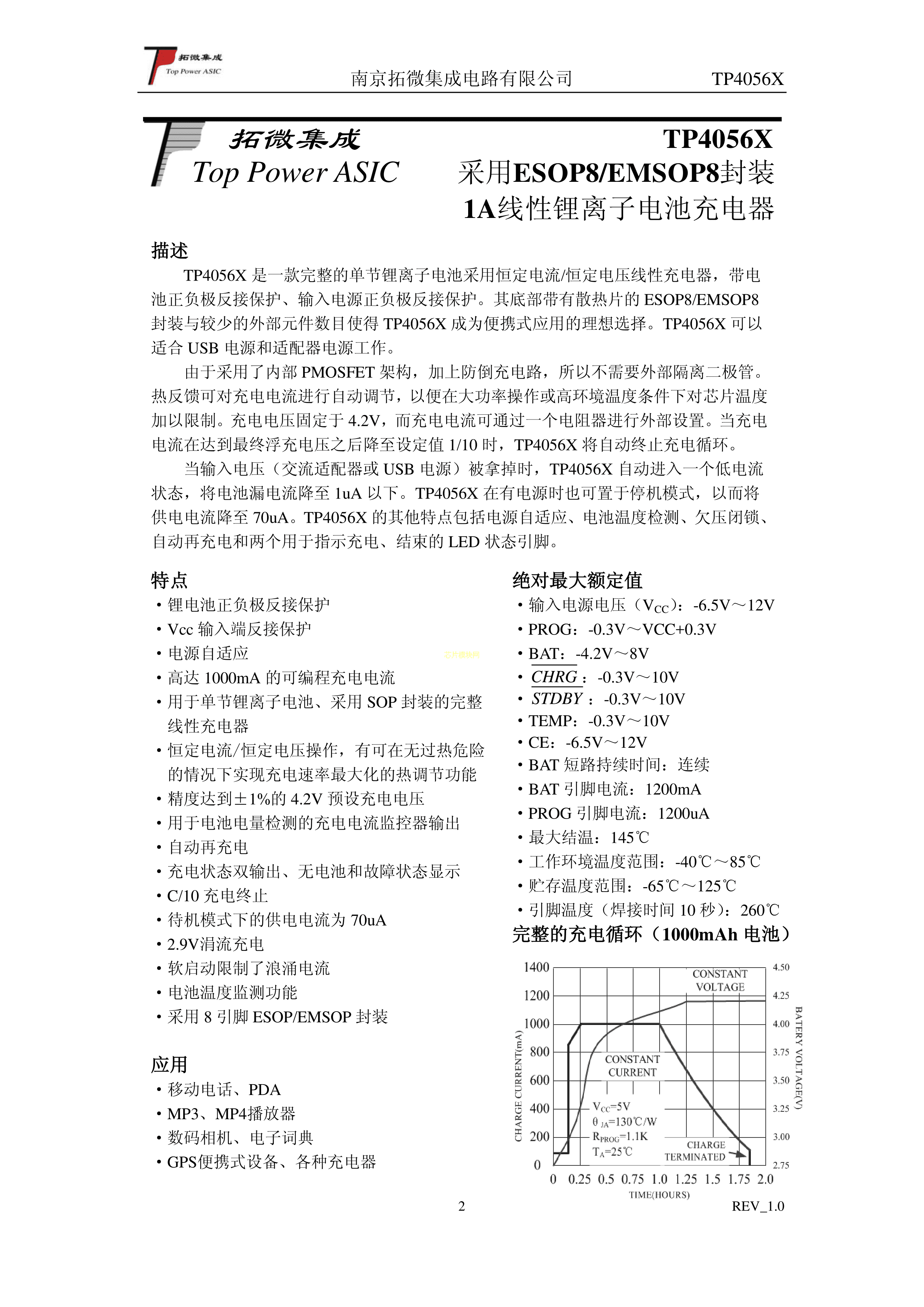 TP4056X-42-ESOP8数据手册SOP-8EP_150mil封装TOPPOWER(南京拓微)