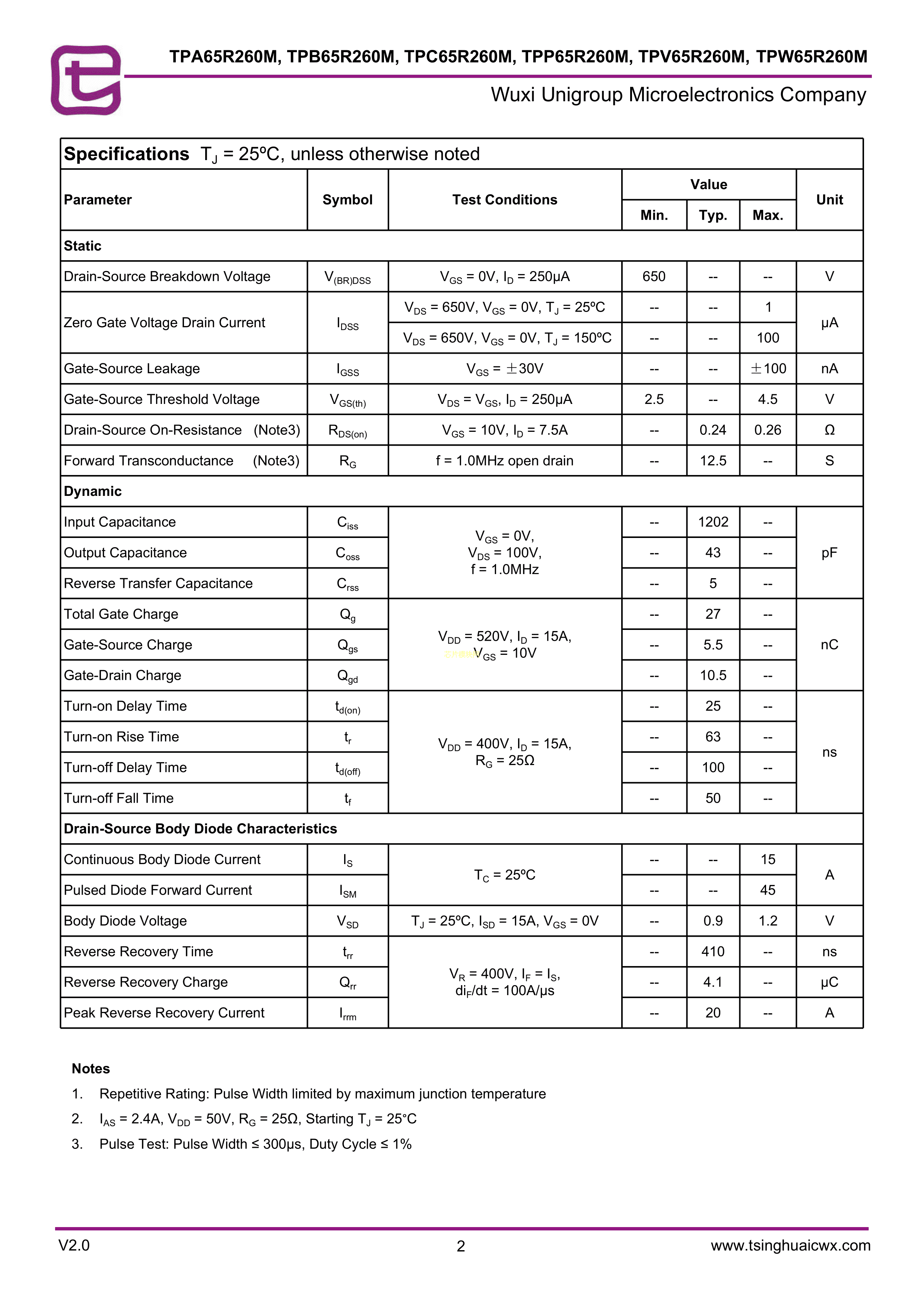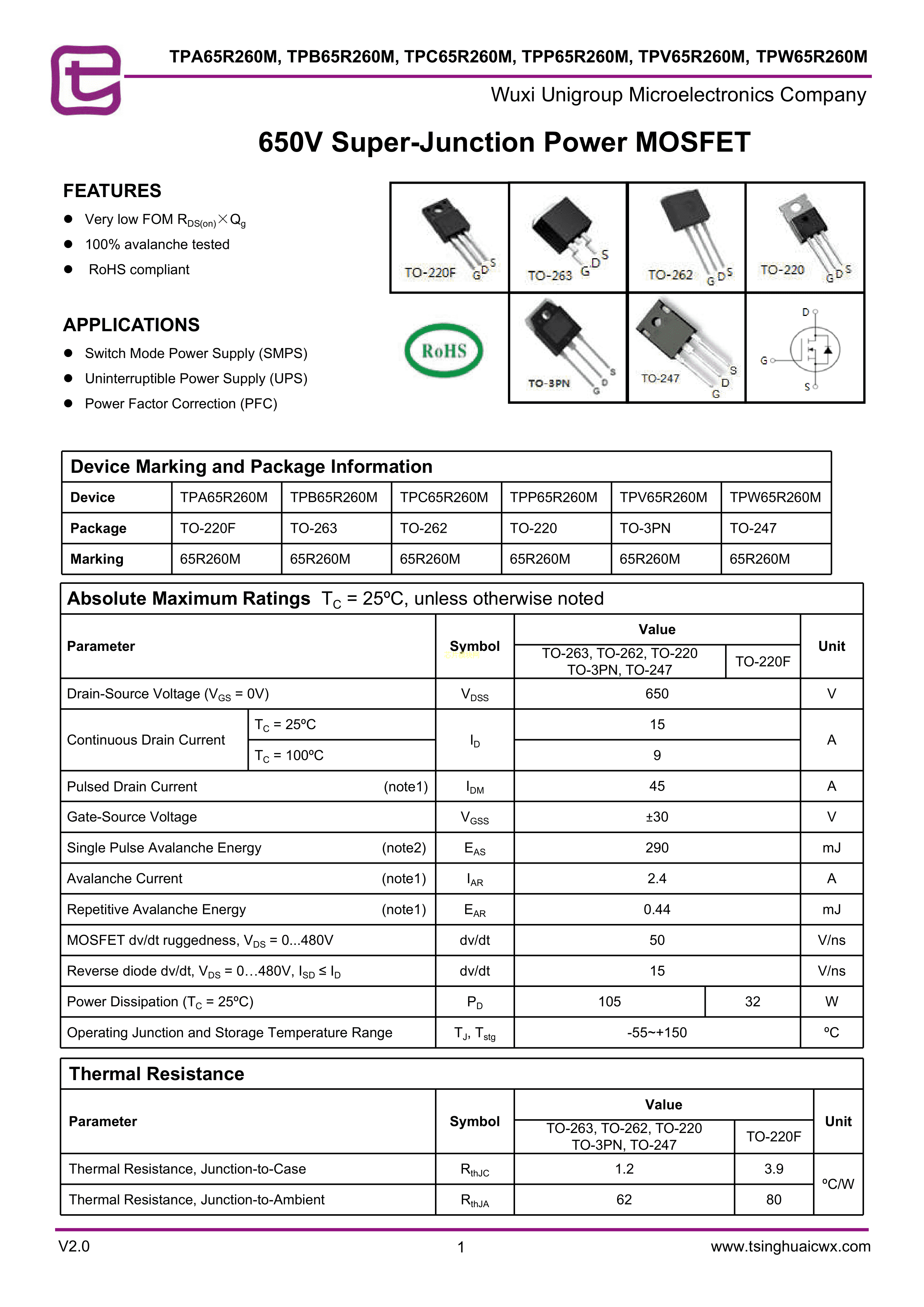 TPA65R260M数据手册TO-220F封装无锡紫光微PDF规格书,中英文下载
