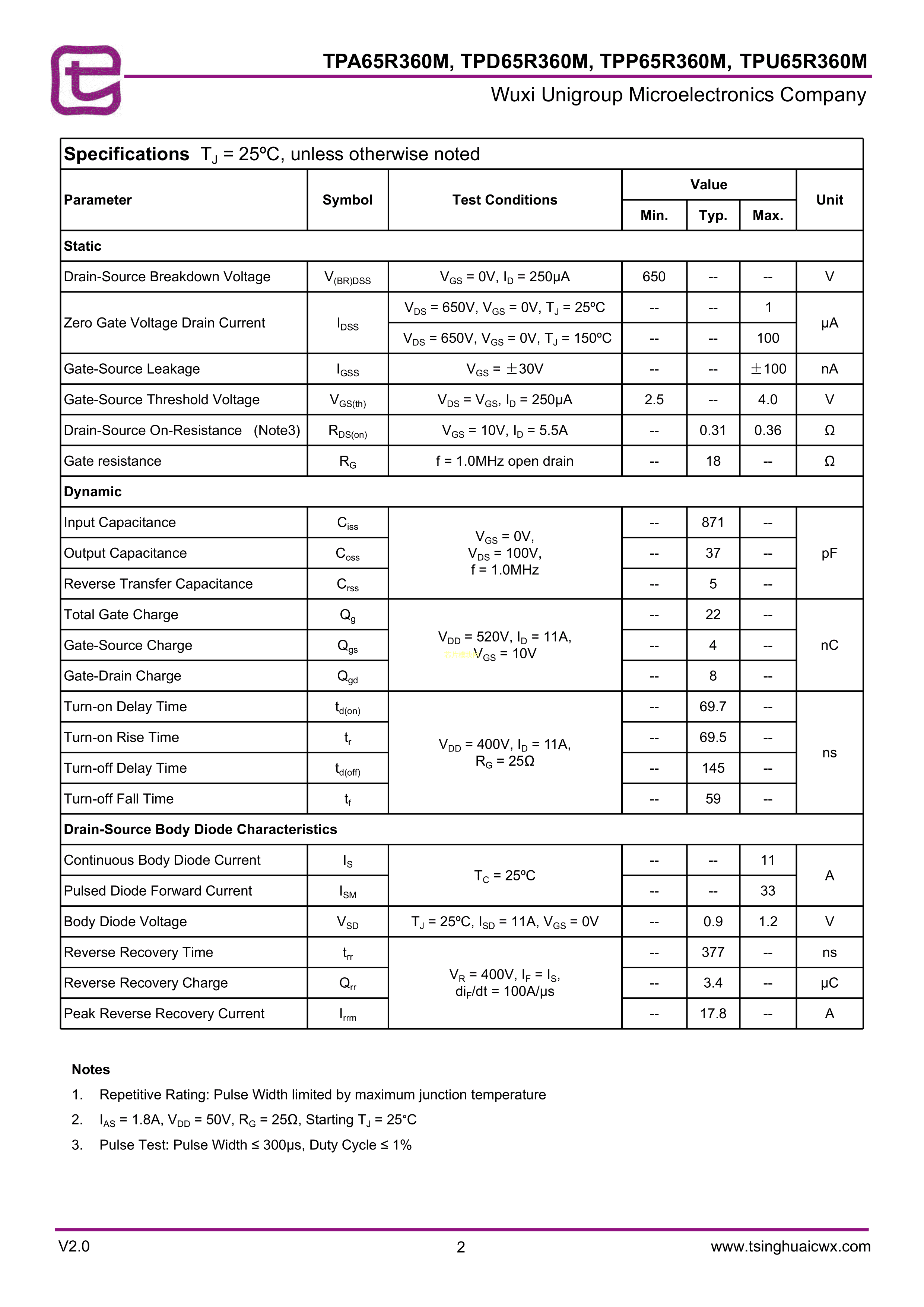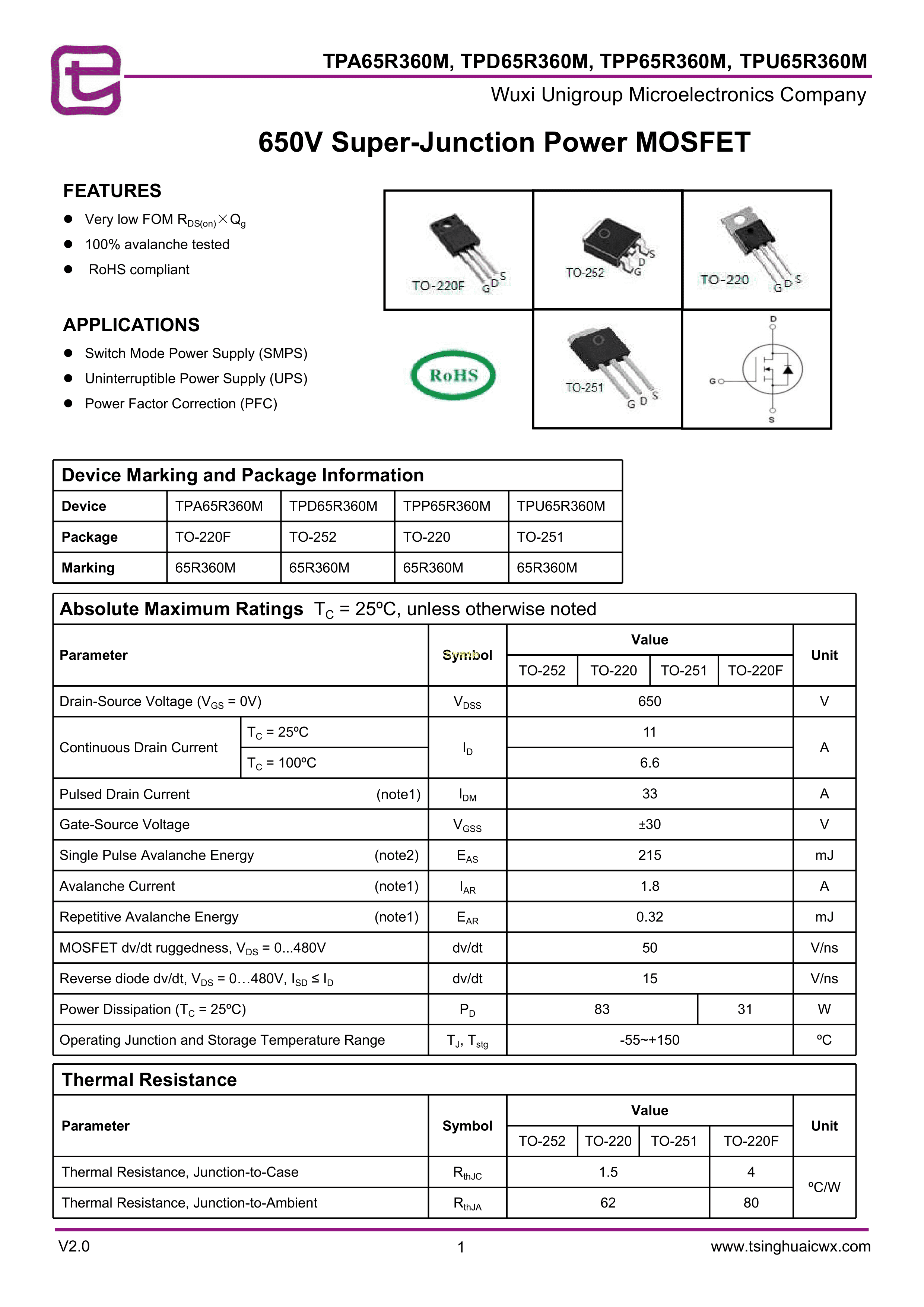 TPA65R360M数据手册TO-220F封装无锡紫光微PDF规格书,中英文下载
