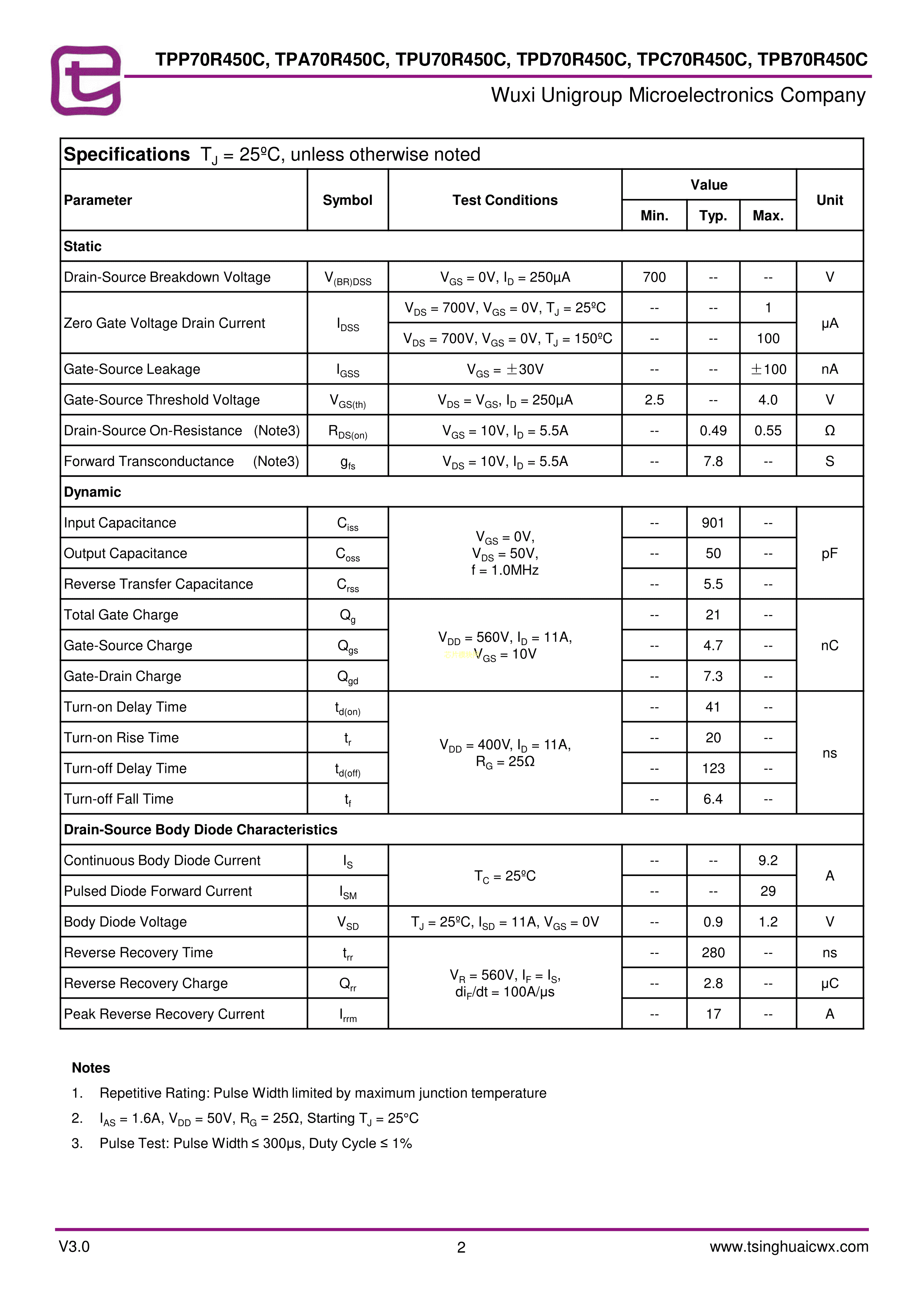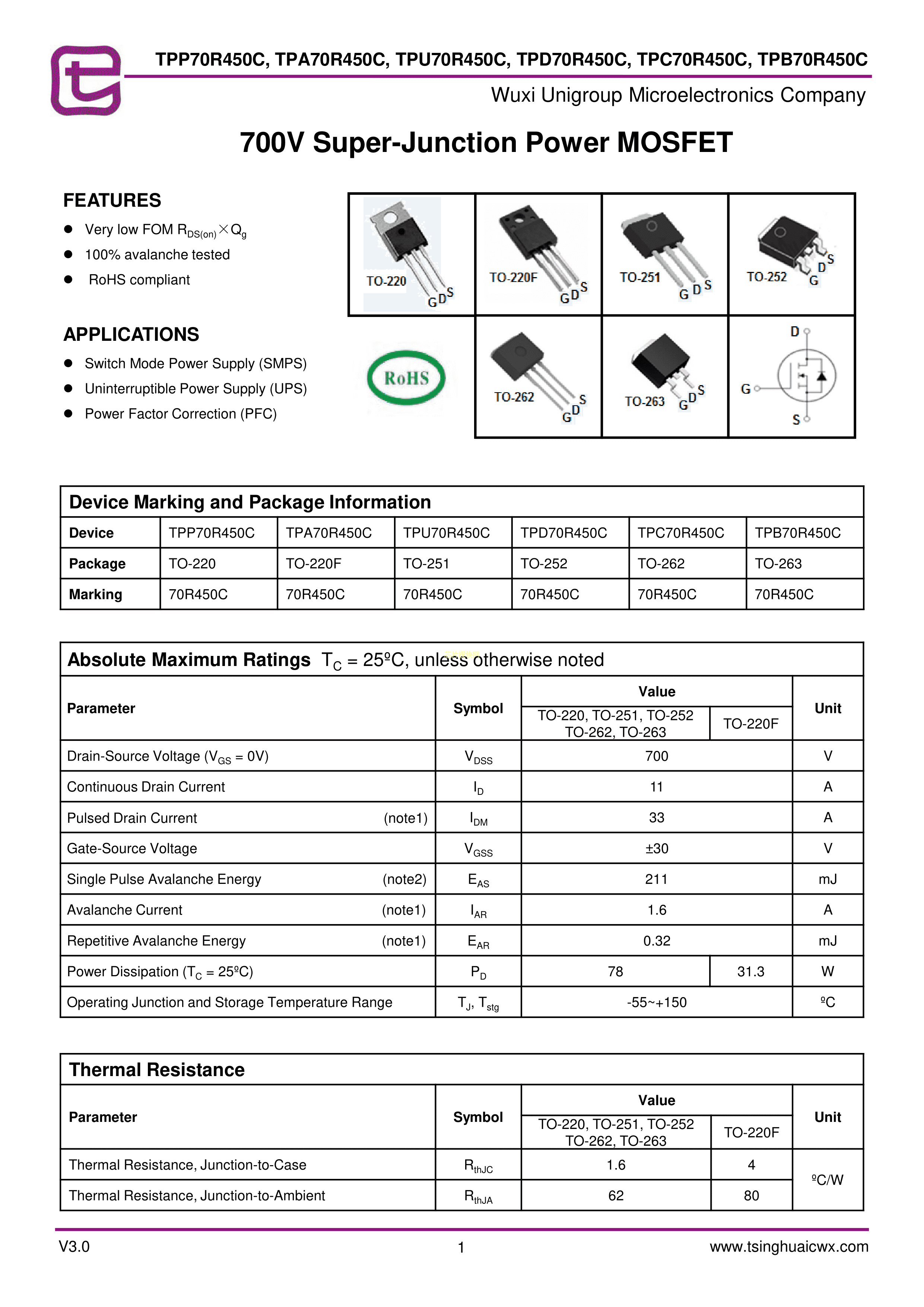 TPA70R450C数据手册TO-220F封装无锡紫光微PDF规格书,中英文下载