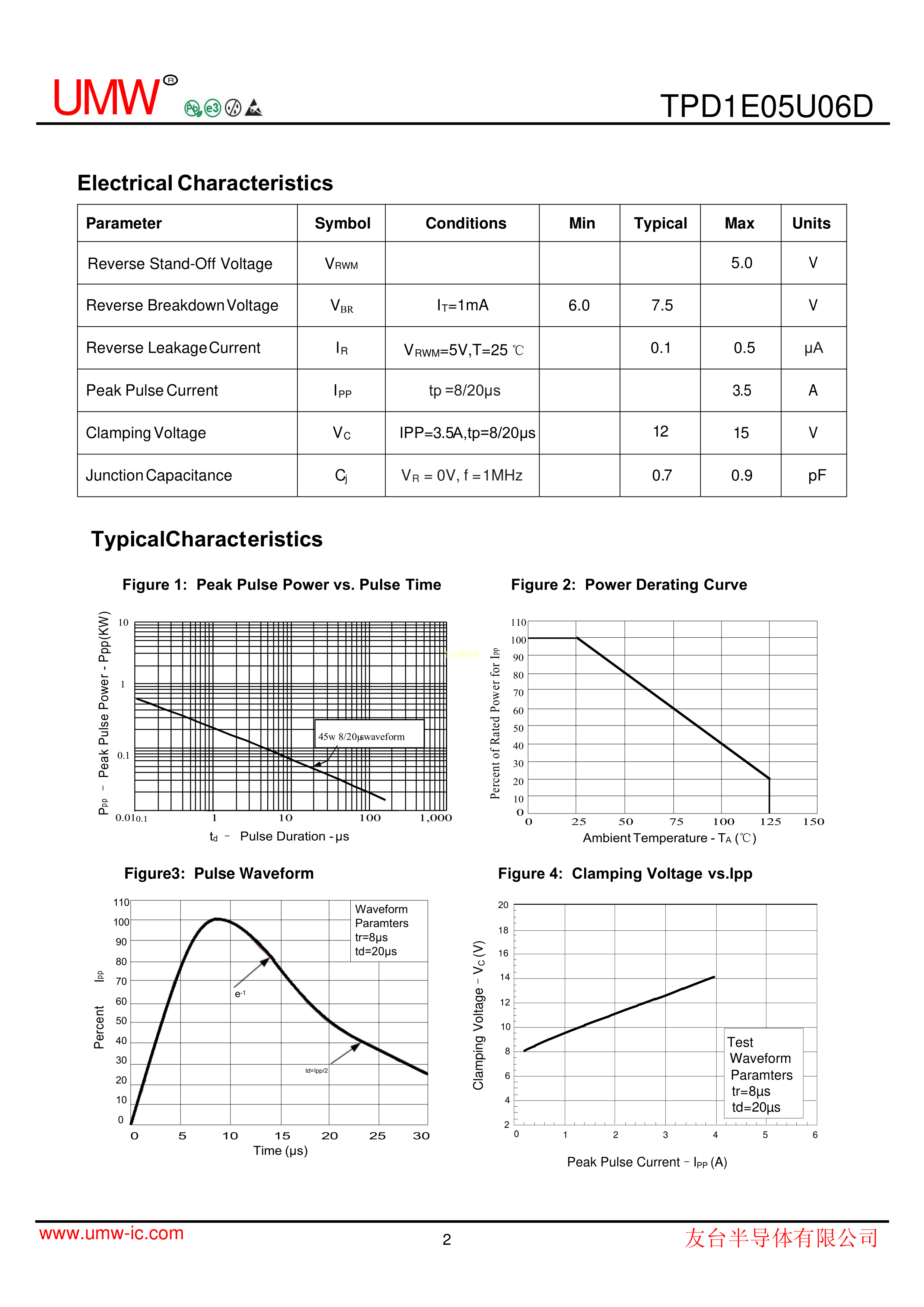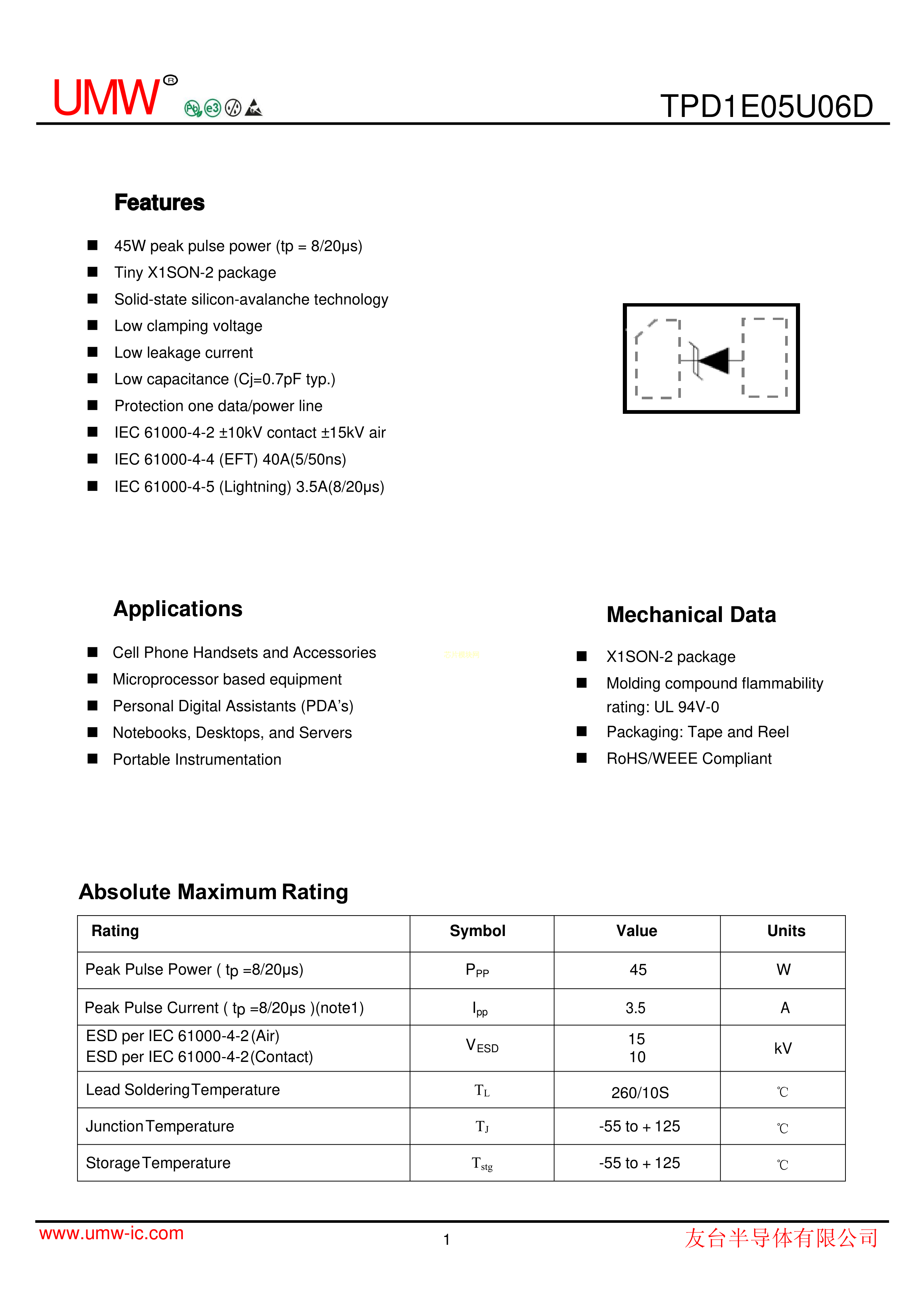 TPD1E05U06DPYR数据手册X1SON-2封装UMW(友台半导体)PDF规格书,中英文下载