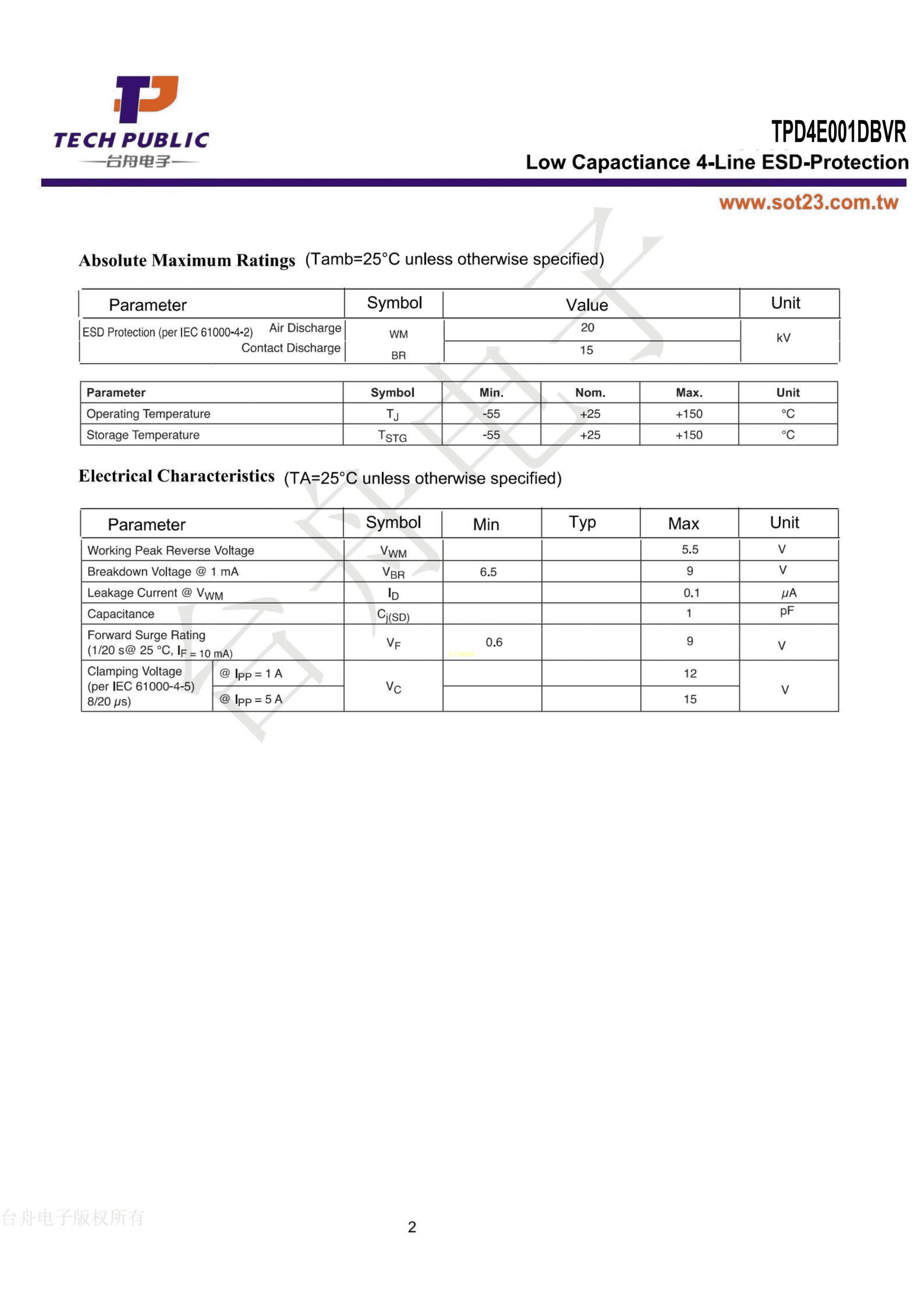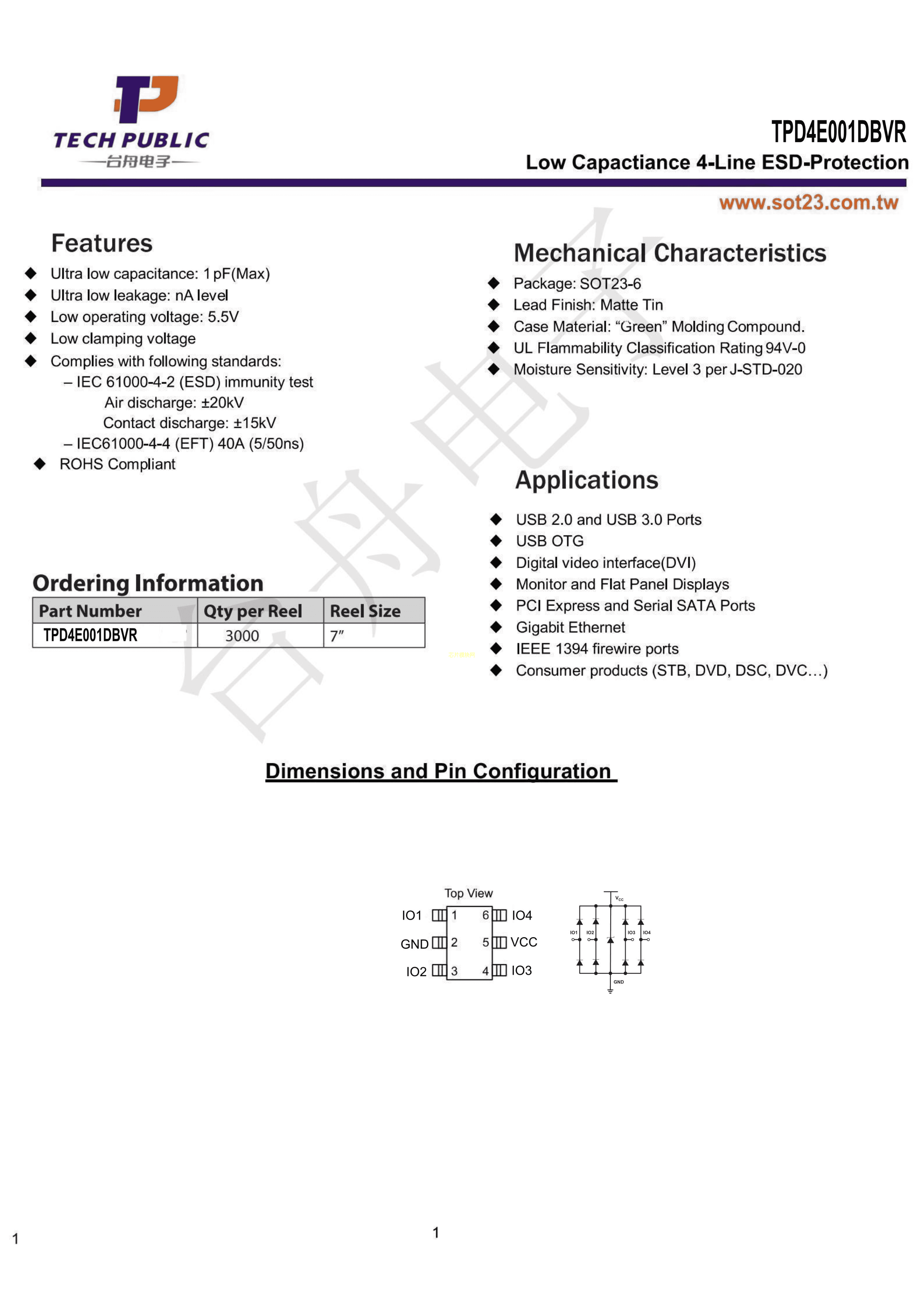 TPD4E001DBVR数据手册SOT23-6封装TECHPUBLIC(台舟)PDF规格书,中英文下载