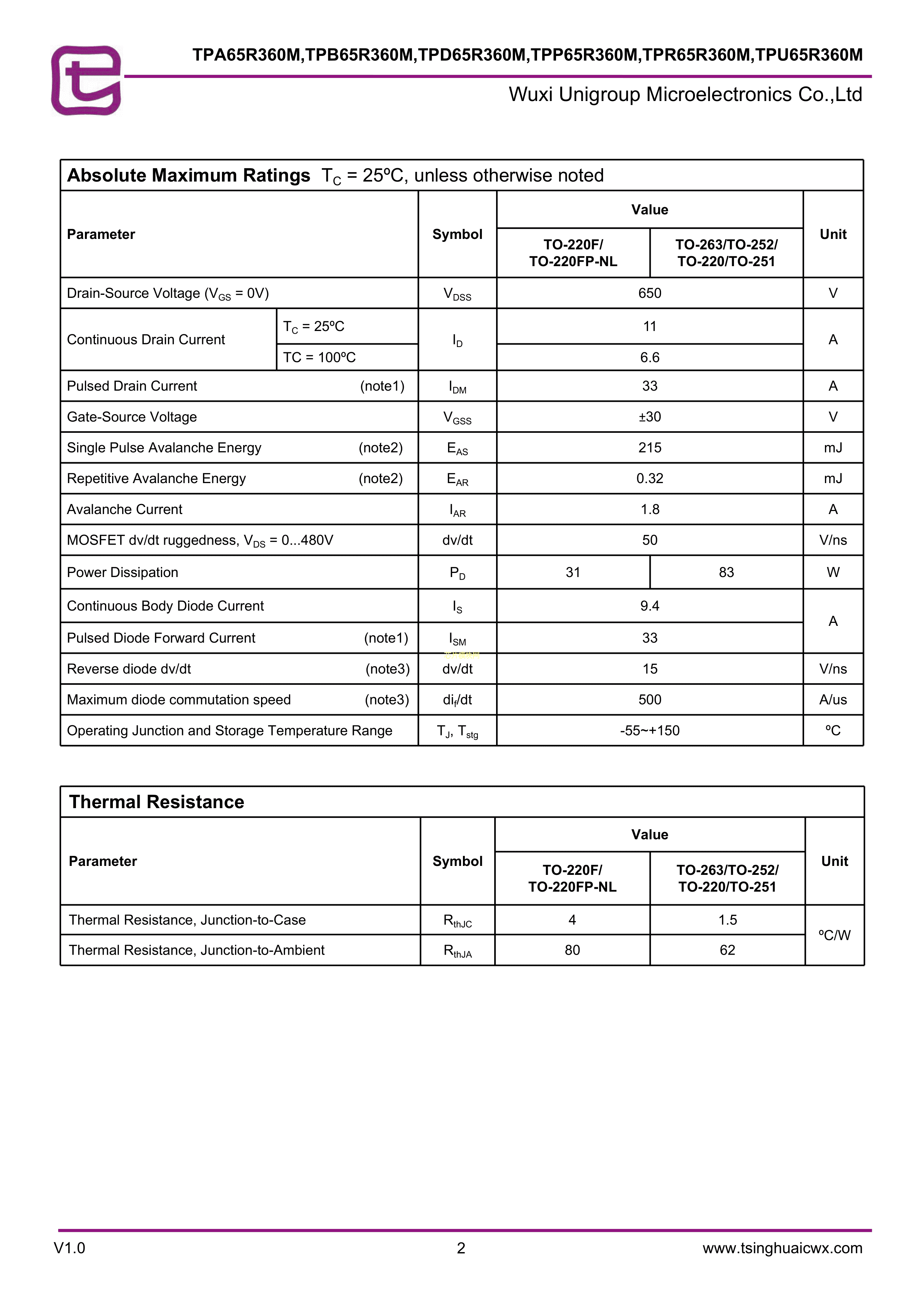TPD65R360M数据手册TO-252封装无锡紫光微PDF规格书,中英文下载