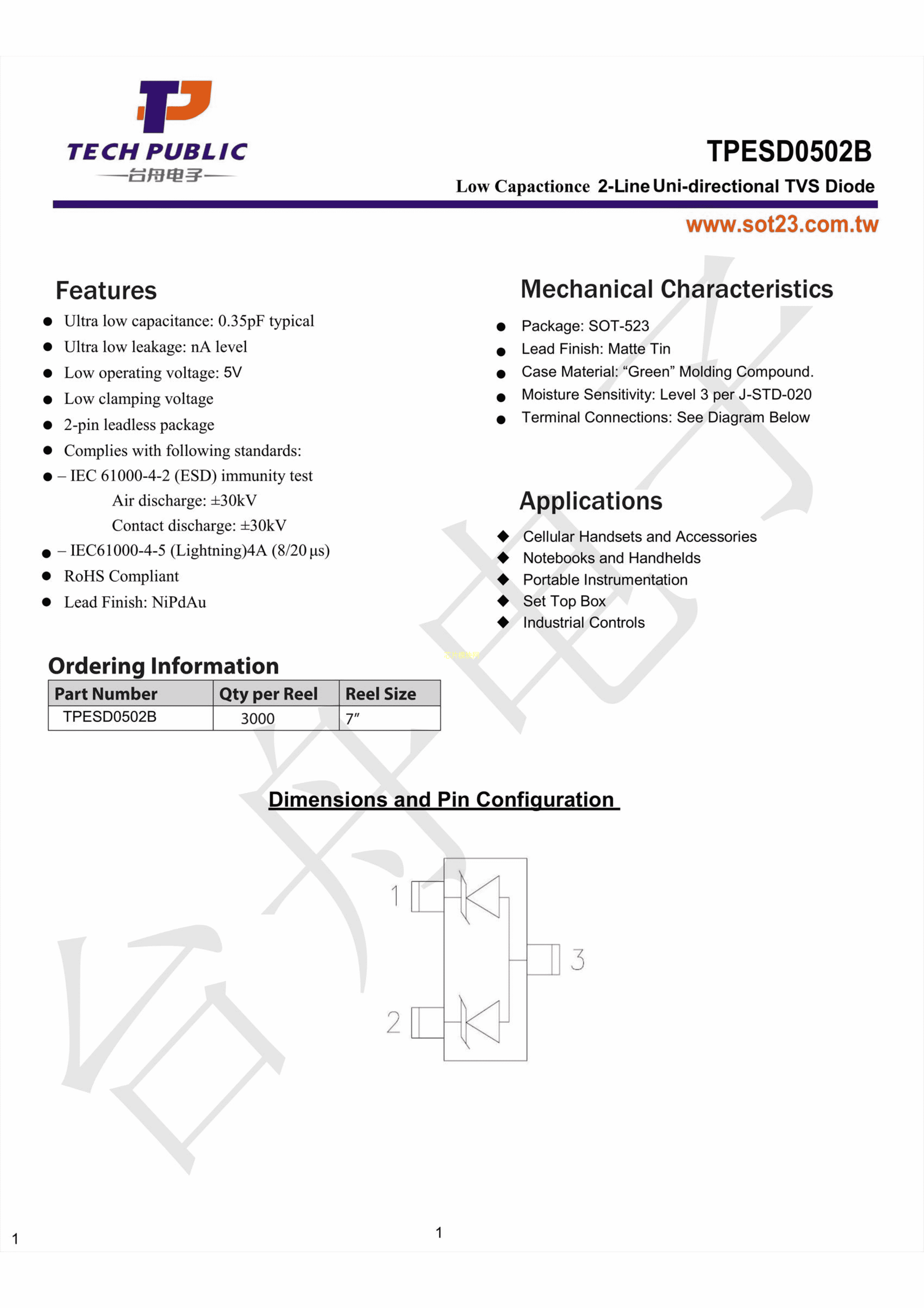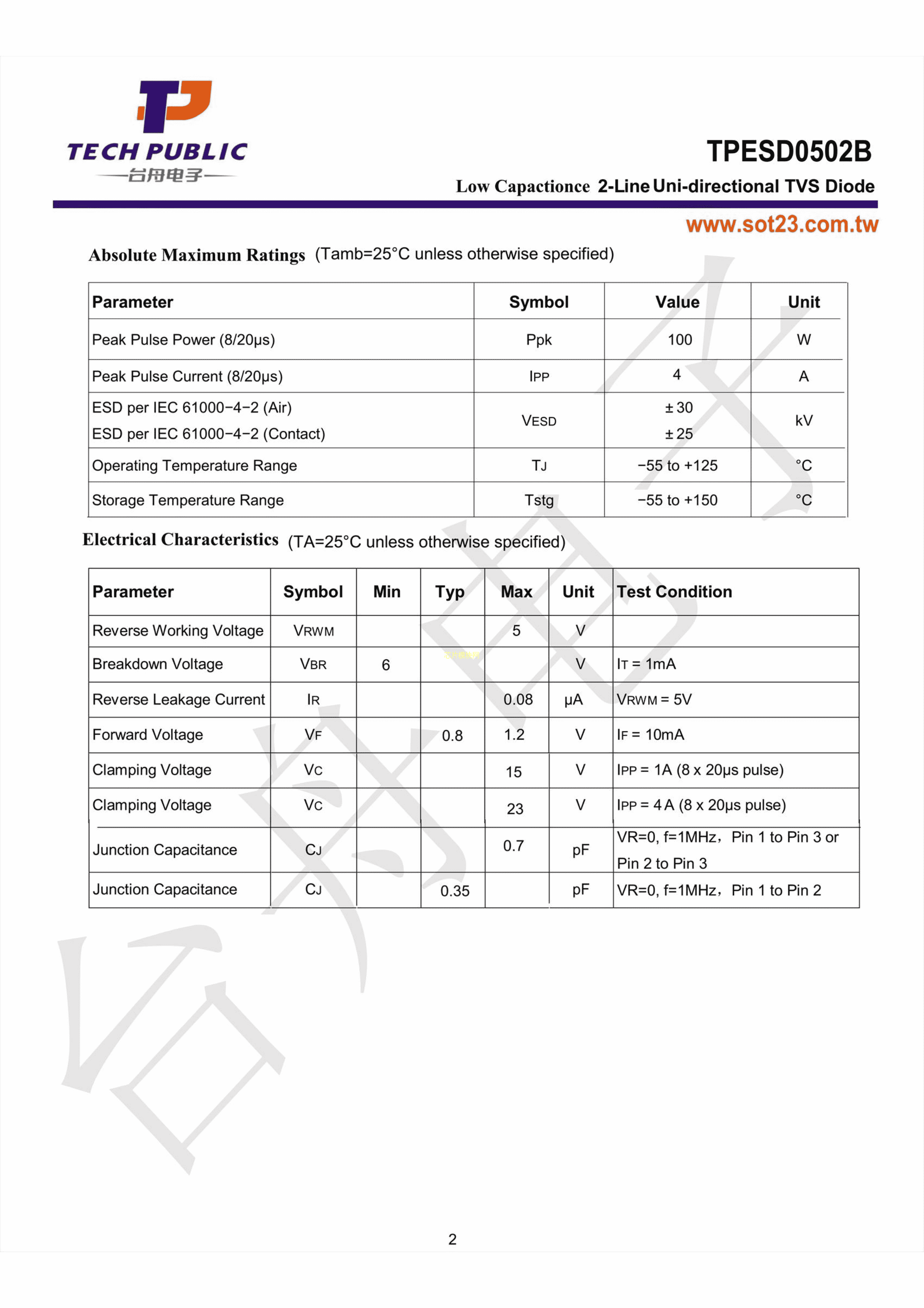 TPESD0502B数据手册SOT-523封装TECHPUBLIC(台舟)PDF规格书,中英文下载