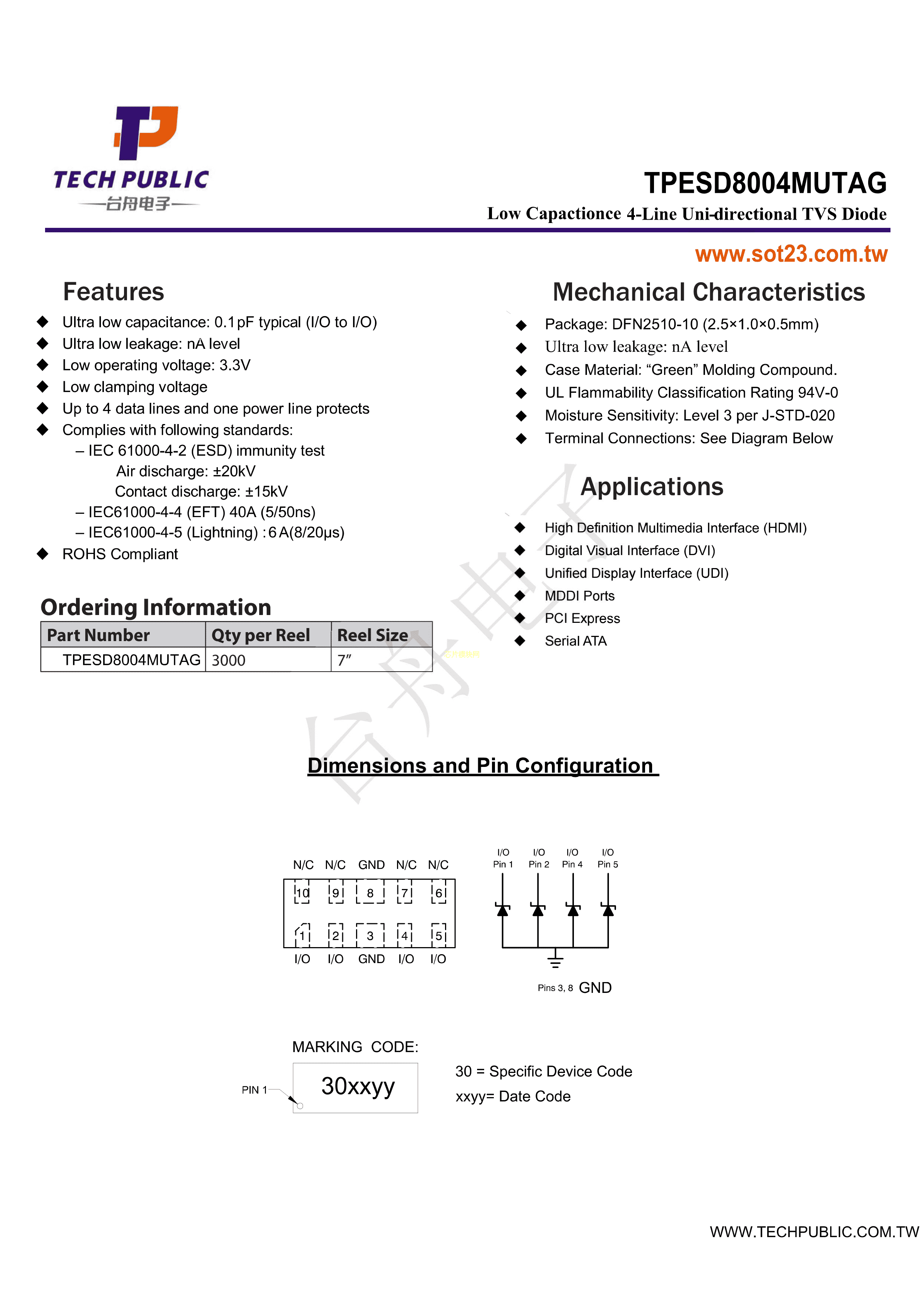 TPESD8004MUTAG数据手册DFN2510封装TECH PUBLIC(台舟)PDF规格书,中
