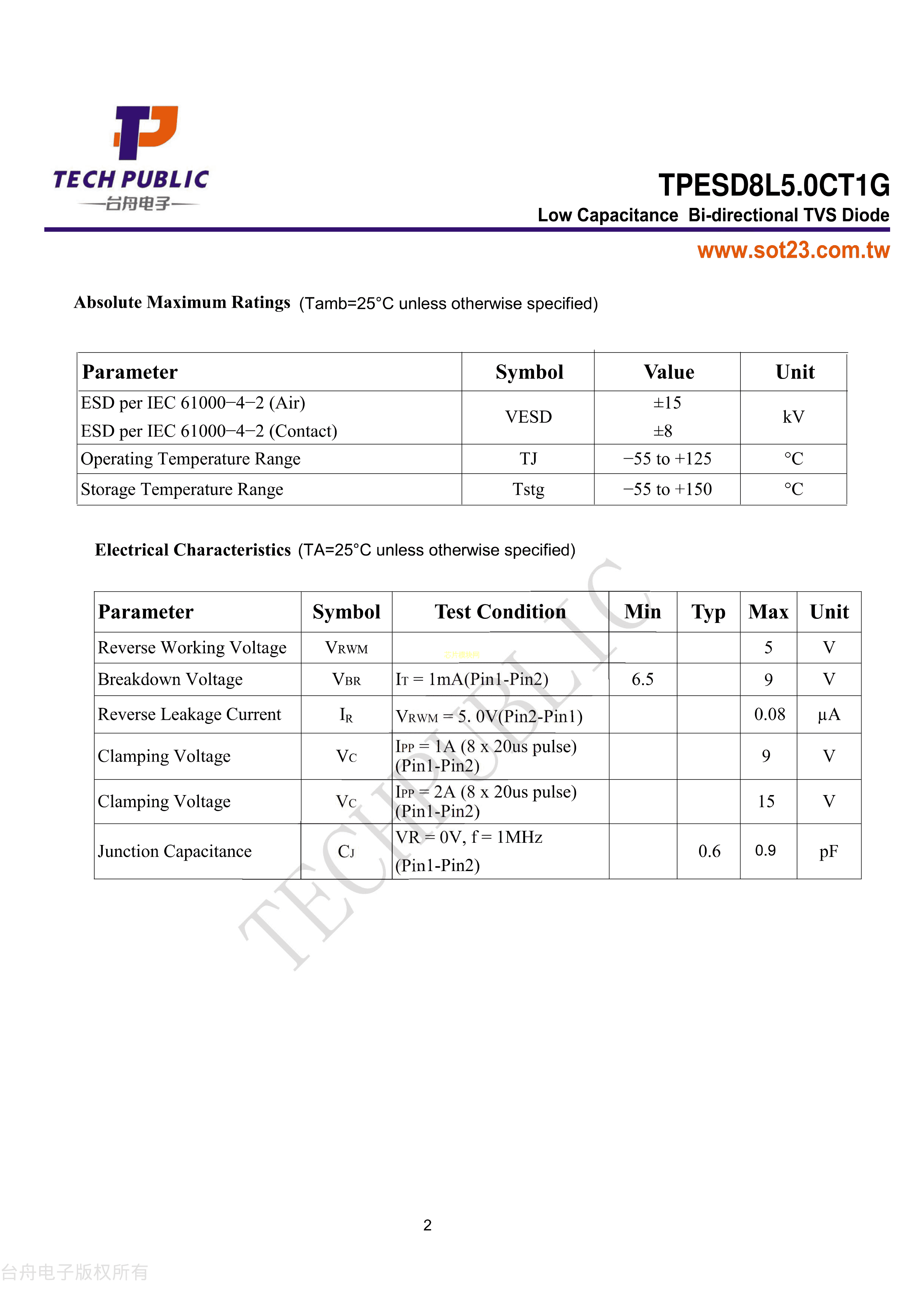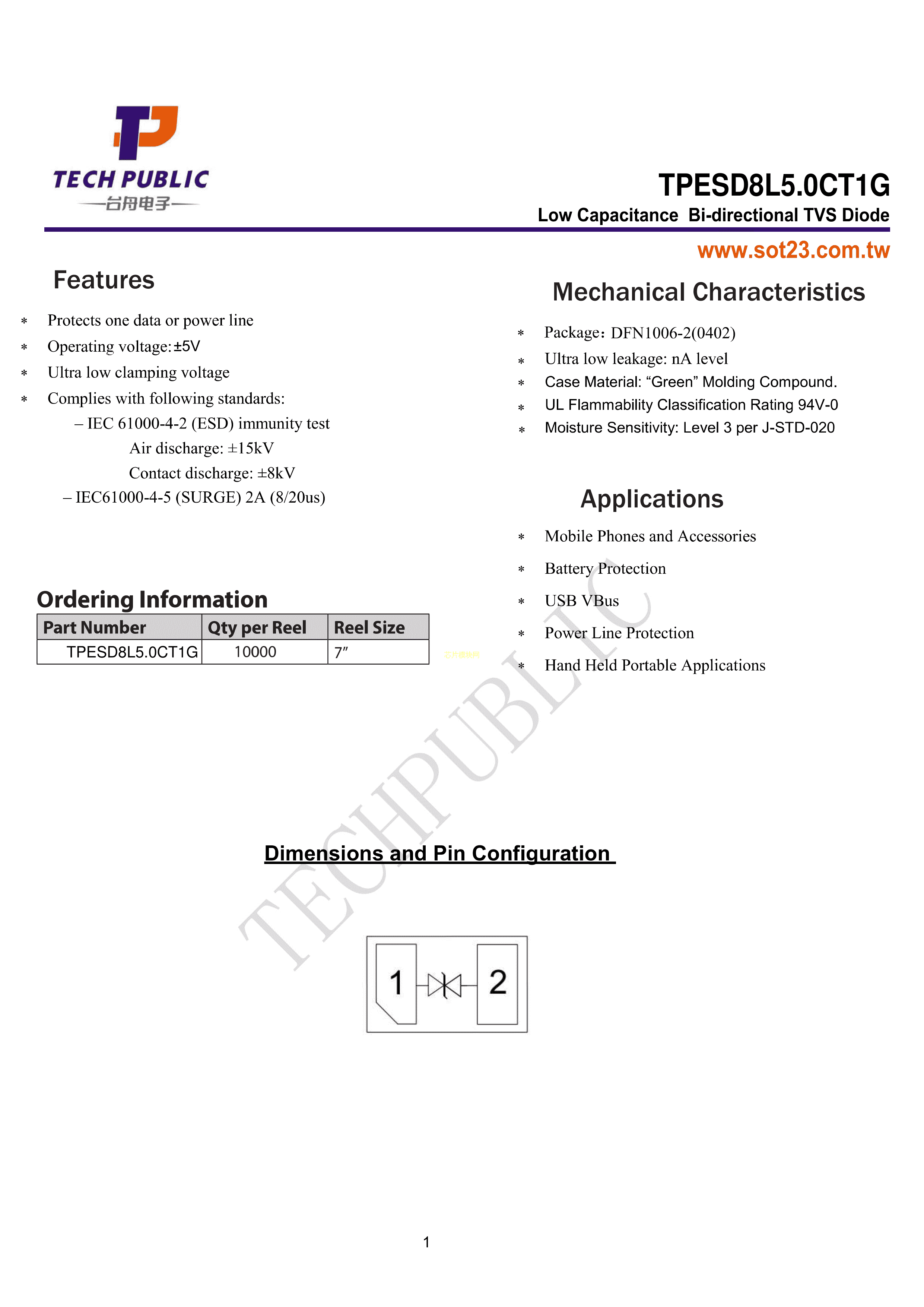 TPESD8L5.0CT5G数据手册DFN1006封装TECHPUBLIC(台舟)PDF规格书,中英文下载