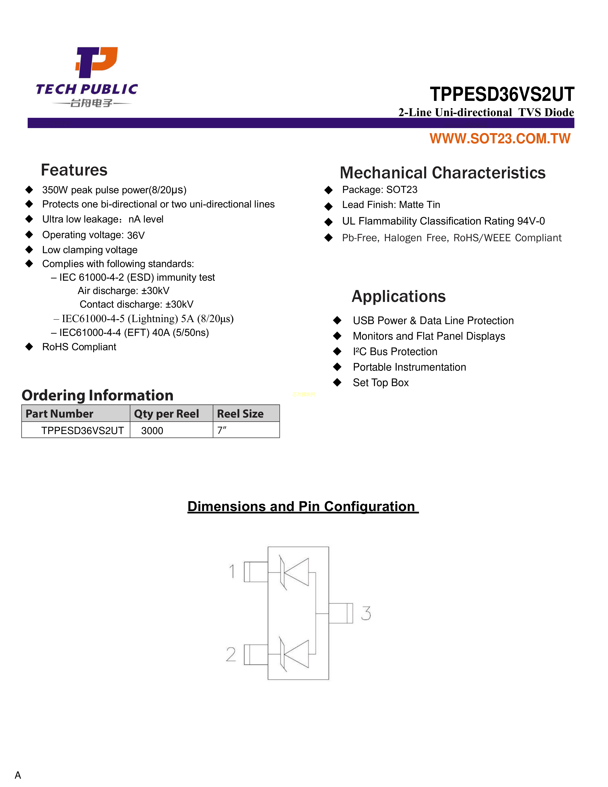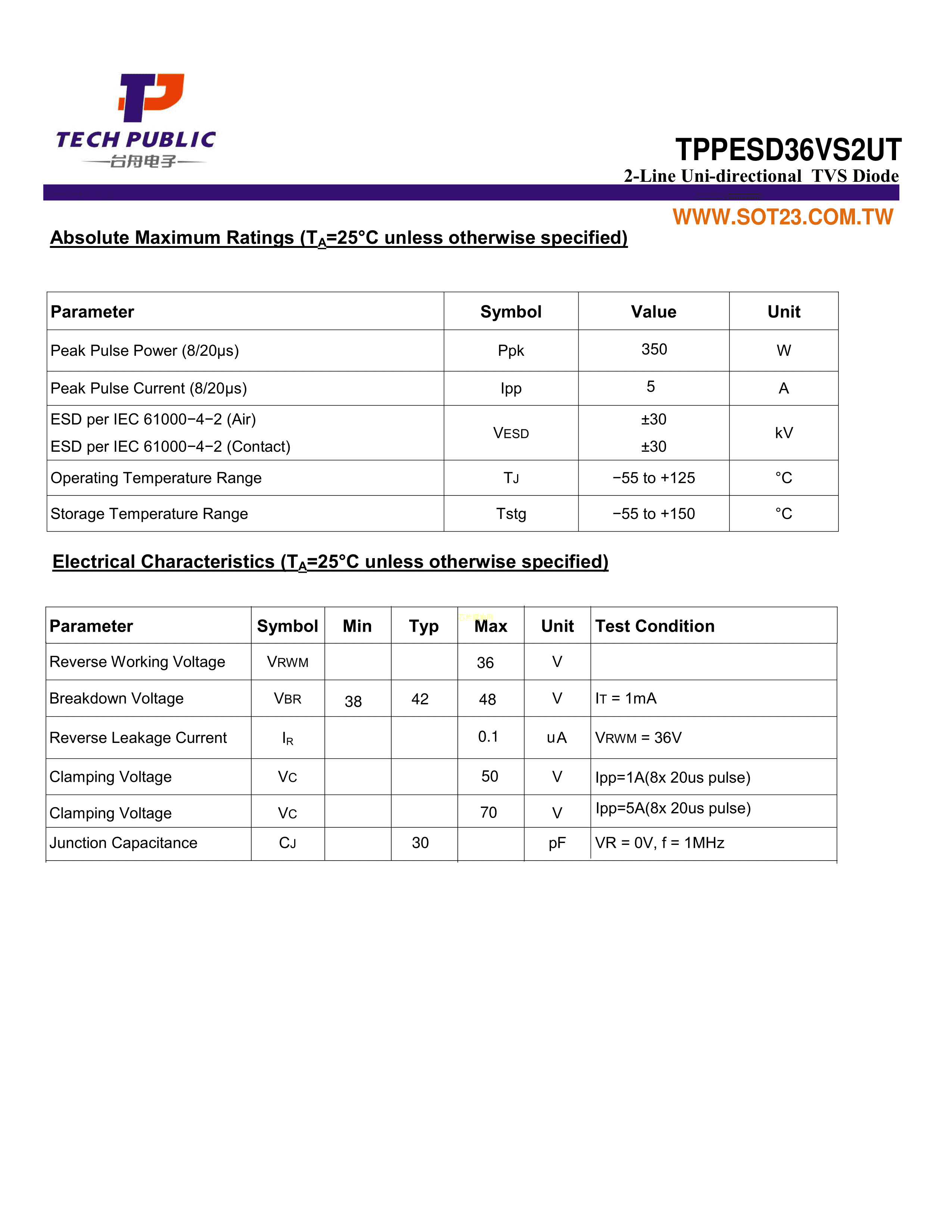 TPPESD36VS2UT数据手册SOT-23-3封装TECHPUBLIC(台舟)PDF规格书,中英文下载