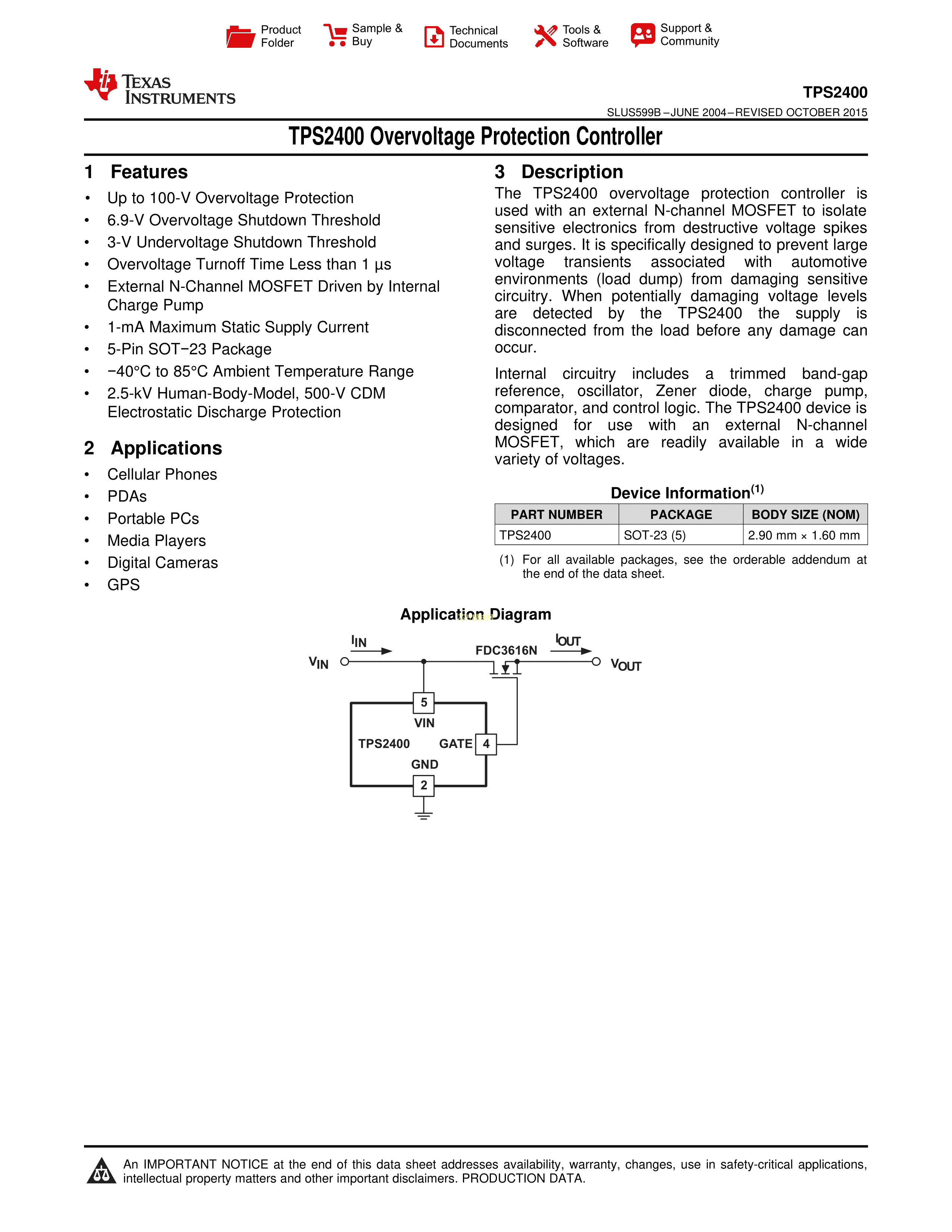 TPS2400DBVR数据手册SOT-23-5封装TI(德州仪器)PDF规格书,中英文下载
