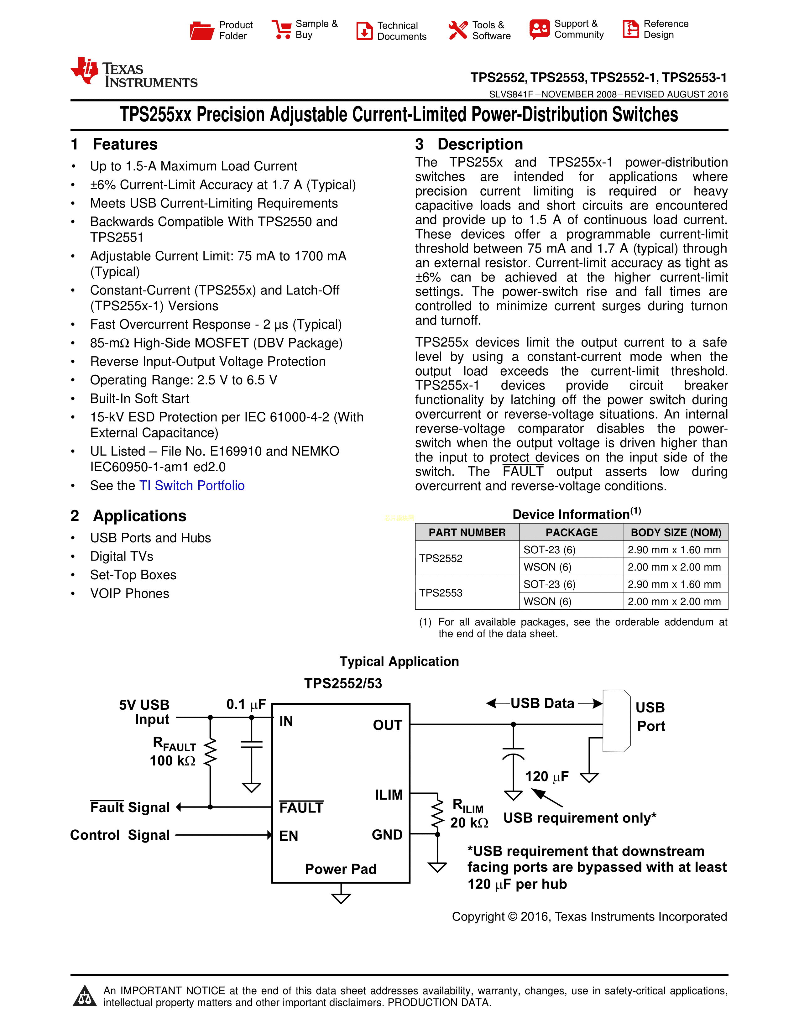 TPS2553DBVR-1数据手册SOT-23-6封装TI(德州仪器)PDF规格书,中英文下载