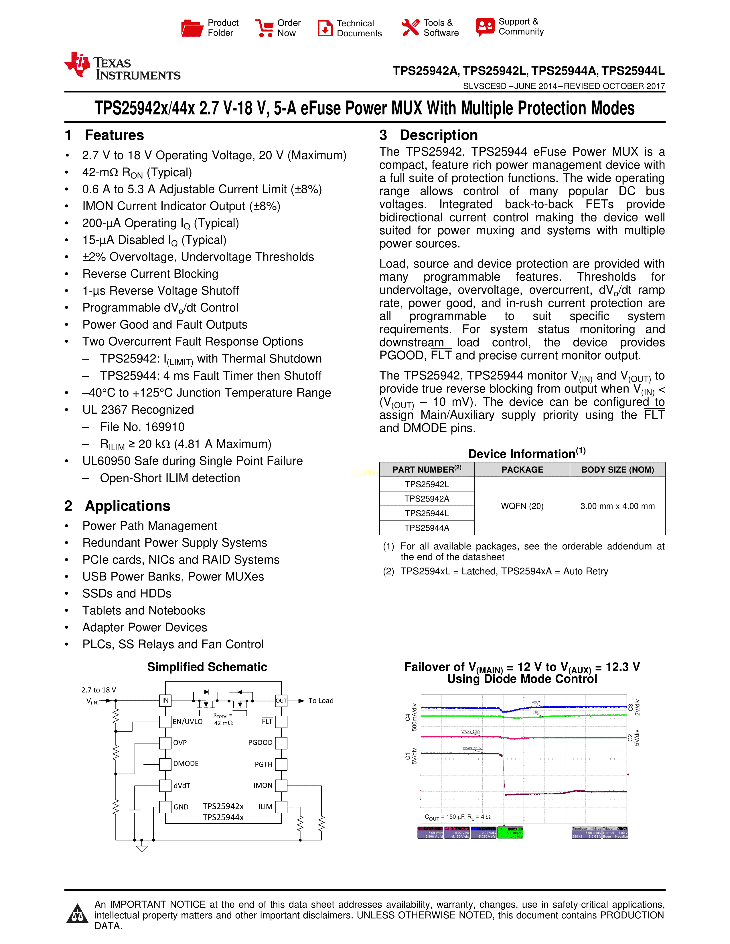 TPS25942ARVCT数据手册QFN-20(3x4)封装TI(德州仪器)PDF规格书,中英文下载