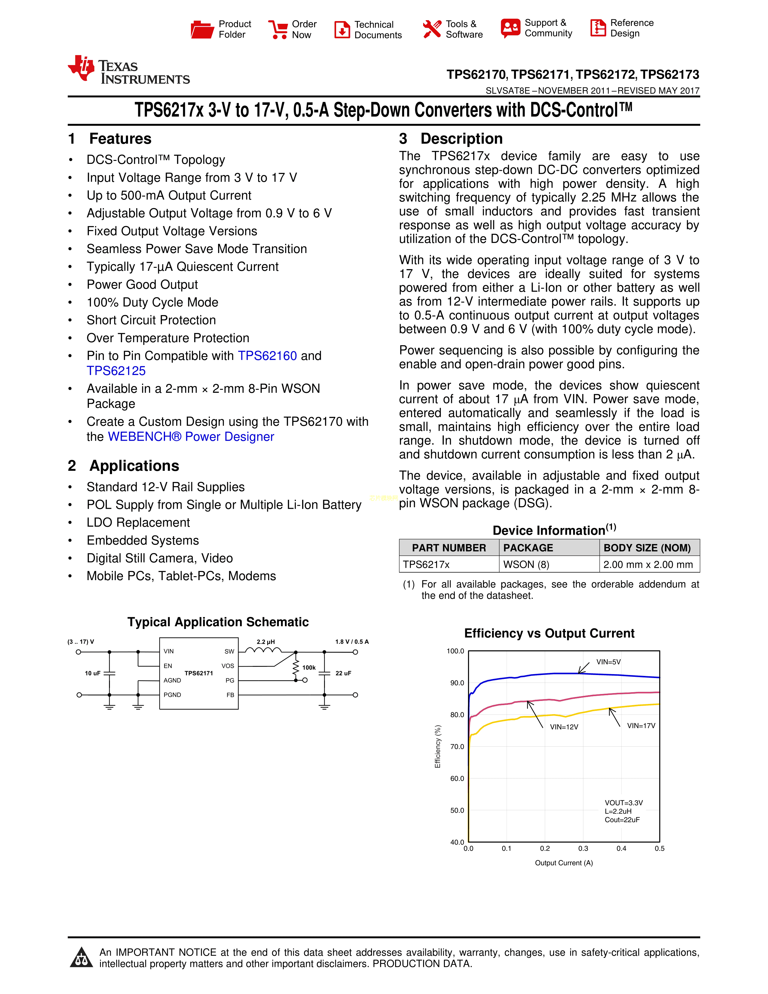 TPS62170DSGR数据手册WFDFN-8封装TI(德州仪器)PDF规格书,中英文下载