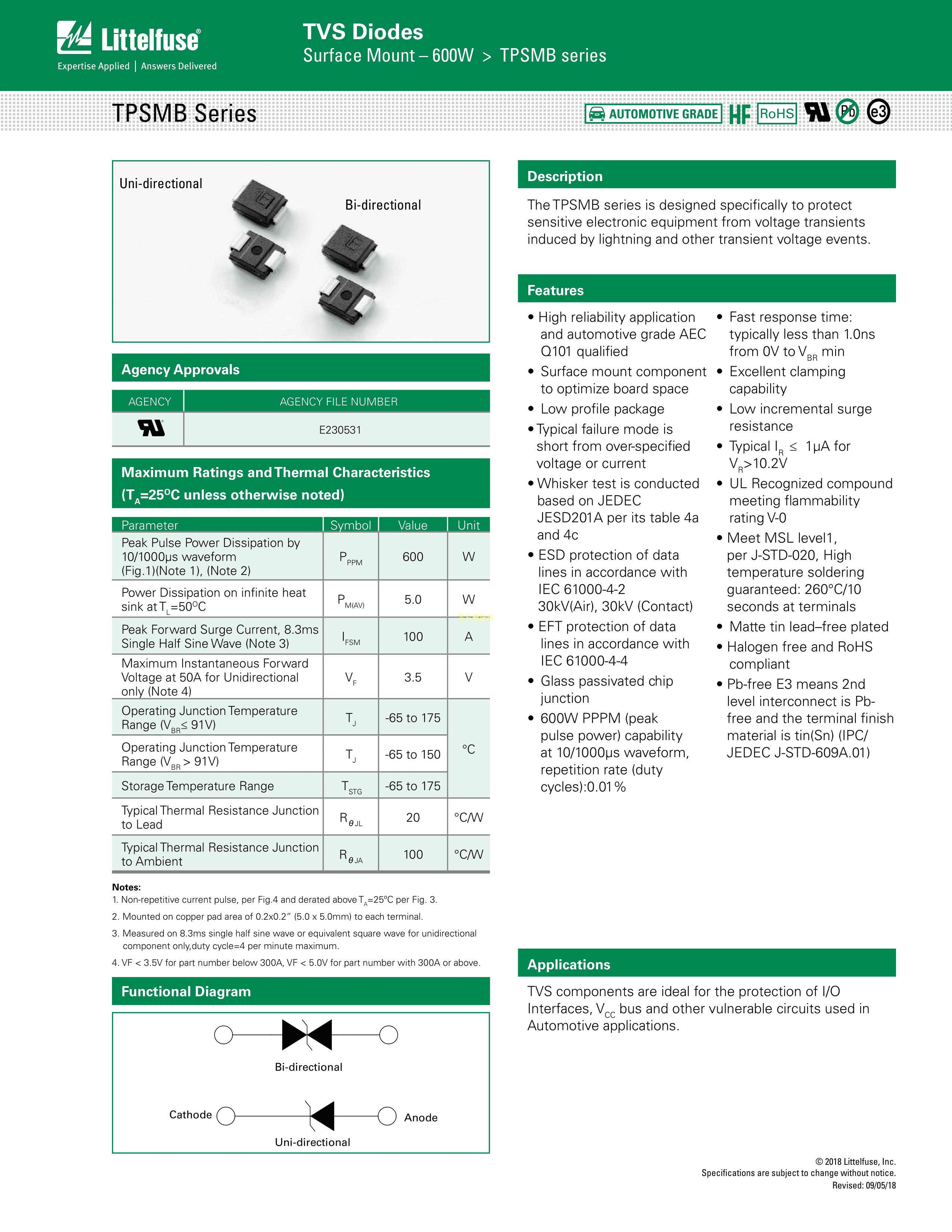 TPSMB27CA数据手册SMB封装Littelfuse(美国力特)PDF规格书,中英文下载