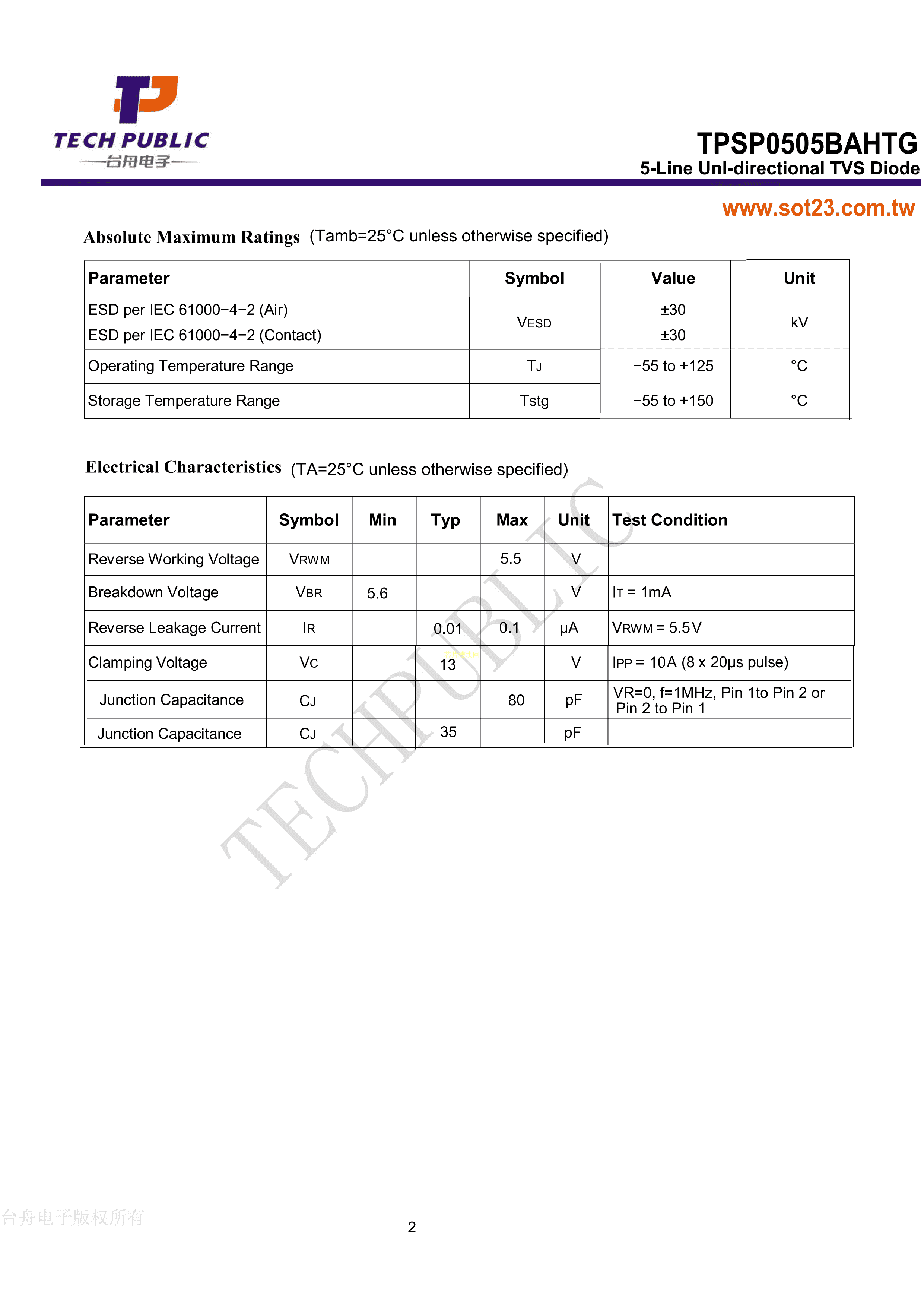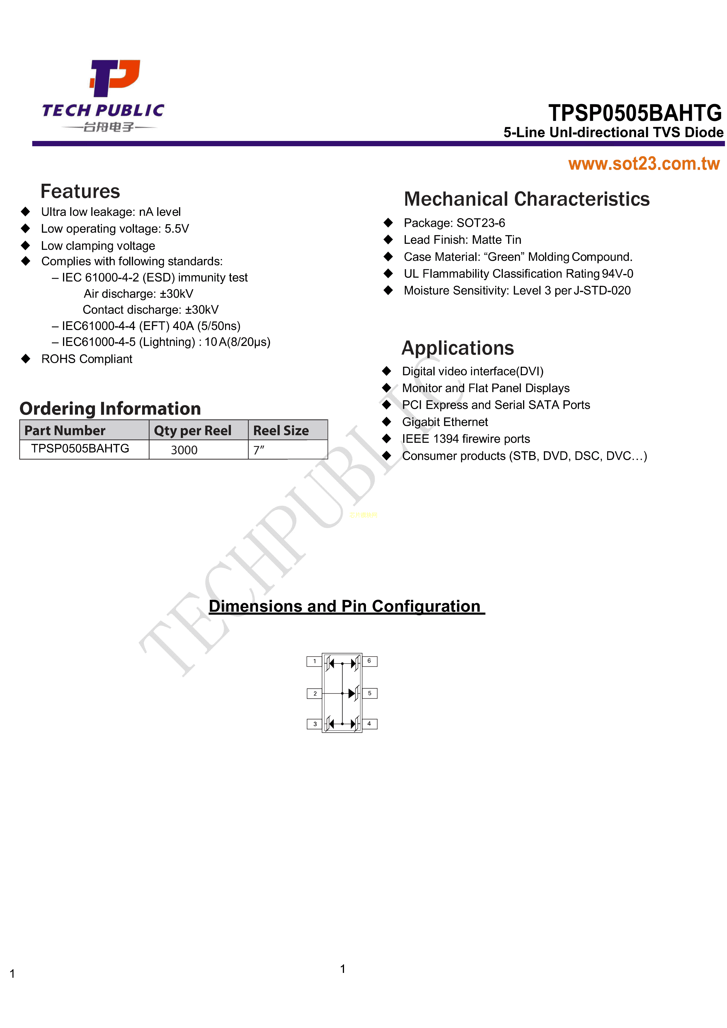 TPSP0505BAHTG数据手册SOT-23-6封装TECHPUBLIC(台舟)PDF规格书,中英文下载