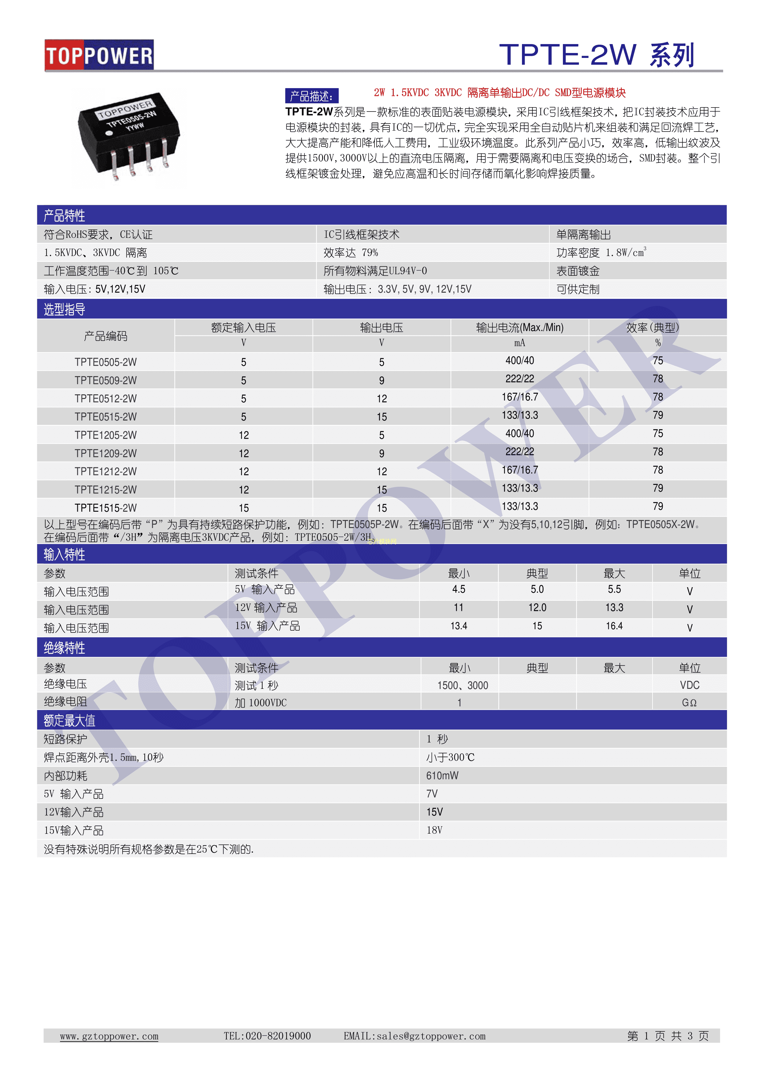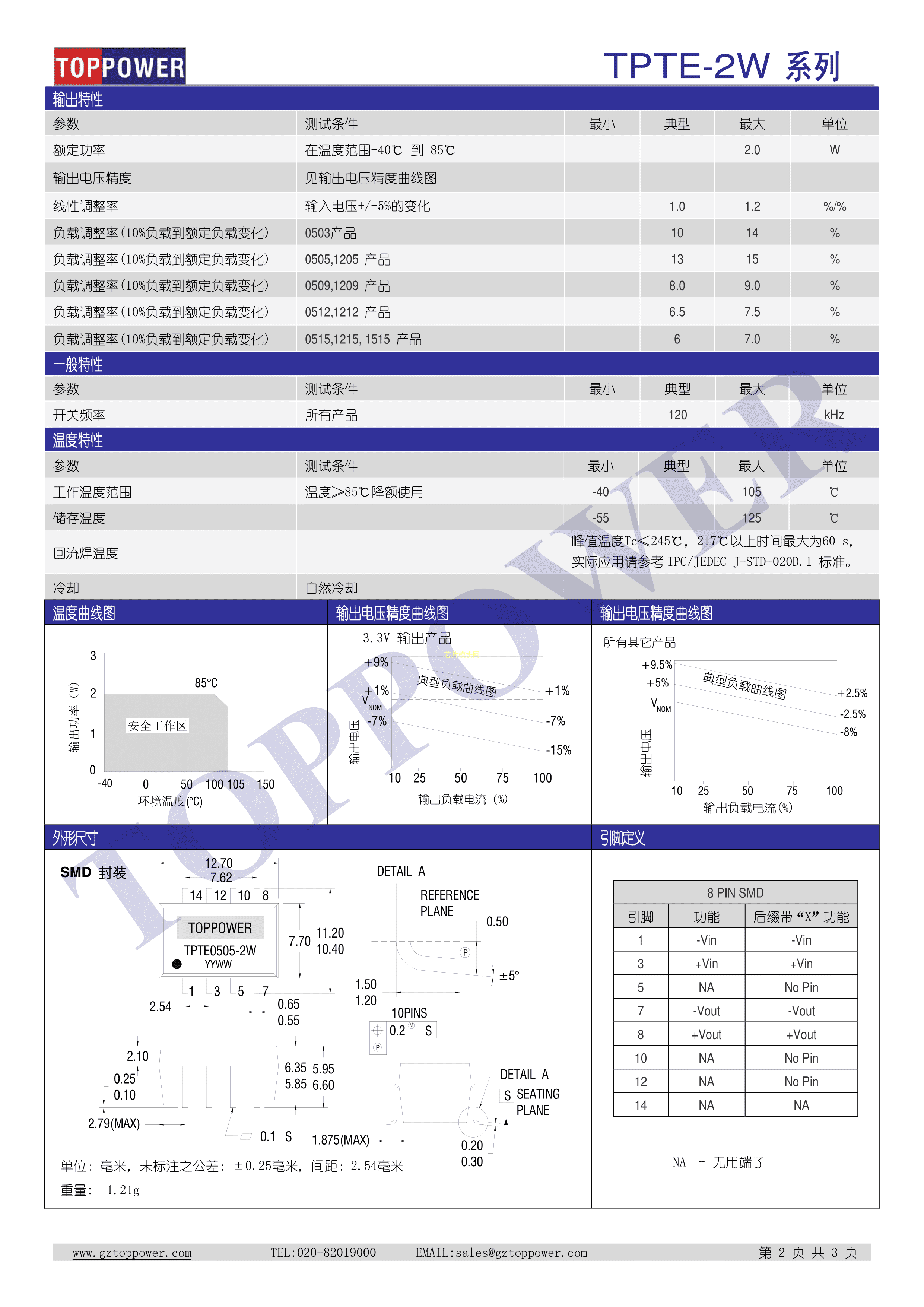 TPTE0505-2W数据手册SMD12.7×7.7×6.1封装TOPPOWER(顶源)PDF规格书