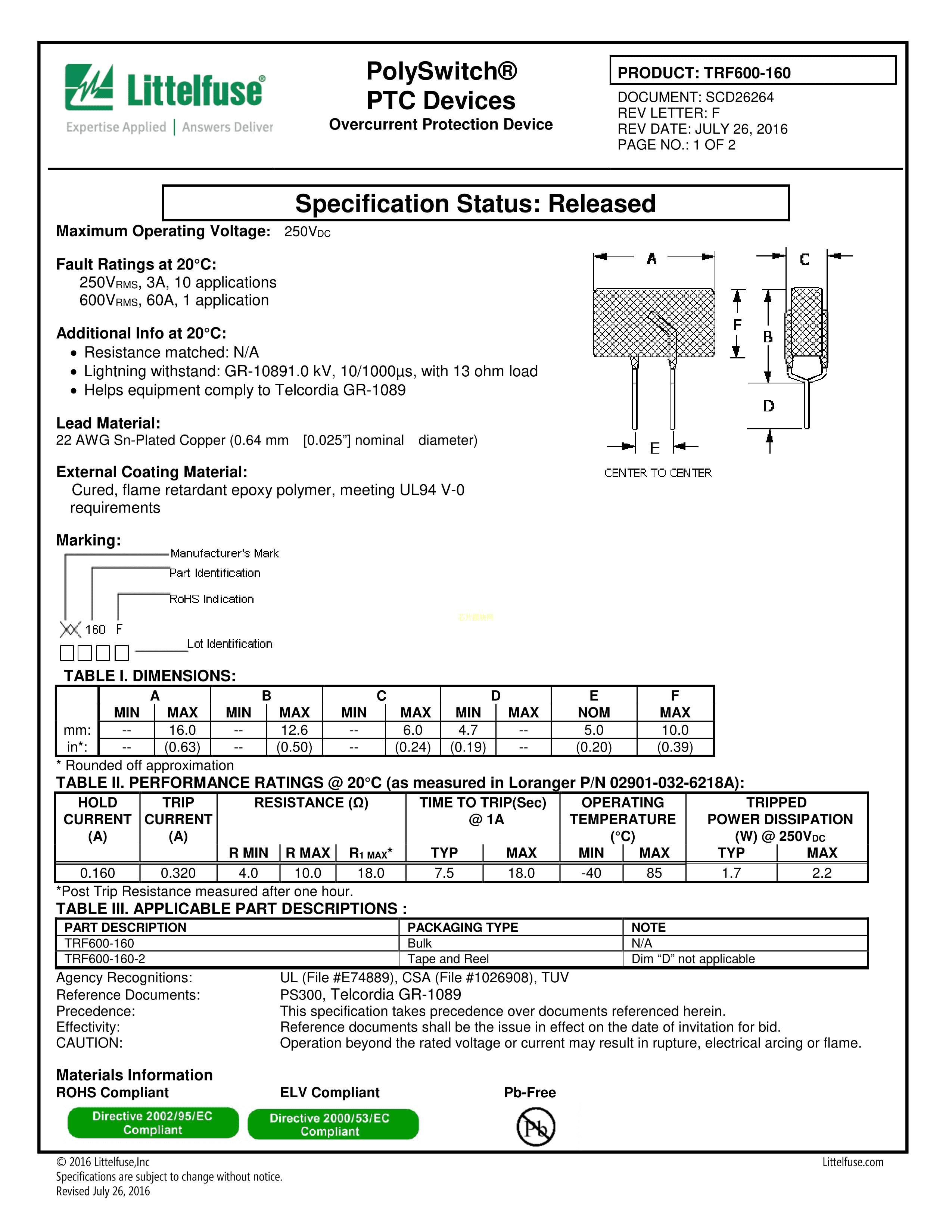 TRF600-160-2数据手册径向引线封装Littelfuse(美国力特)PDF规格书,中英文下载