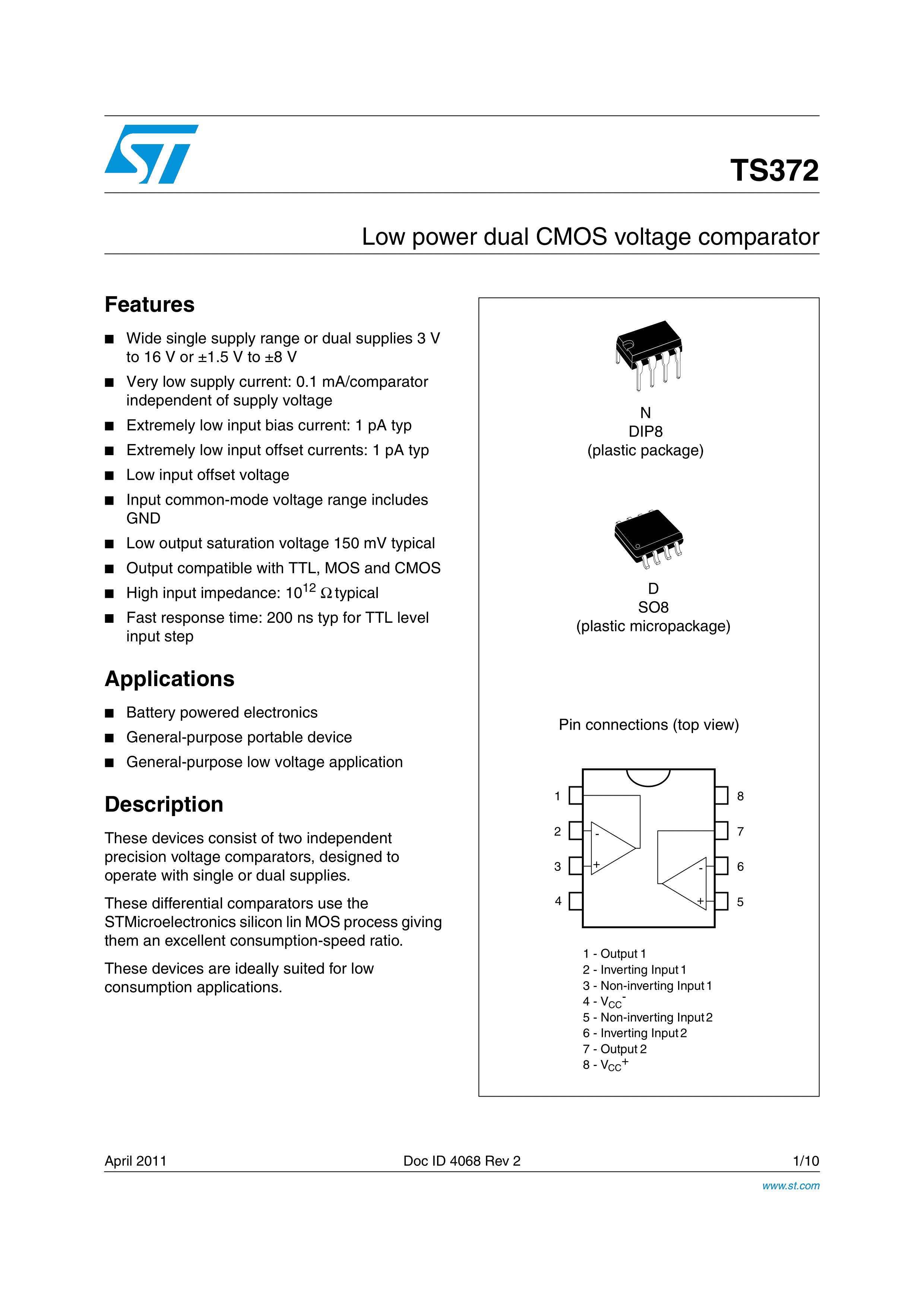 TS372IDT数据手册SOIC-8_150mil封装ST(意法半导体)PDF规格书,中英文下载