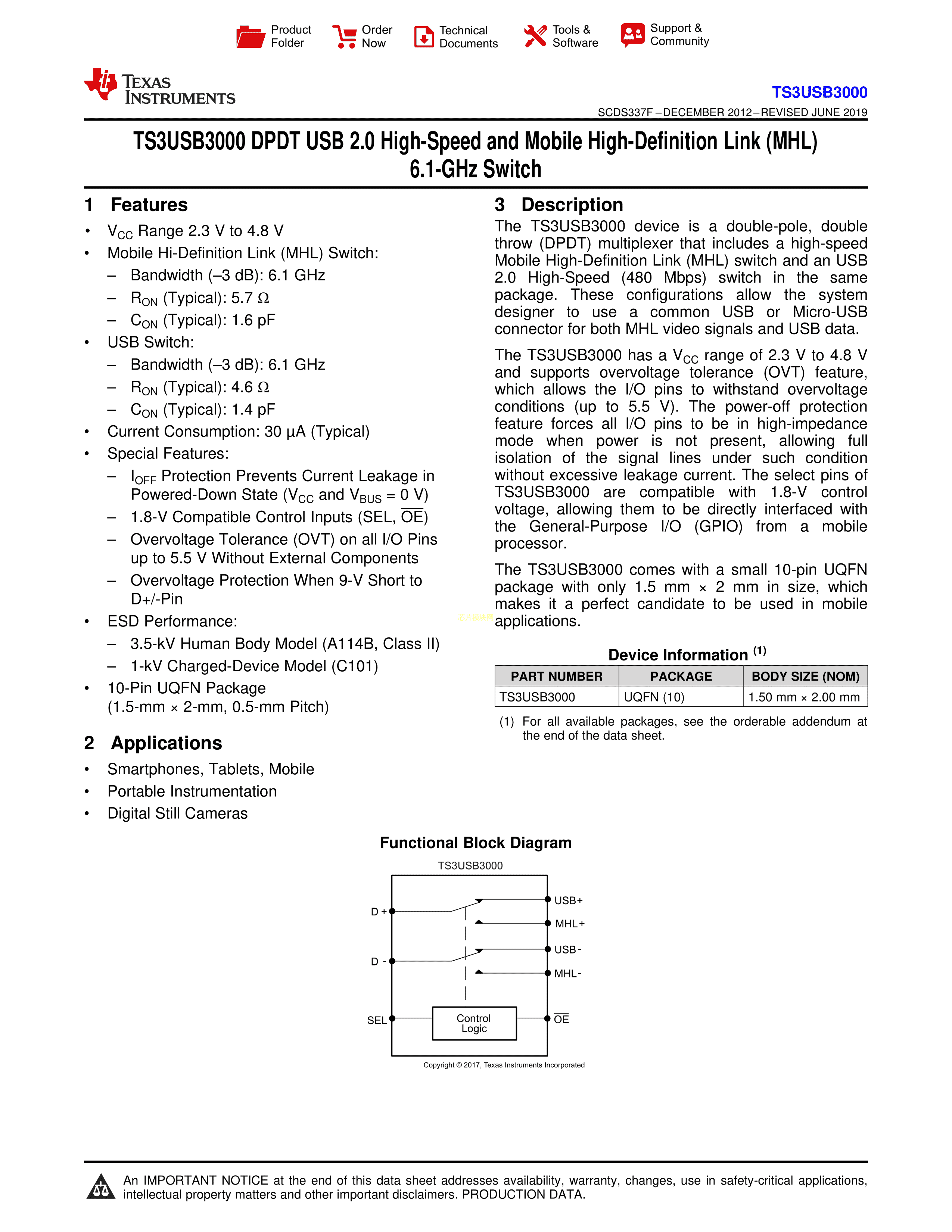 TS3USB3000MRSER数据手册UQFN-10封装TI(德州仪器)PDF规格书,中英文下载