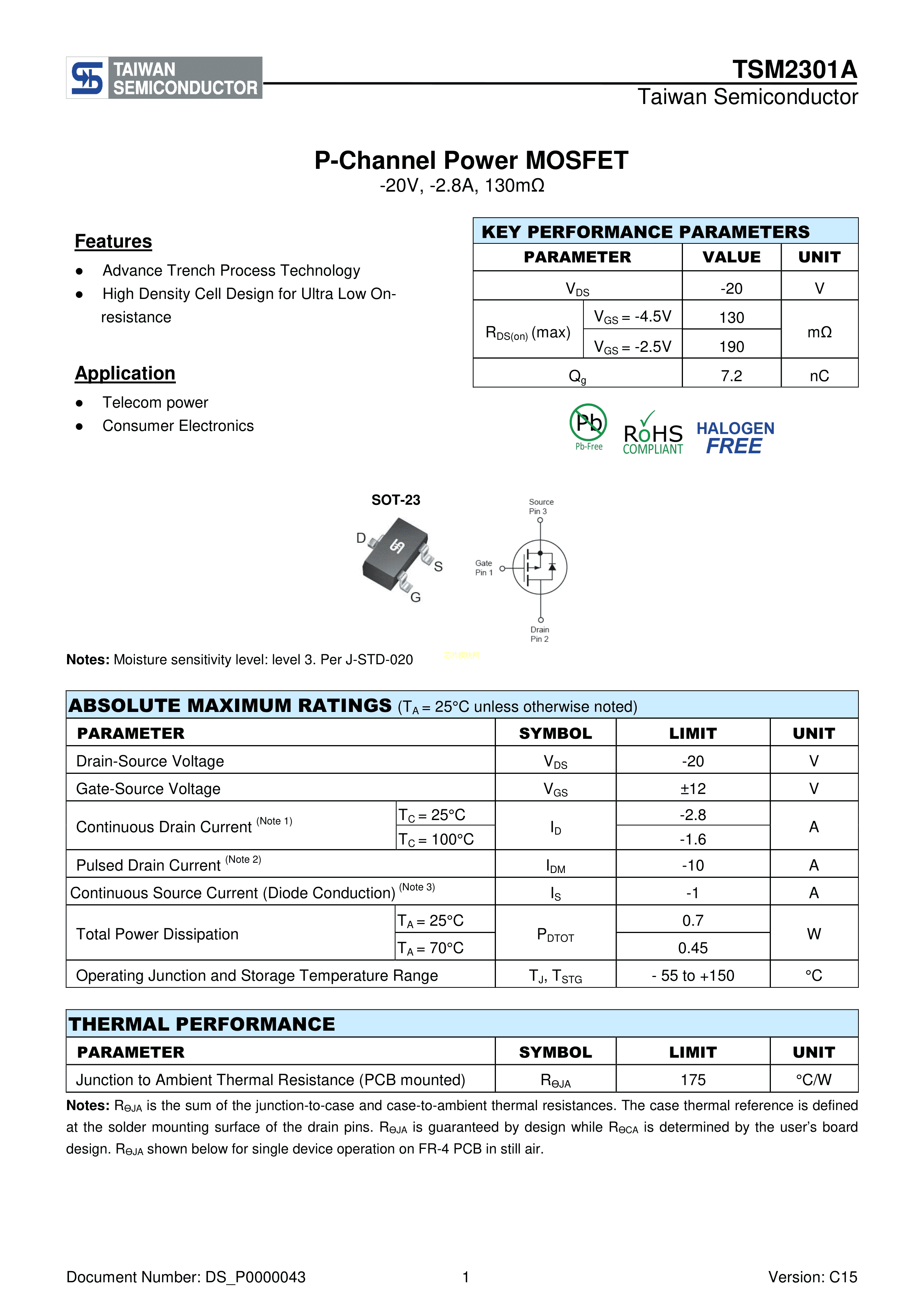 TSM2301ACXRFG数据手册SOT-23封装TaiwanSemiconductor(台湾半导体)PDF规格书,中英文下载