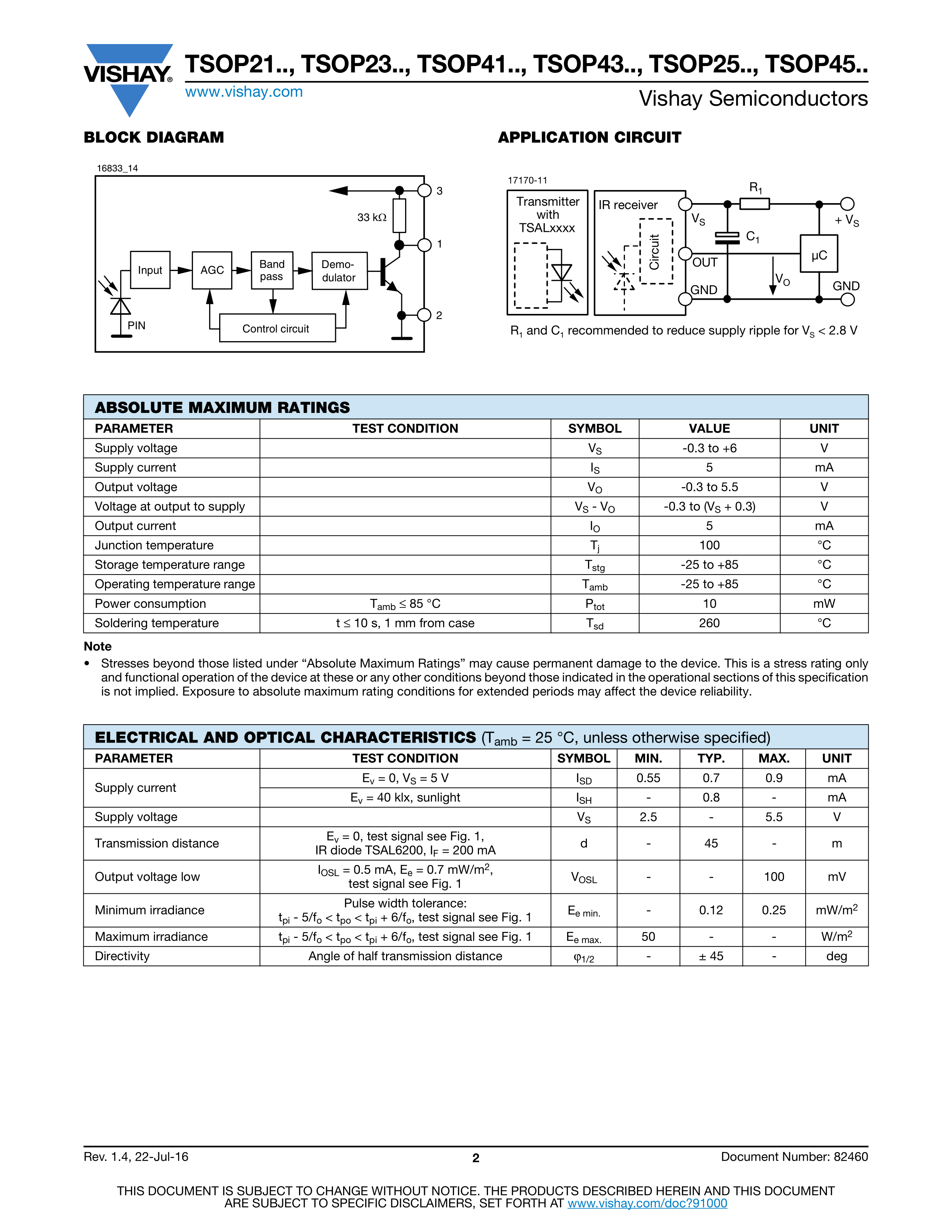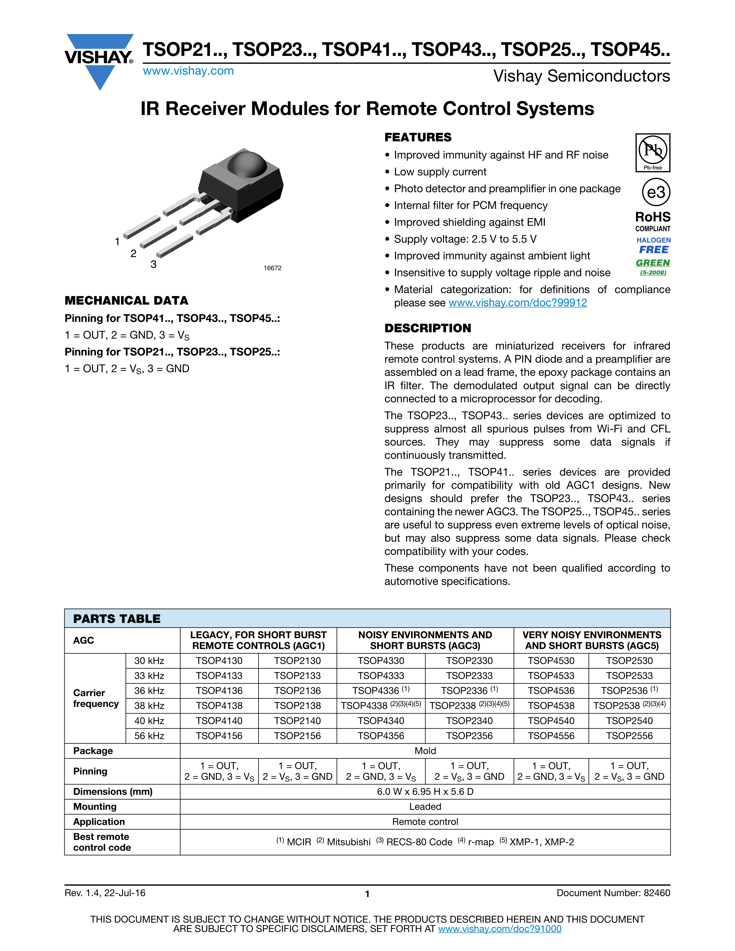 TSOP4138数据手册Through Hole封装VISHAY(威世)PDF规格书,中英文下载