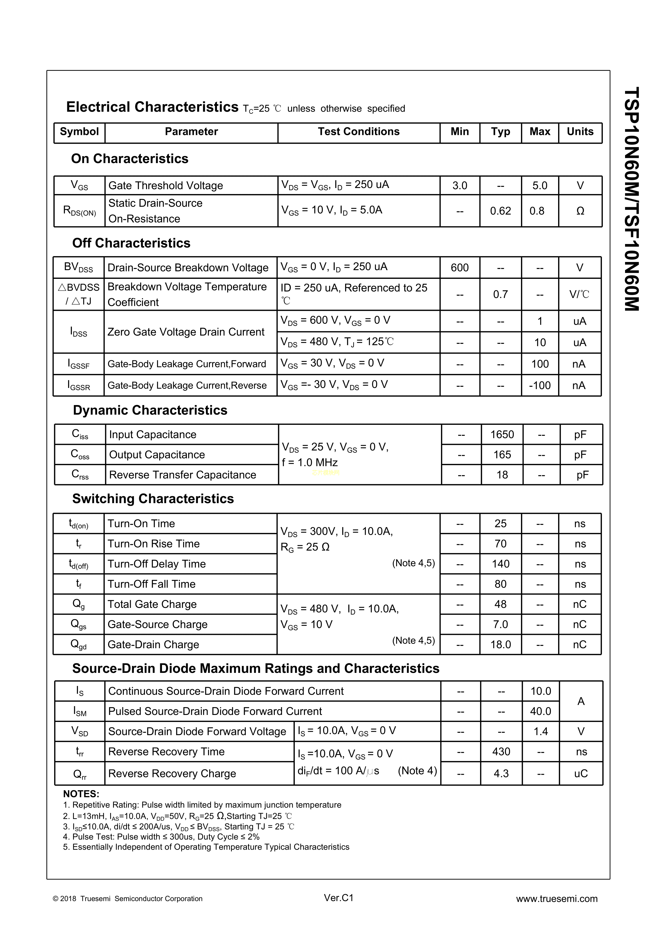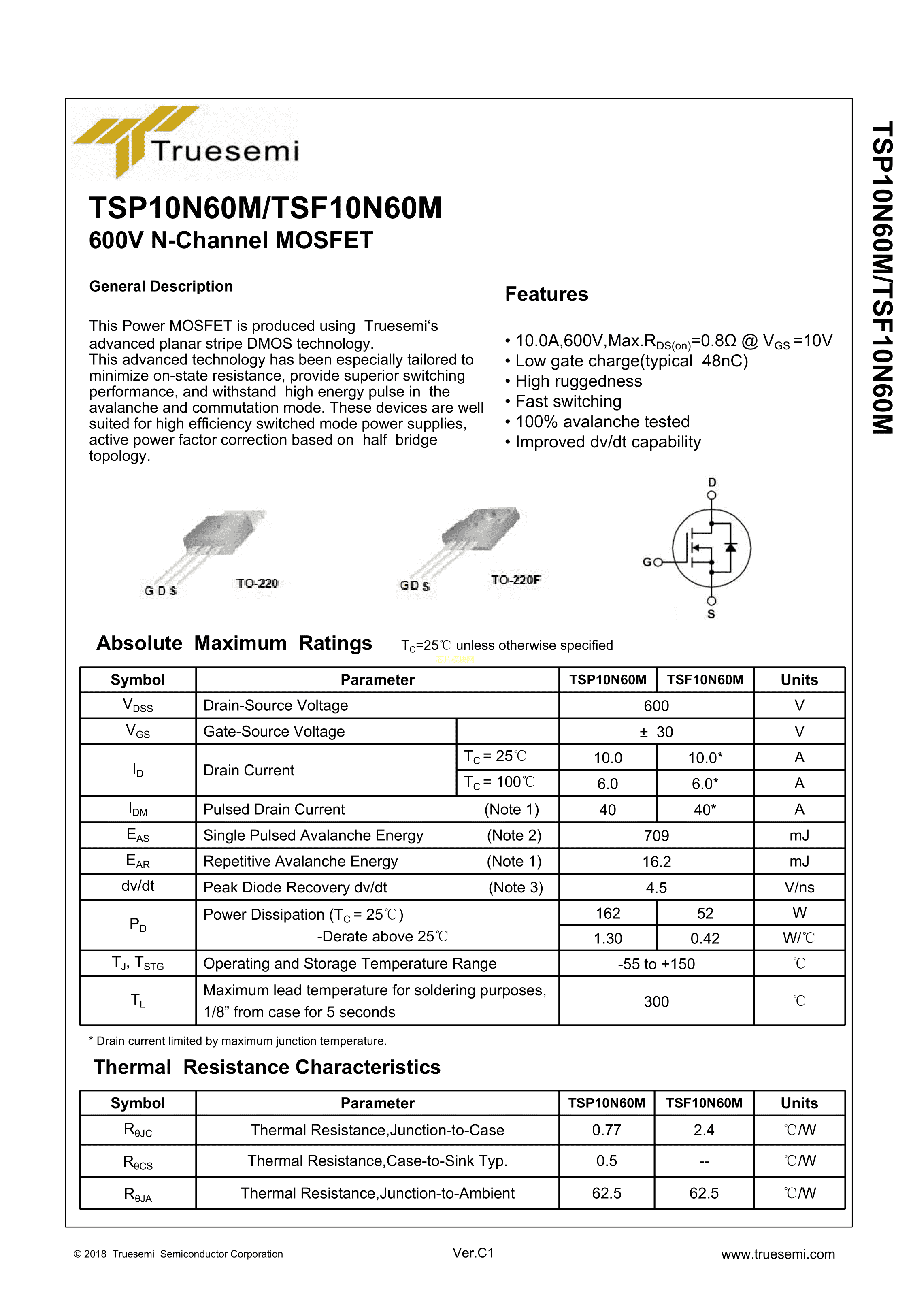 TSP10N60M数据手册TO-220封装Truesemi(信安)PDF规格书,中英文下载