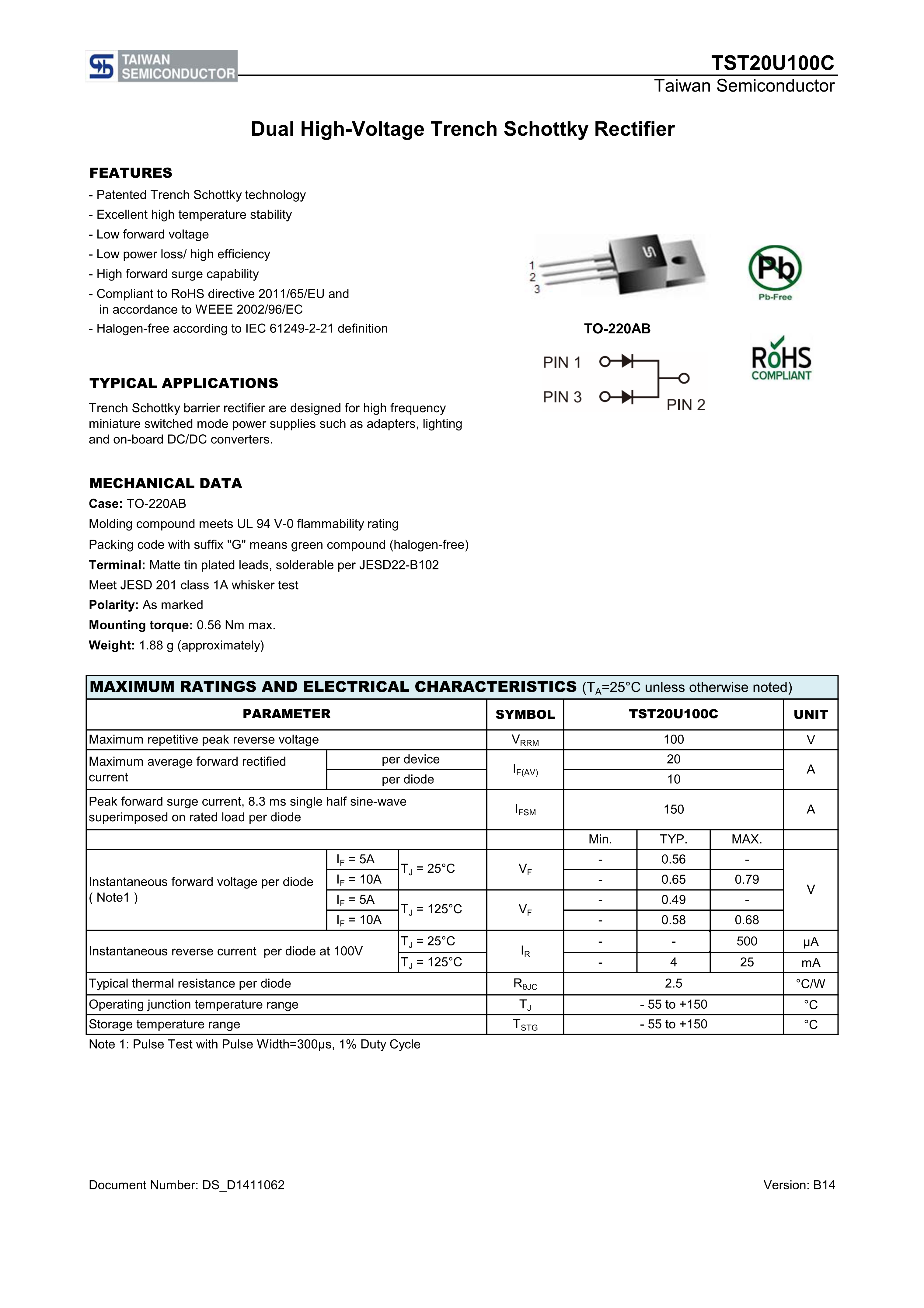TST20U100C C0G数据手册TO-220AB封装Taiwan Semiconductor(台