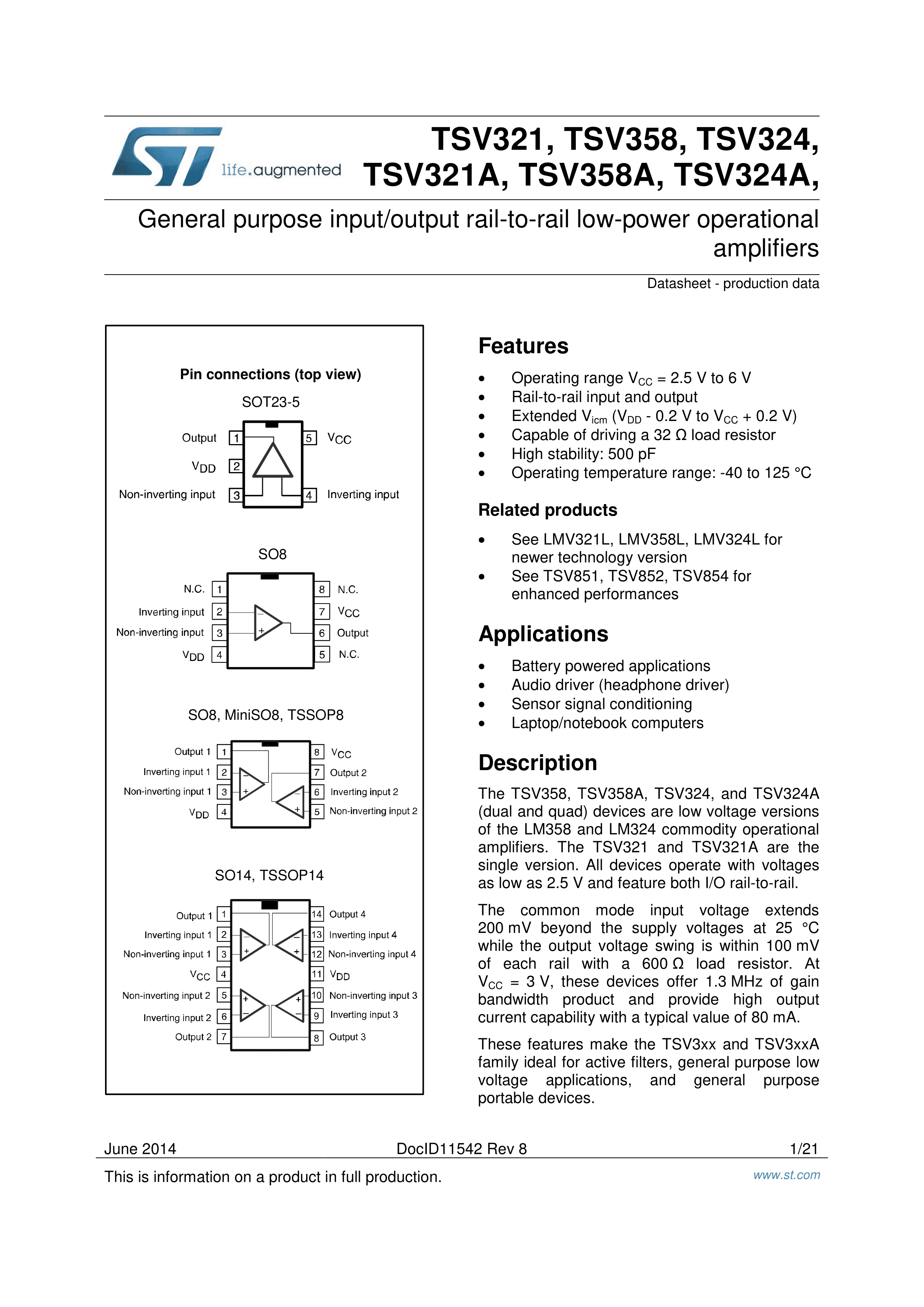 TSV358AIST数据手册MiniSO-8封装ST(意法半导体)PDF规格书,中英文下载