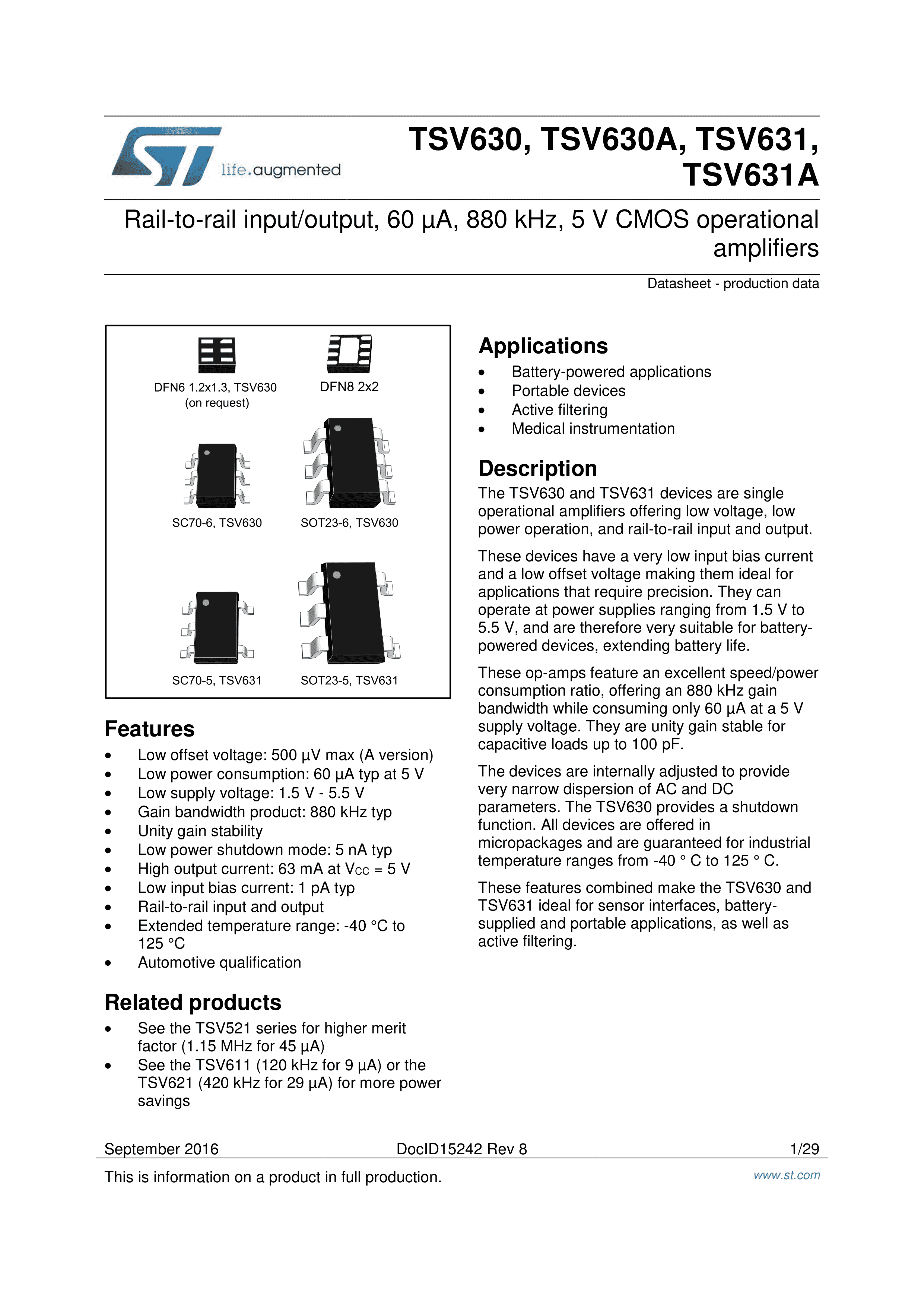 TSV631AILT数据手册SOT-23-5封装ST(意法半导体)PDF规格书,中英文下载
