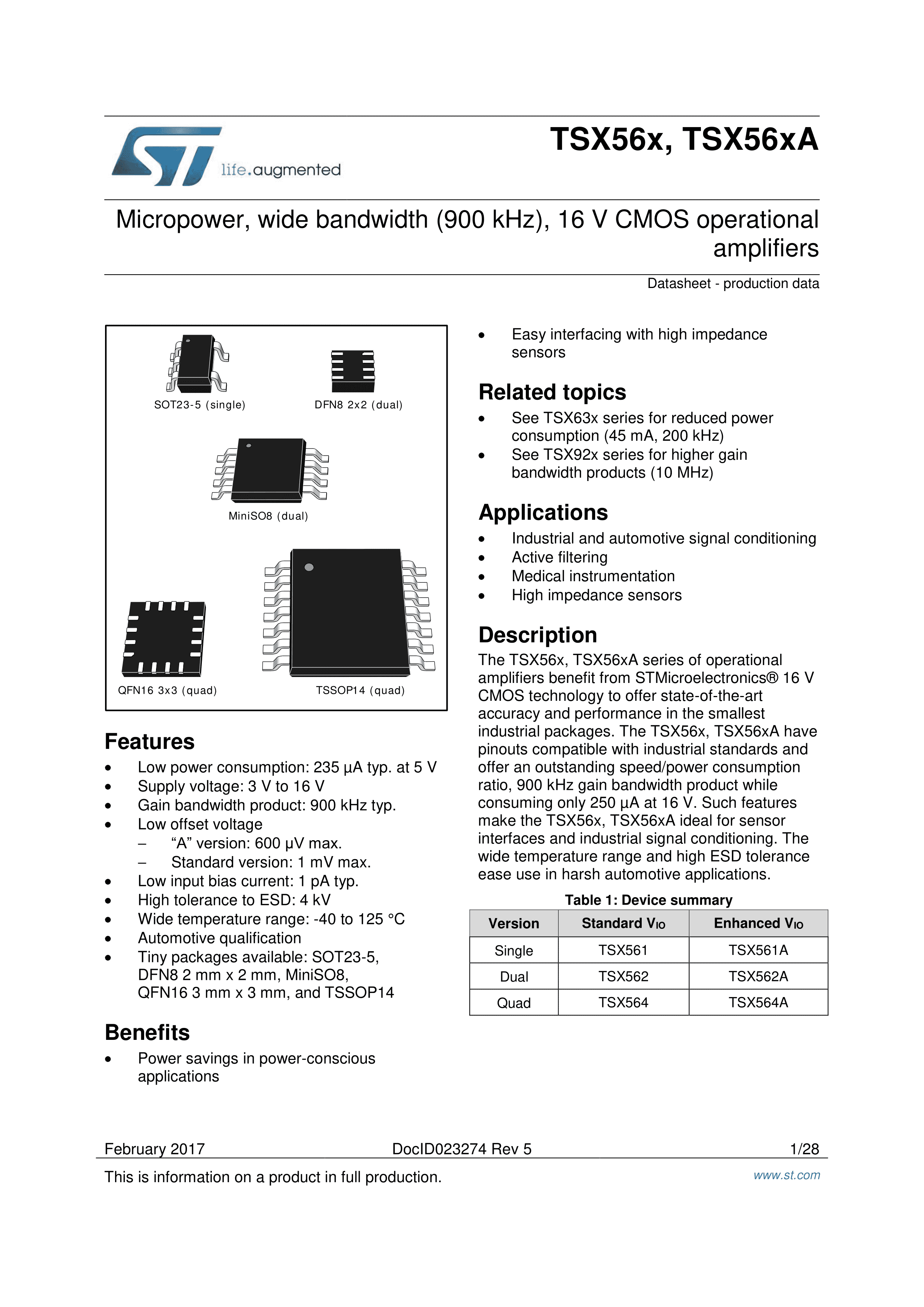 TSX561AILT数据手册SOT-23-5封装ST(意法半导体)PDF规格书,中英文下载