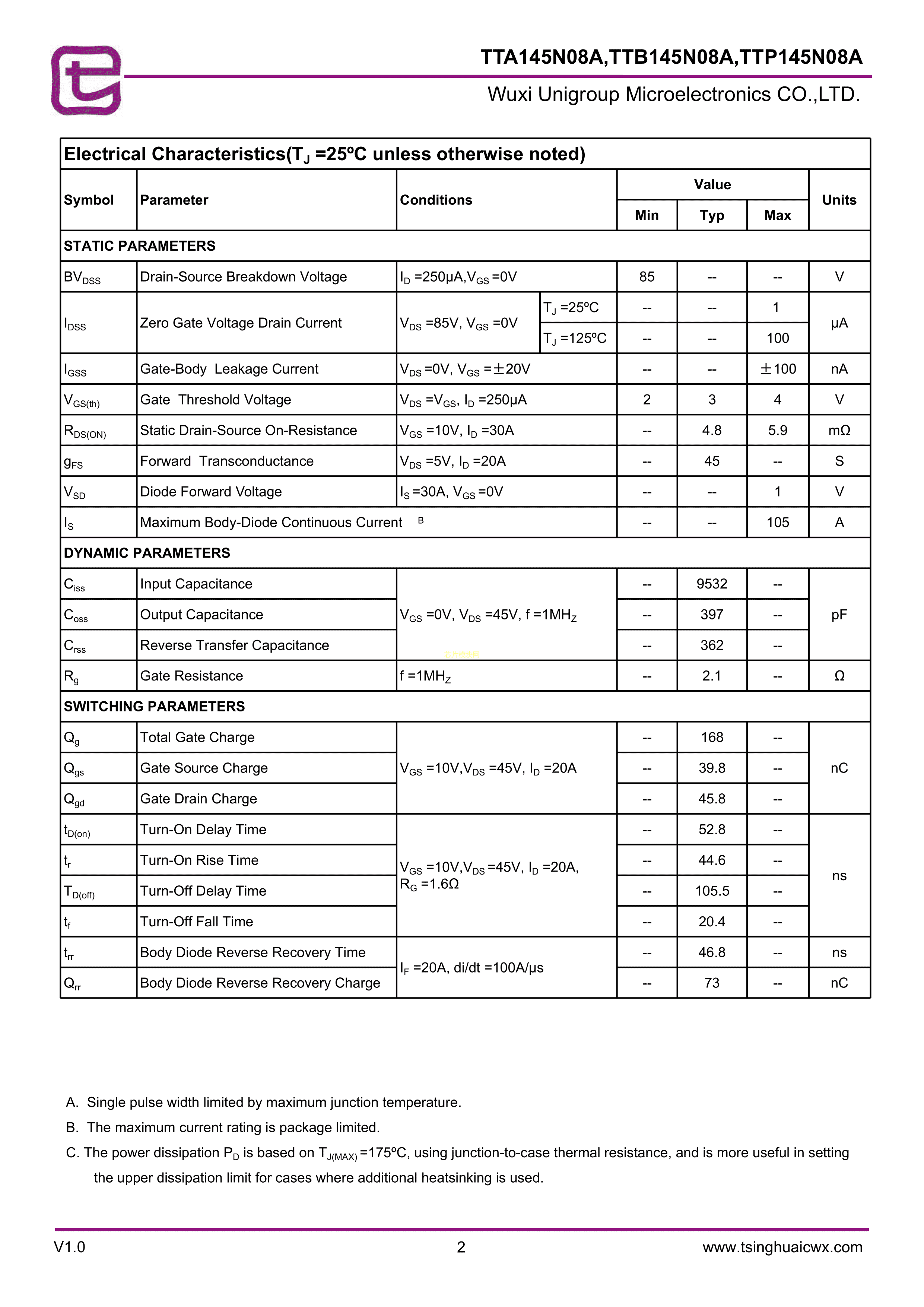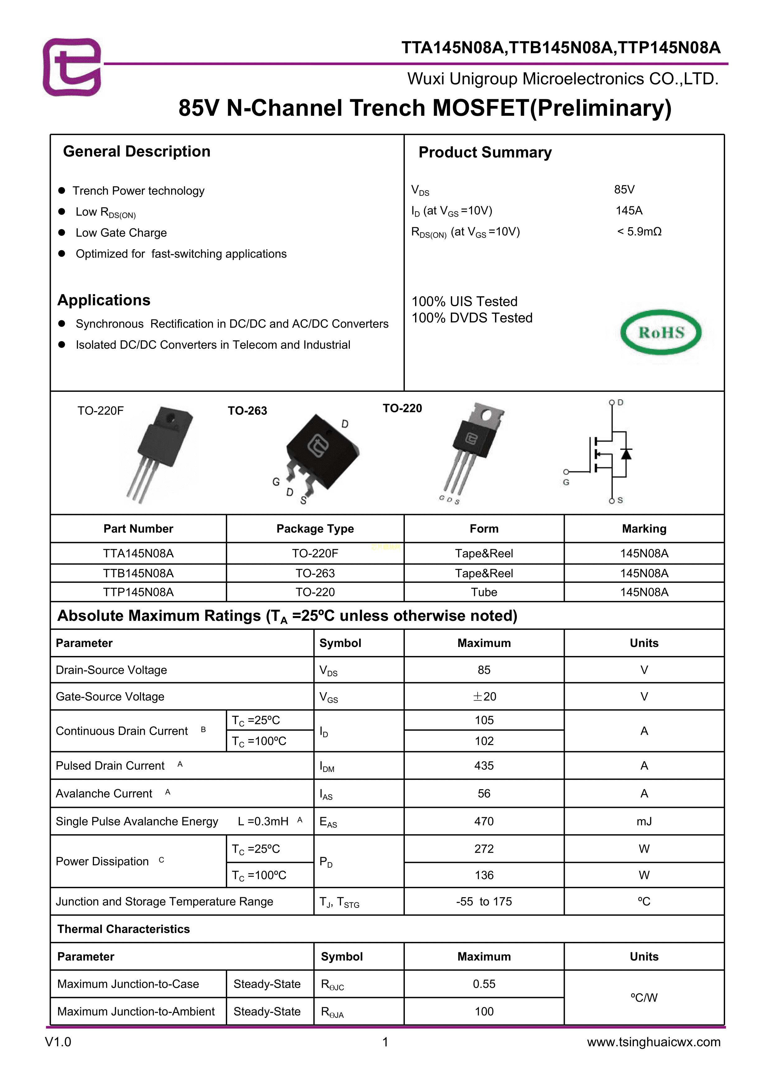 TTP145N08A数据手册TO-220封装无锡紫光微PDF规格书,中英文下载