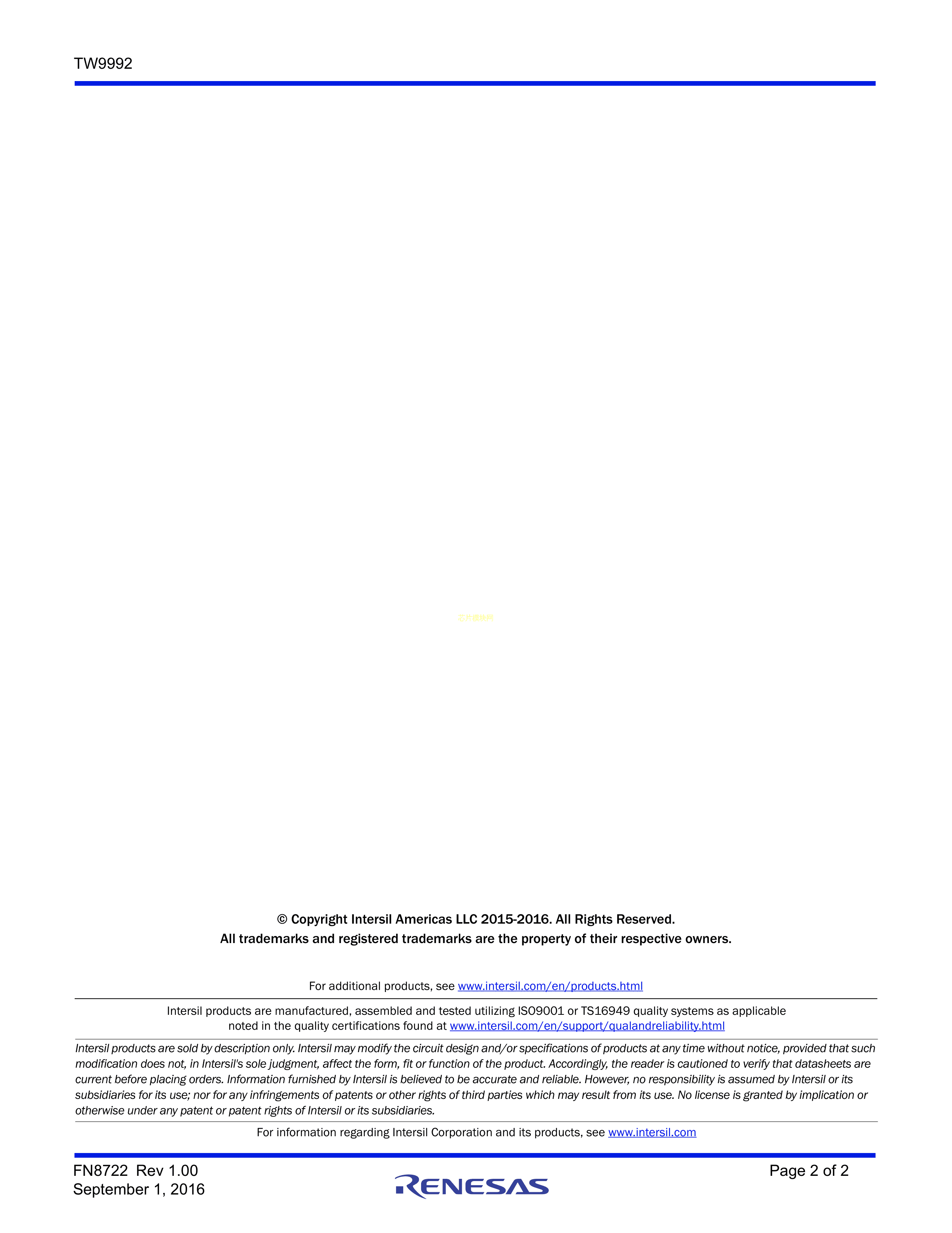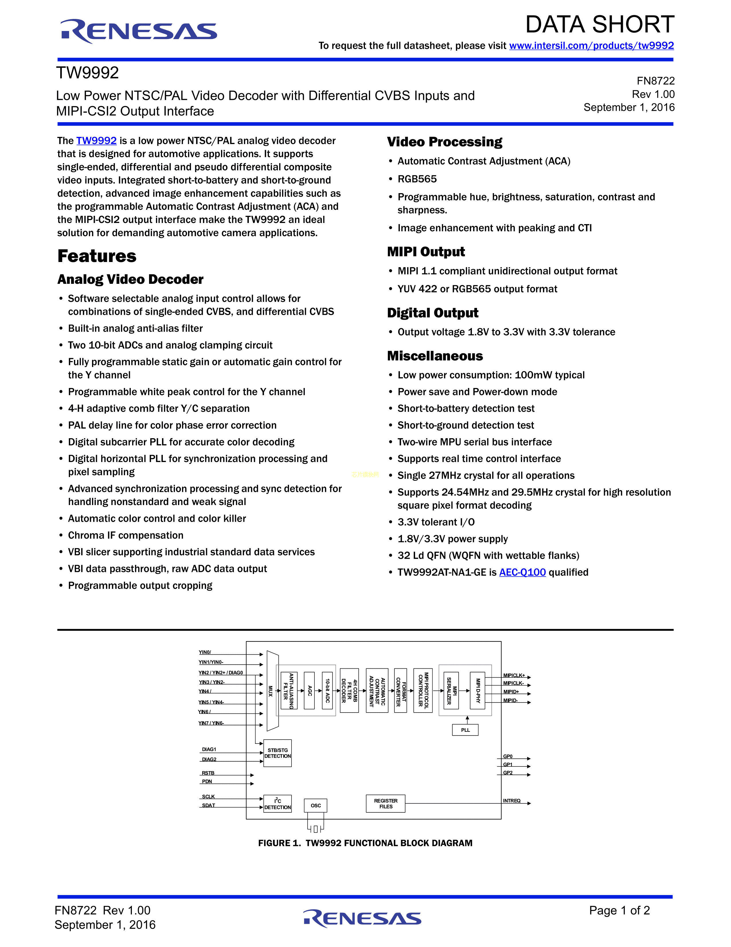 TW9992-NA1-CE数据手册QFN-32(5x5)封装RENESAS(瑞萨)-IDTPDF规格